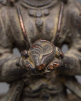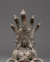 This copper sculpture of the Mythical Serpent Deity Naag Kanya will bring ancient mysticism and protective force into your sacred place. Hindu mythology says that Naag Kanya, the goddess of the snake maiden, has both heavenly feminine might and serpent intelligence. This elaborately made statue shows the goddess sitting in a meditation position, with her snake hoods rising gracefully above her head. This represents spiritual awakening, change, and deep protection.