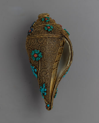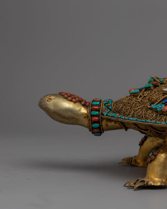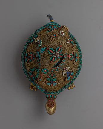 The painstakingly detailed inlay of turquoise and coral stones, infusing it with vibrant colors and profound symbolism, truly sets this piece apart. The turtle, which represents longevity and wisdom, cradles the conch shell, which represents divine sound and spiritual awakening. This harmonious combination of symbolism adds a profound layer of spiritual significance to the piece, elevating it to the realm of divine beauty.