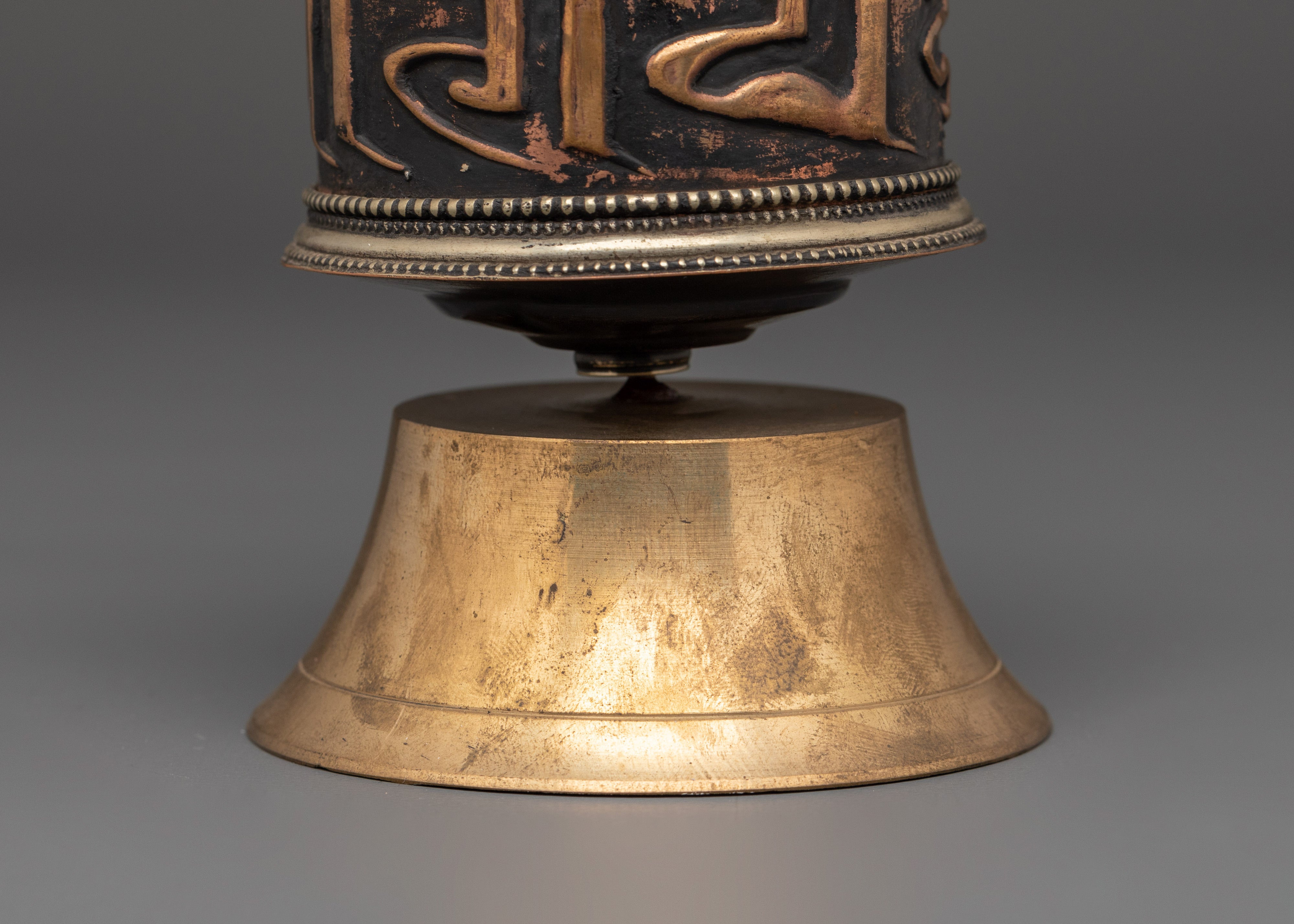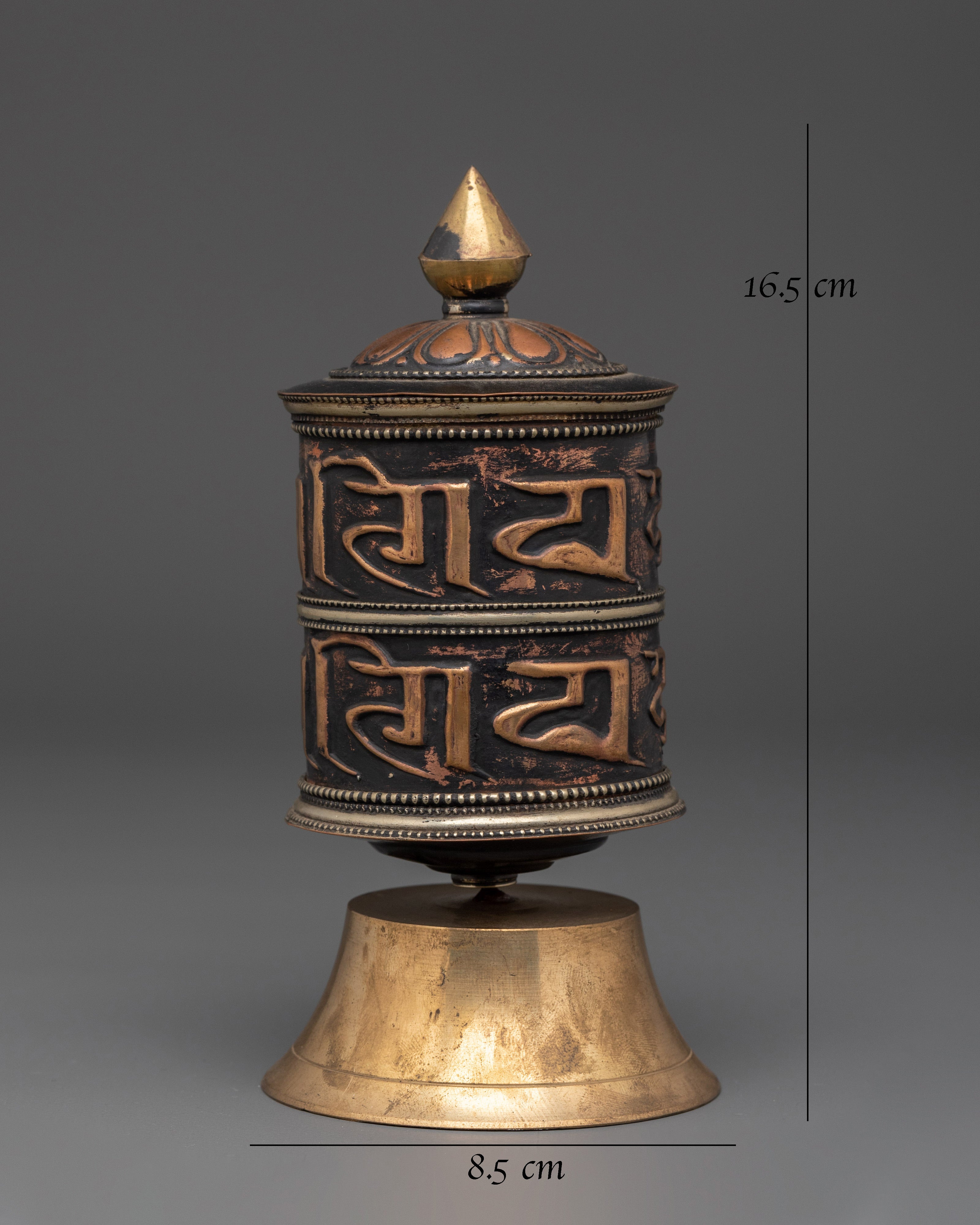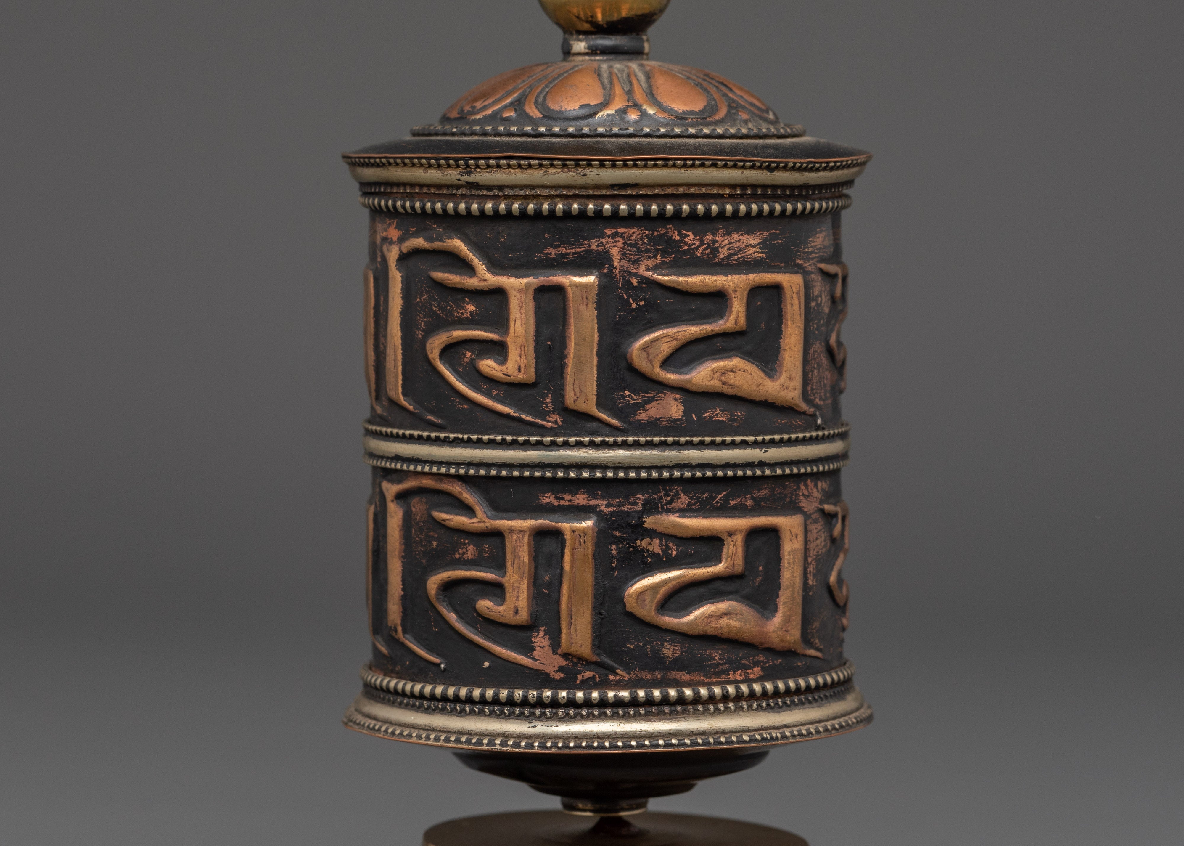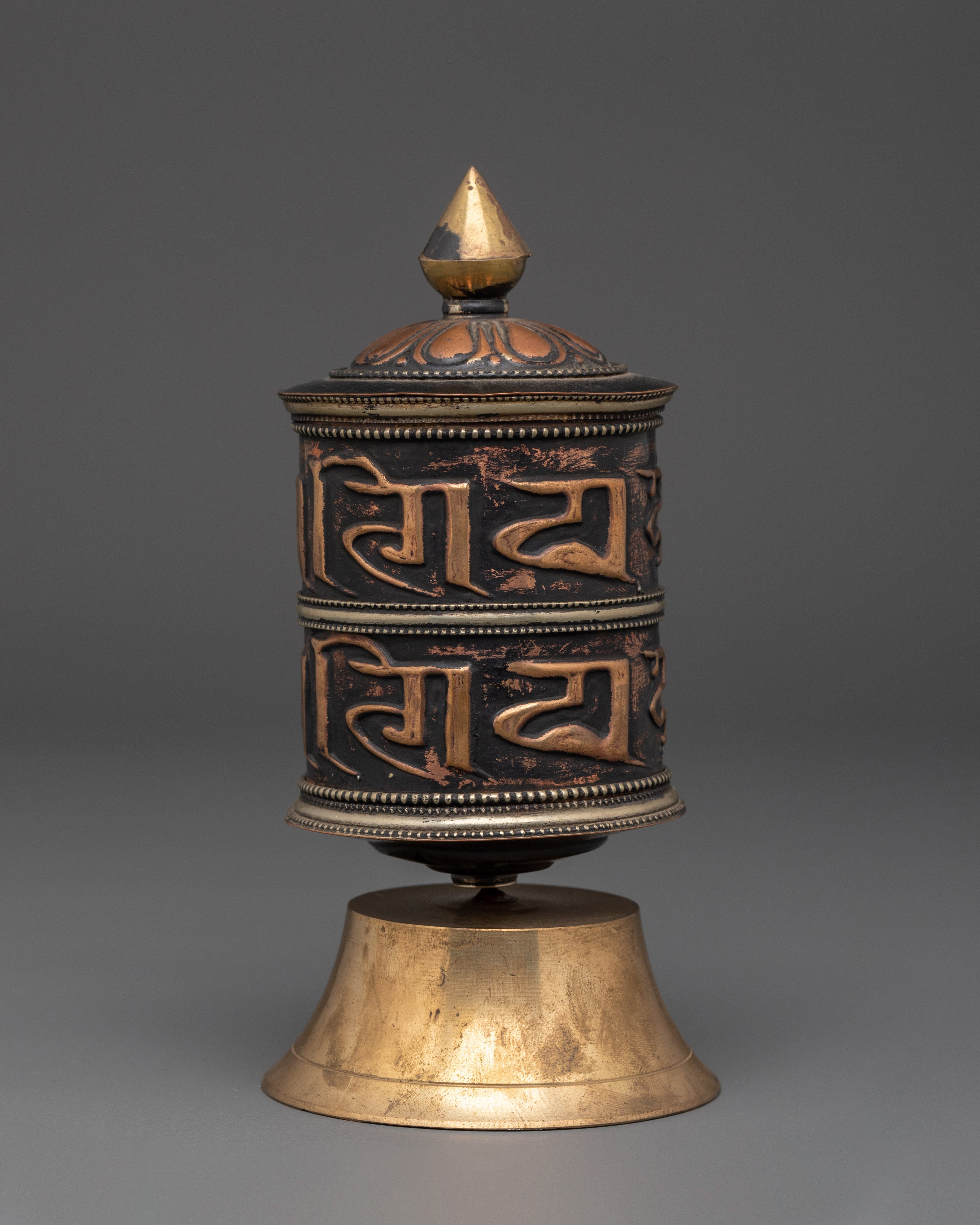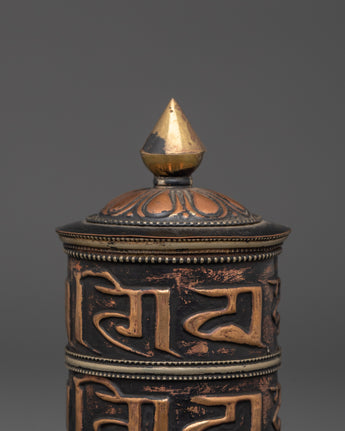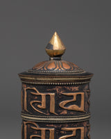 The intricate craftsmanship exemplifies the eternal artistry of Himalayan metallurgy. The prayer wheel's bold, raised inscriptions and copper texture give it a rich, spiritual presence, while the brass cap and base symbolize enlightenment and stability. The contrast between warm copper and polished brass adds to its spiritual appeal, making it more than just a meditation tool but also a stunning depiction of Buddhist devotion. Designed to spin smoothly, the wheel represents the never-ending cycle of life and karma, reminding practitioners of mindfulness and compassion at every turn.