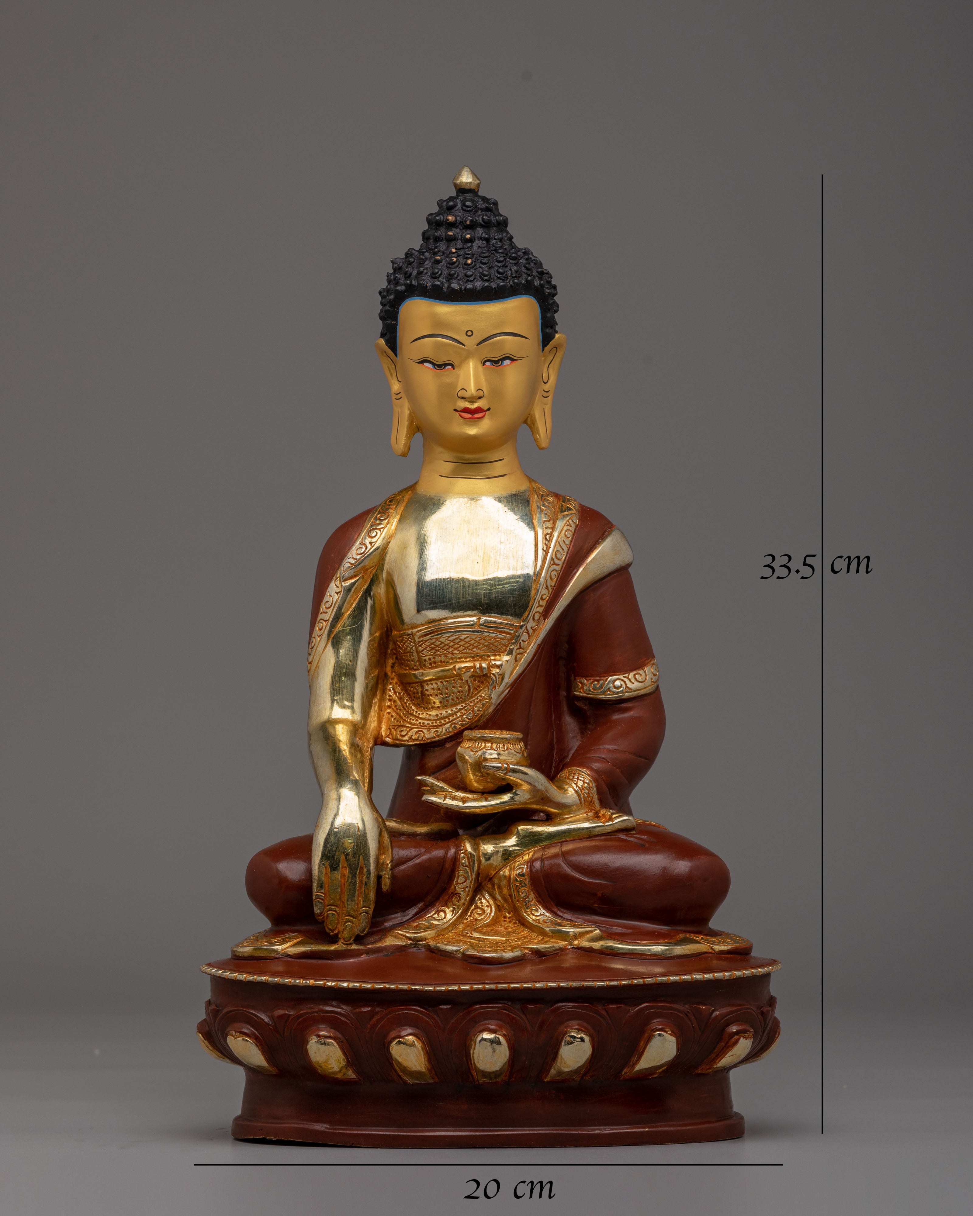 The Handmade Buddha Shakyamuni Nepal Statue is a beautifully crafted representation of the Enlightened One, handcrafted in Nepal using traditional techniques. Standing at 33.5 cm tall and weighing 2.5 kg, this statue features a copper body with a radiant 24K gold plating that enhances the serene features of Shakyamuni Buddha. The statue’s intricate design captures the Buddha's peaceful expression and meditative posture, symbolizing wisdom, compassion, and spiritual enlightenment. The use of acrylic colors adds life and depth to the piece, bringing out the delicate details of his robes and other features.