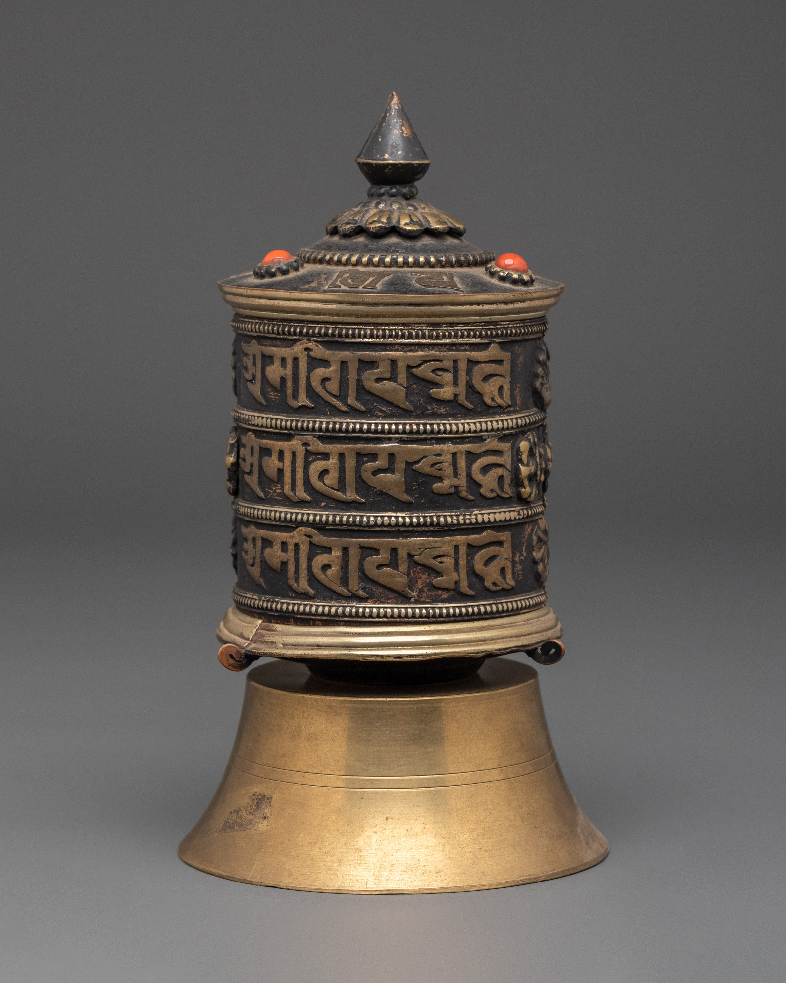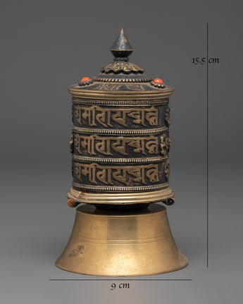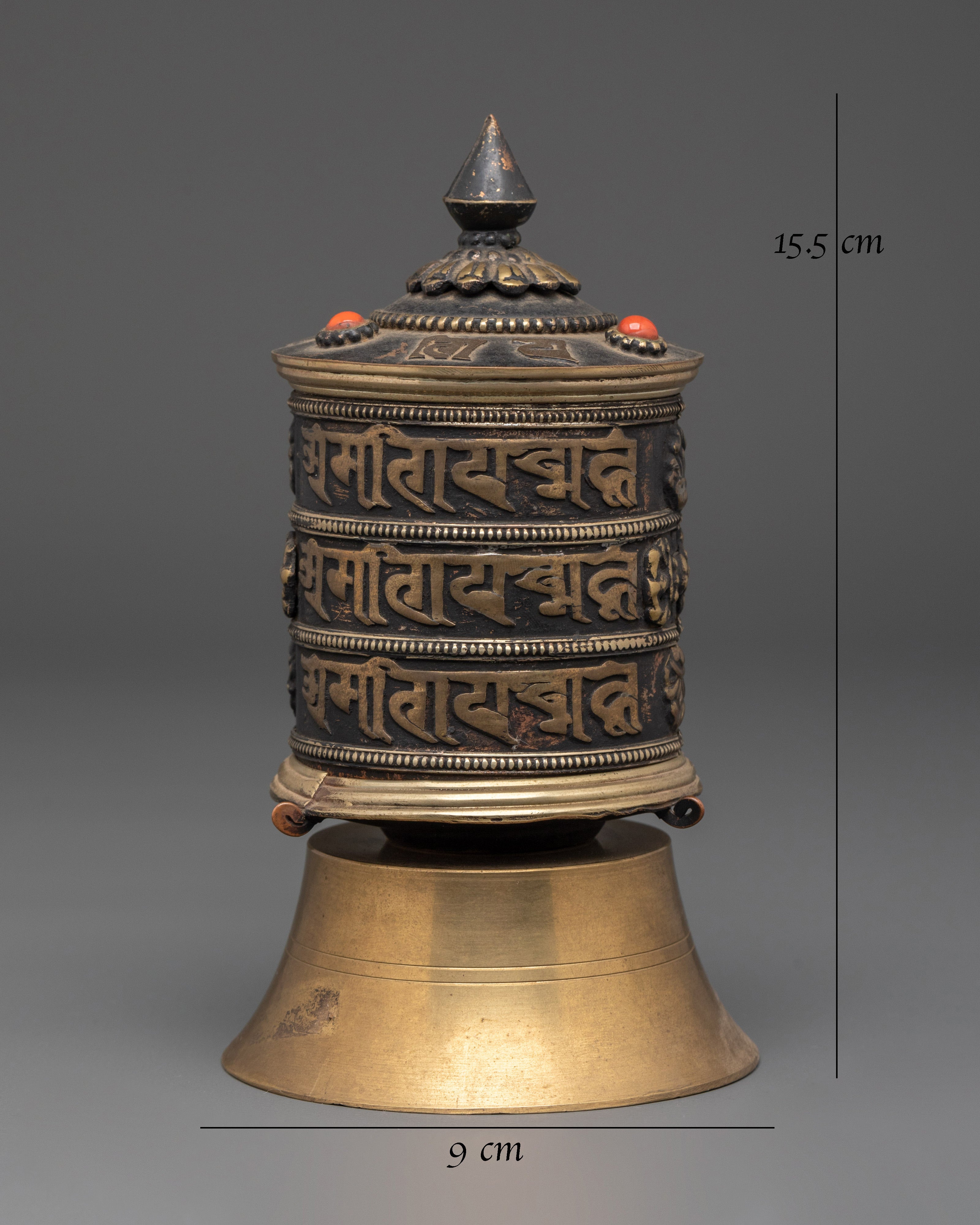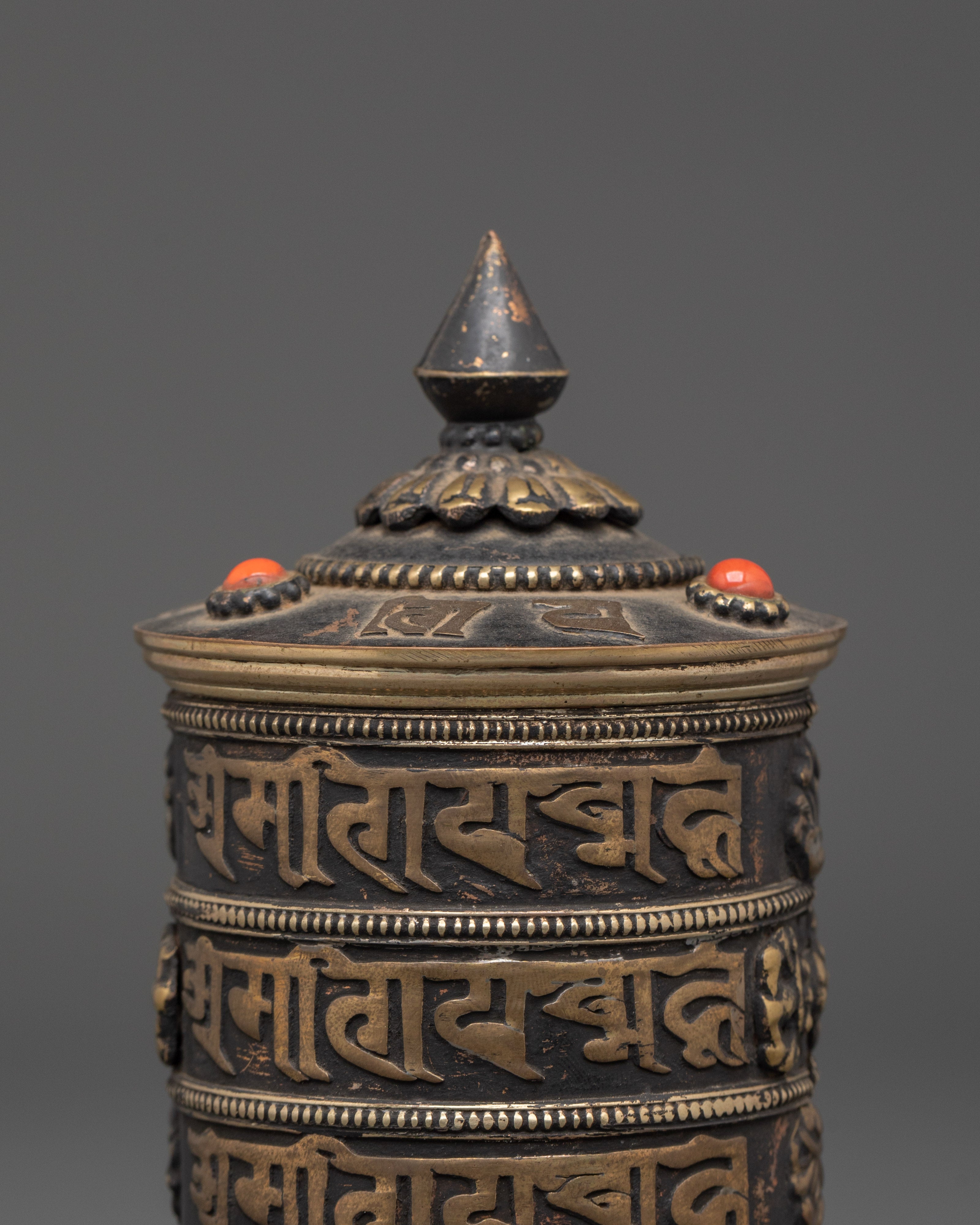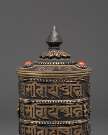 This Tibetan mantra wheel has elaborate copper embossing and gilded brass inscriptions of the mantra in ancient script. Coral stones are artistically placed around the cylinder, representing protection and vitality. The conical brass top and circular base provide solidity while also adding refinement to the spiritual design. The artistry echoes the ancient Himalayan art heritage, with each engraved syllable and precise pattern speaking of commitment, faith, and contemplative energy, making it both a spiritual instrument and a stunning ornamental piece.