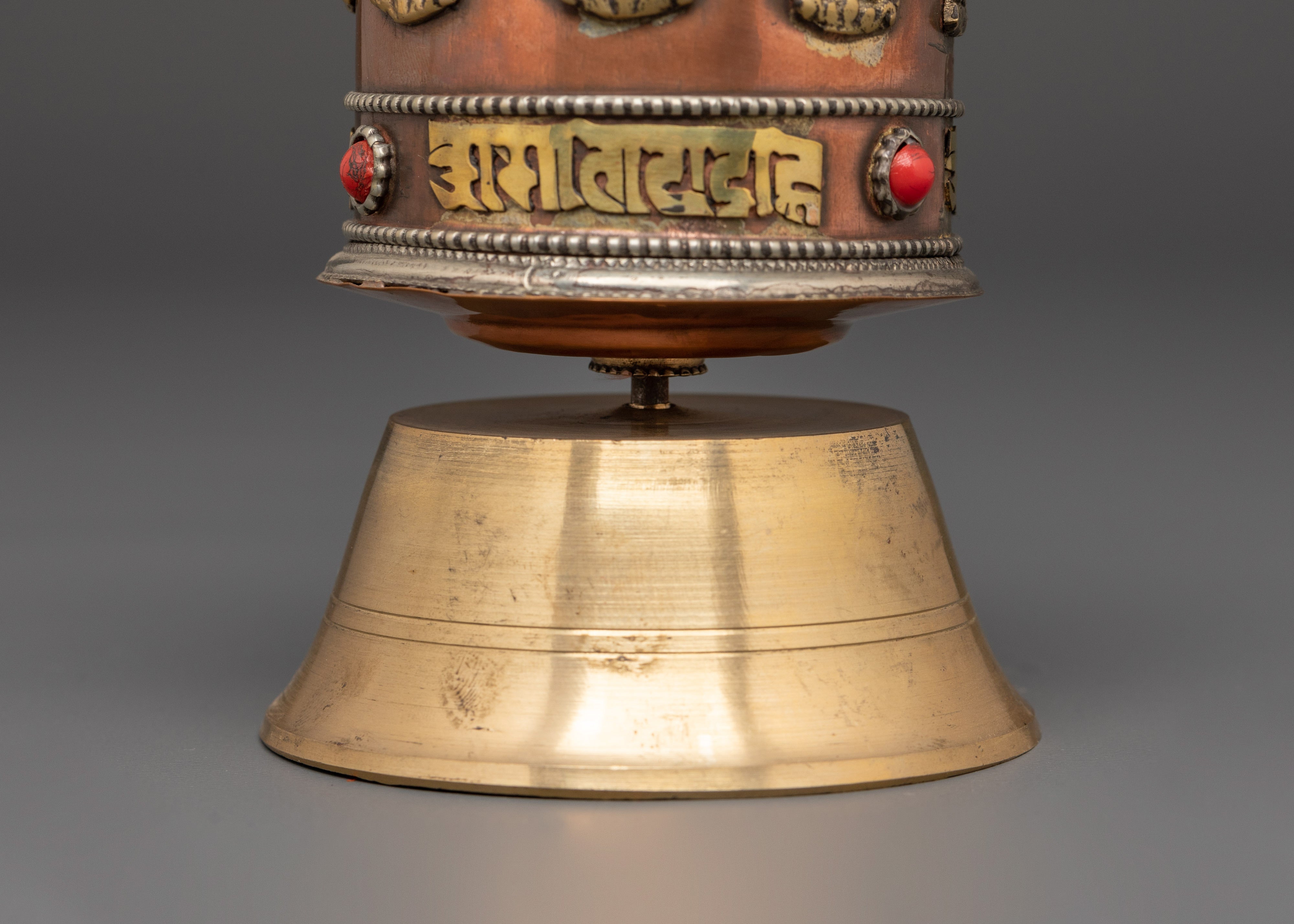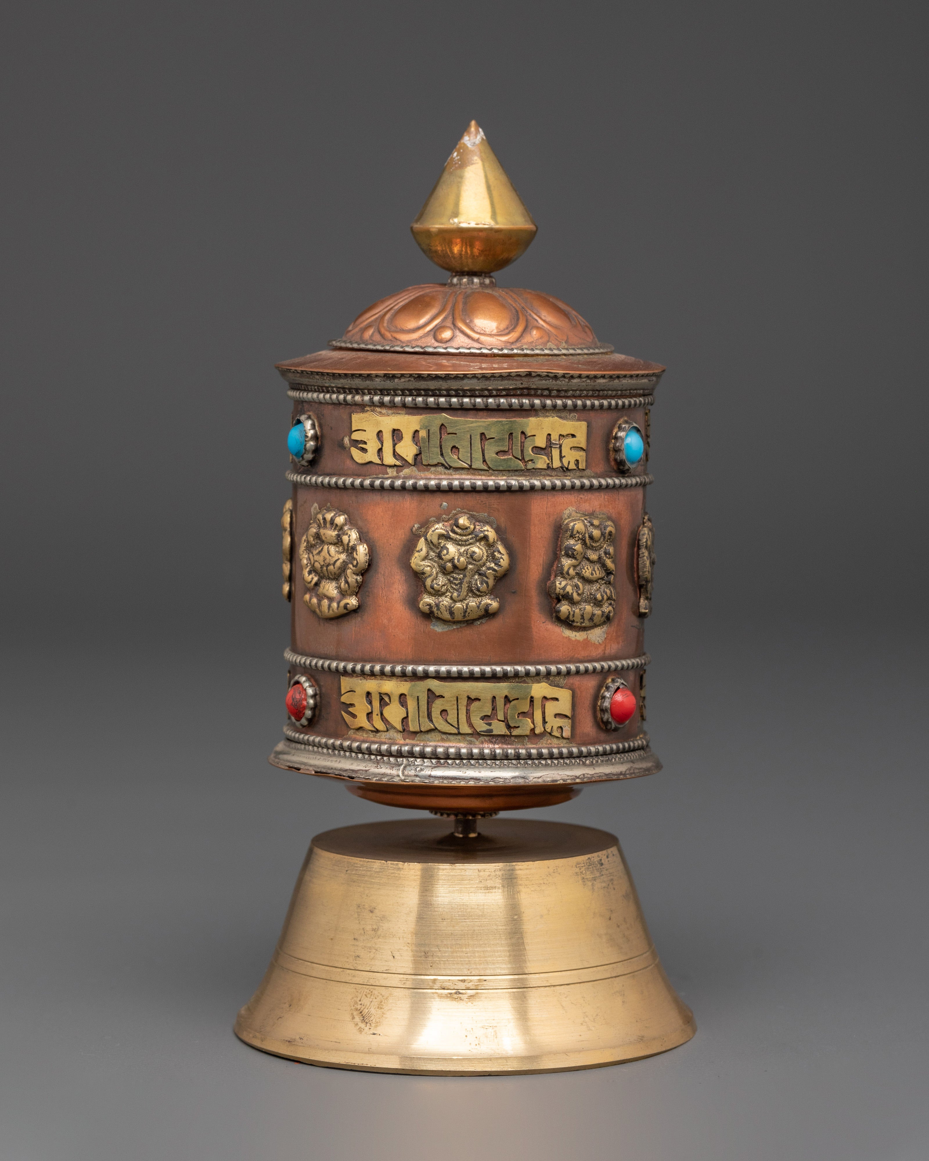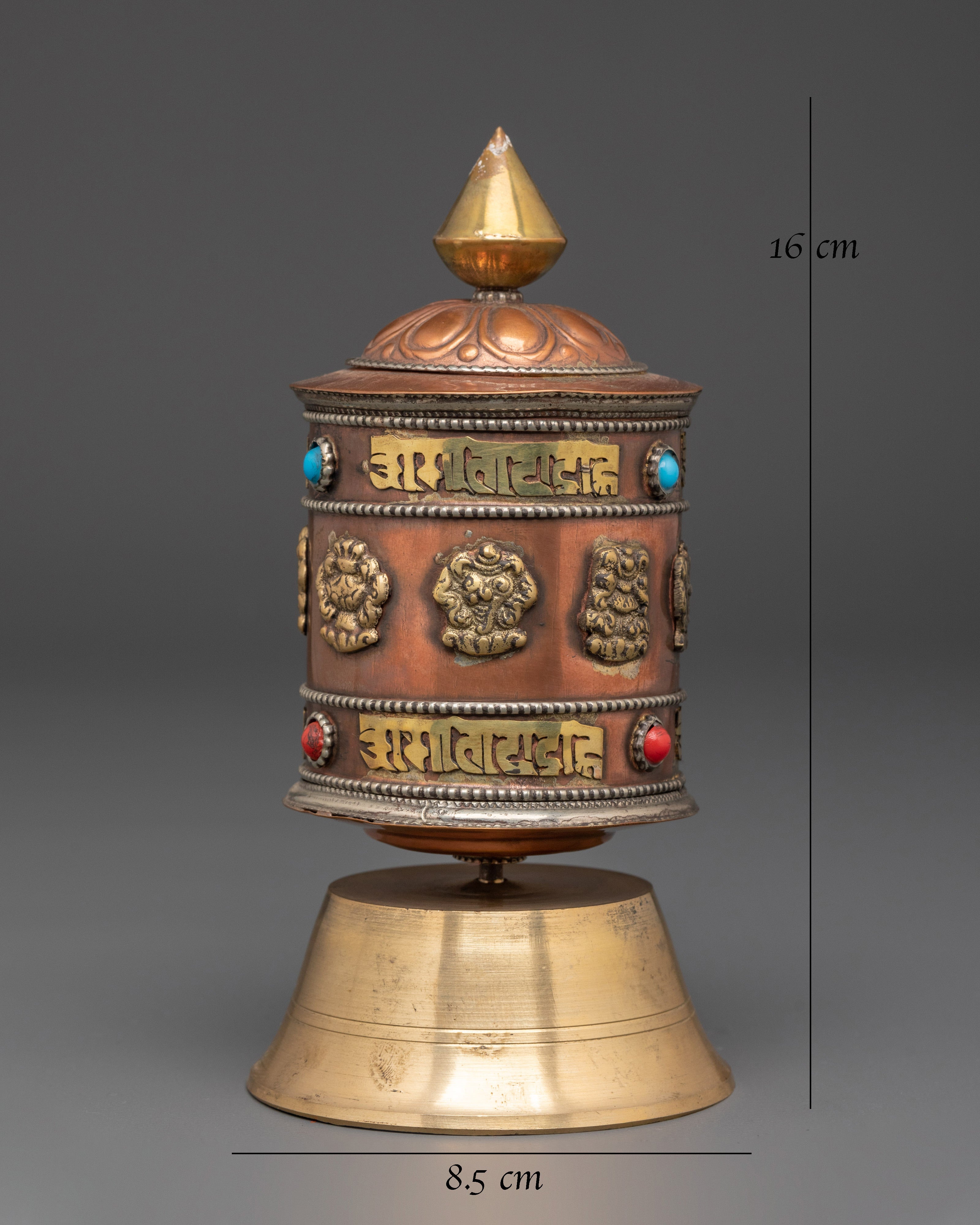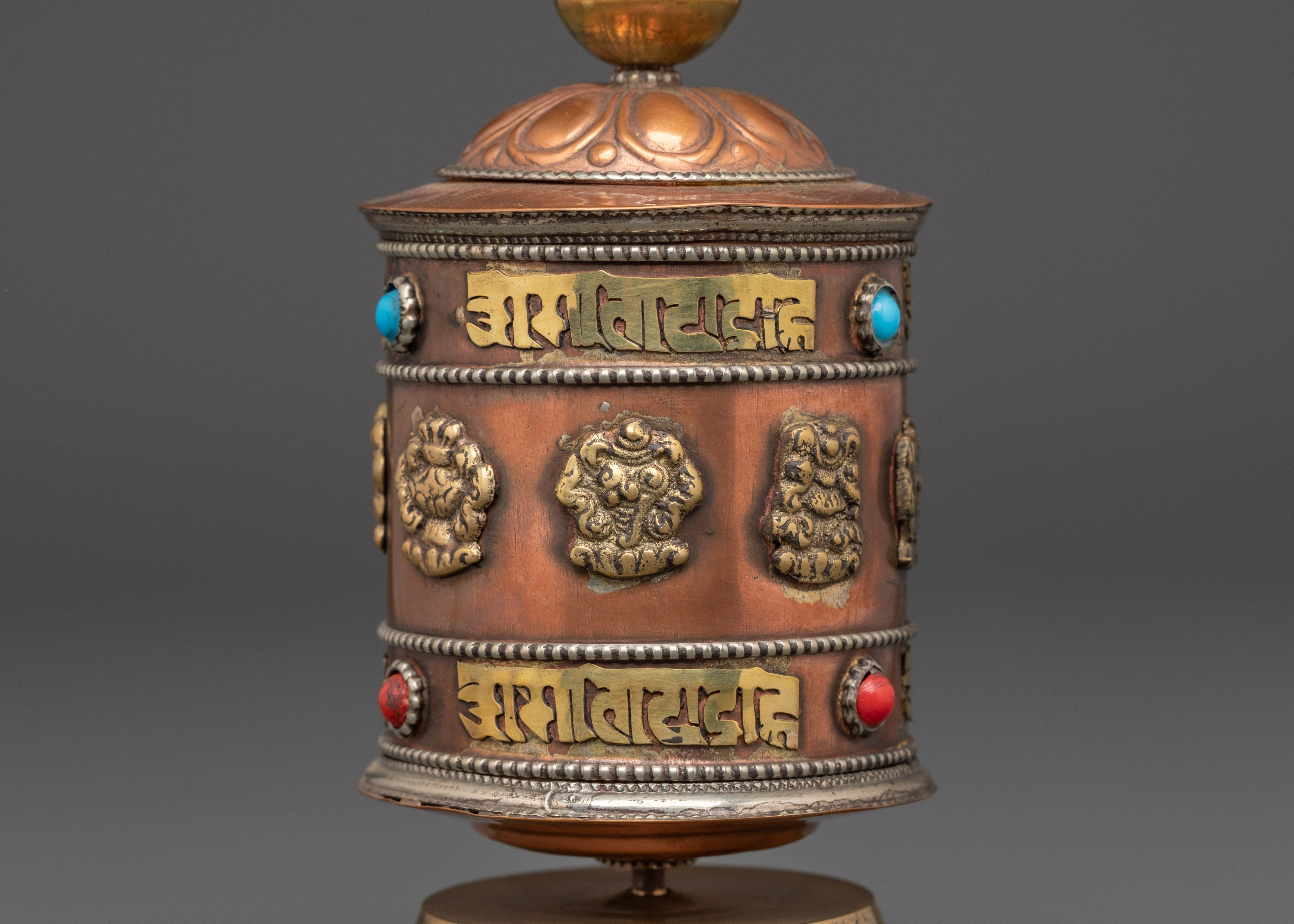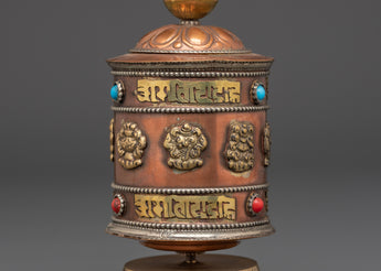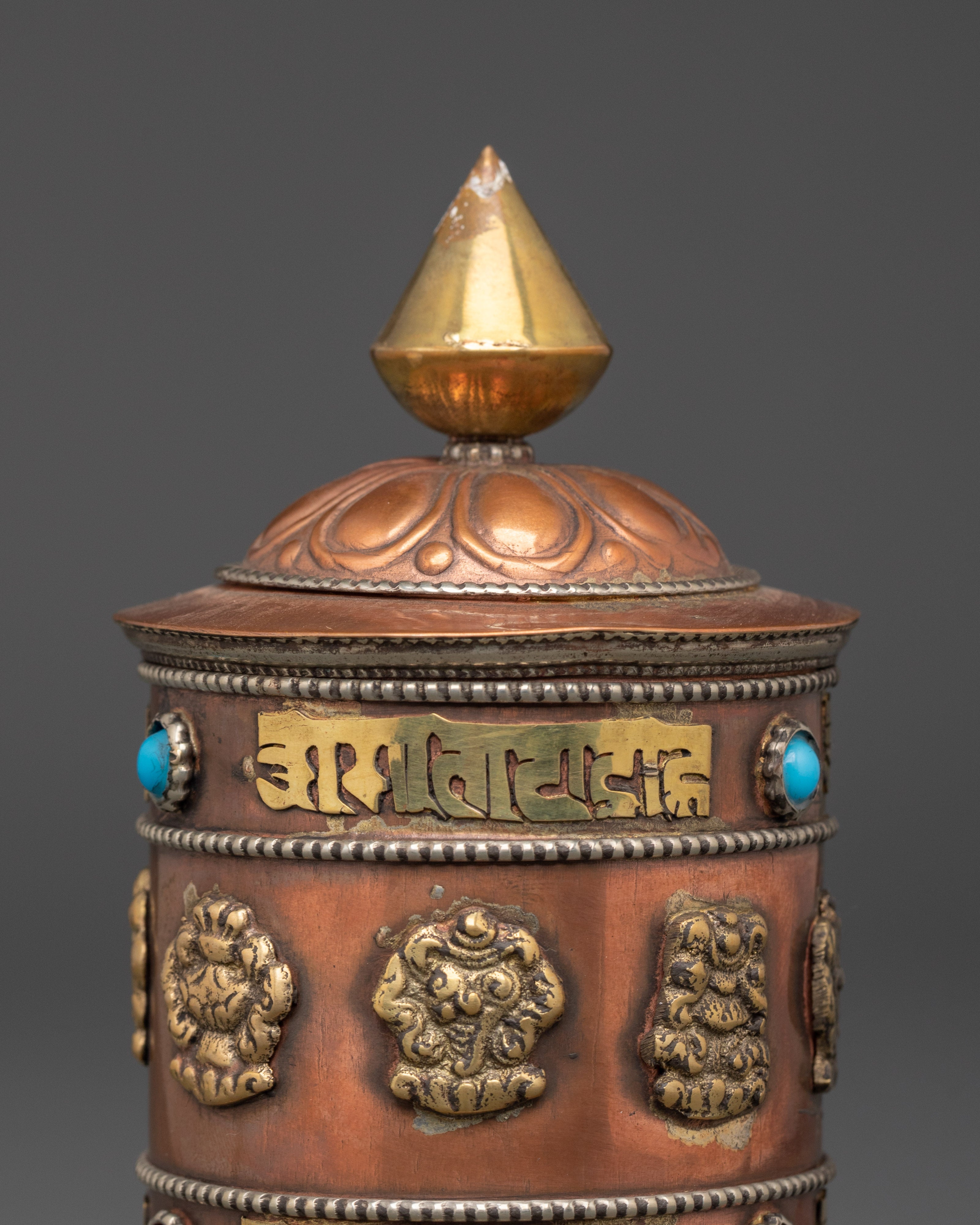 The beautiful workmanship on the prayer wheel exemplifies the skill and devotion of Tibetan artisans. The copper cylinder is carved with elaborate Buddhist mantras and deities that represent spiritual awakening and the purification of negative karma. The brass base and cap provide a golden contrast to the rich copper tones. At the same time, the coral and turquoise stones represent healing and protection, with coral representing vitality and turquoise expressing spiritual harmony. The wheel's summit is adorned with a pointed finial, symbolizing enlightenment and the connection between earth and the divine.