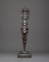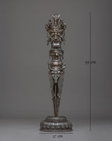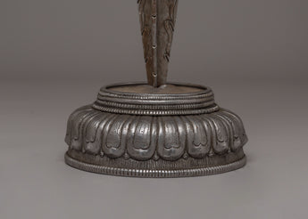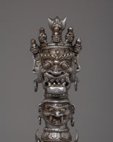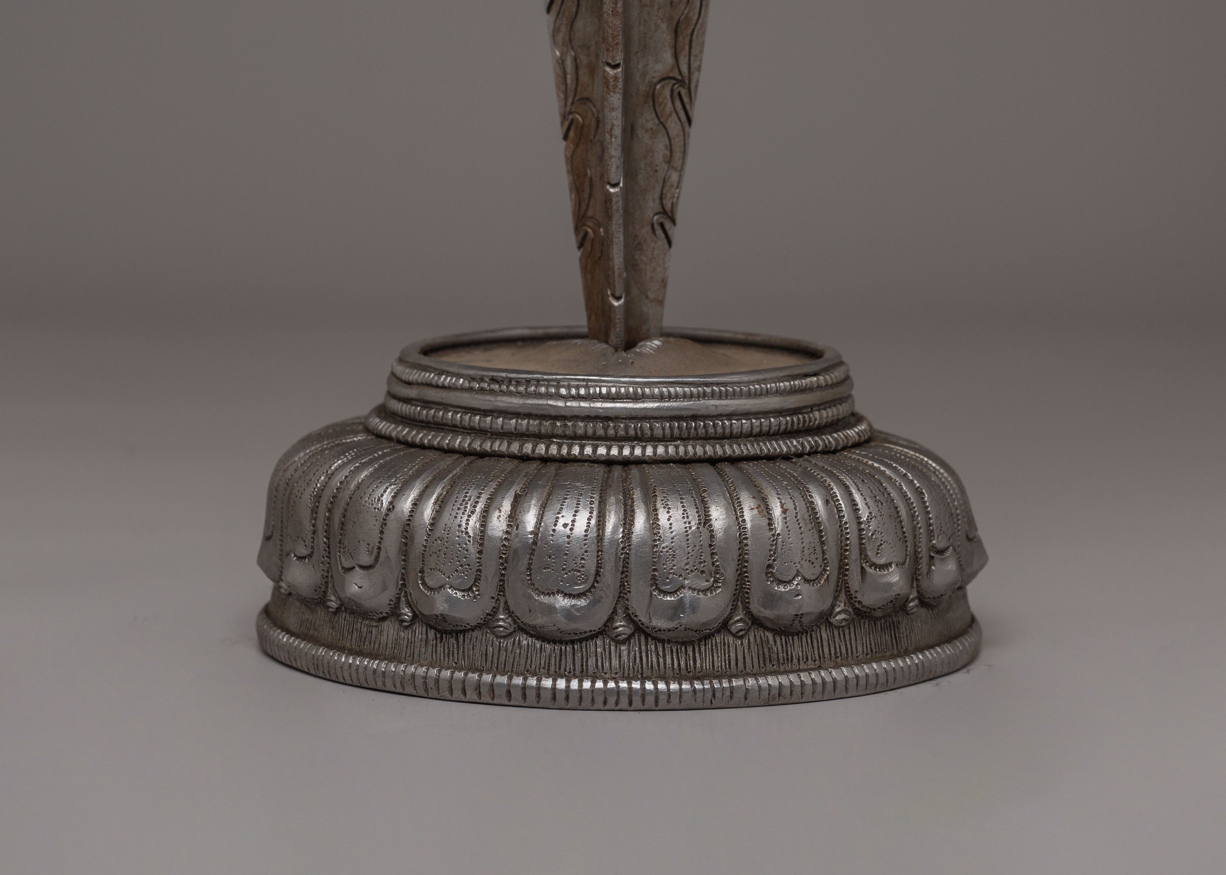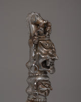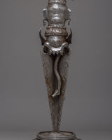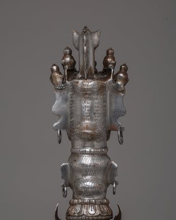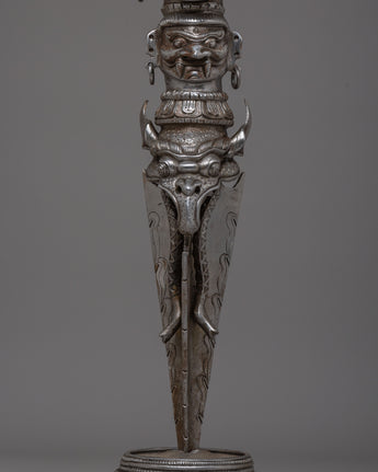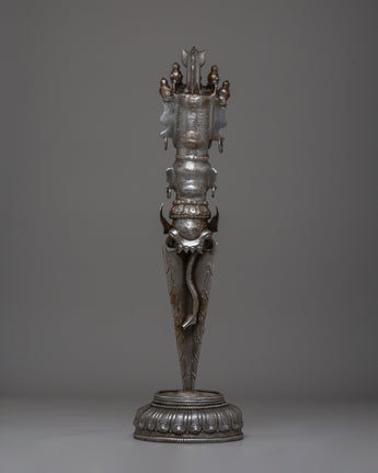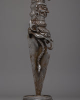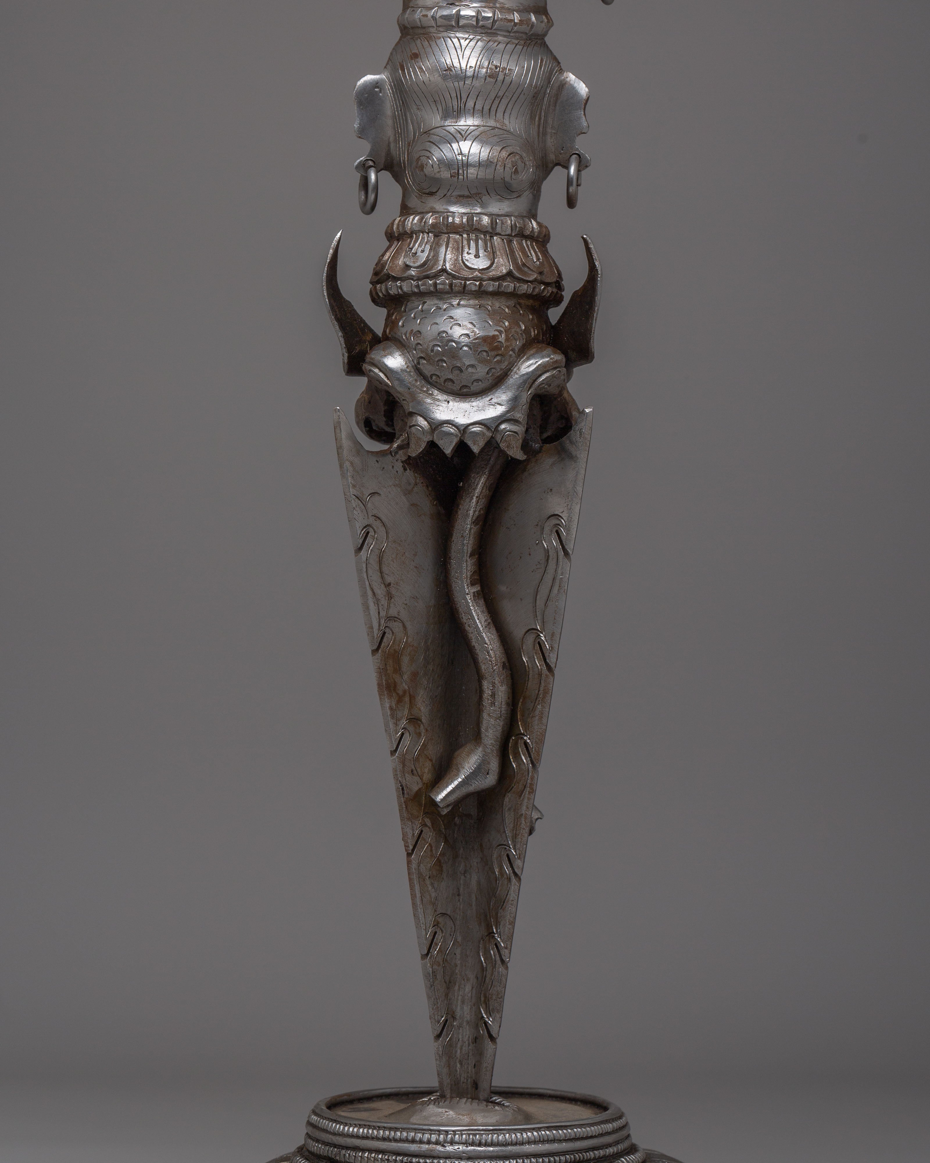 The iron phurba is a potent tool for rituals, meditation practices, and spiritual empowerment. In addition to being a visually arresting piece of holy art, it is a meaningful emblem of strength, resilience, and spiritual development. This phurba, whether used in ceremonies, displayed as a centerpiece in a shrine, or treasured as a collector's item, is a tangible representation of spiritual energy and a tribute to the rich traditions of Tibetan craftsmanship.