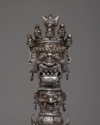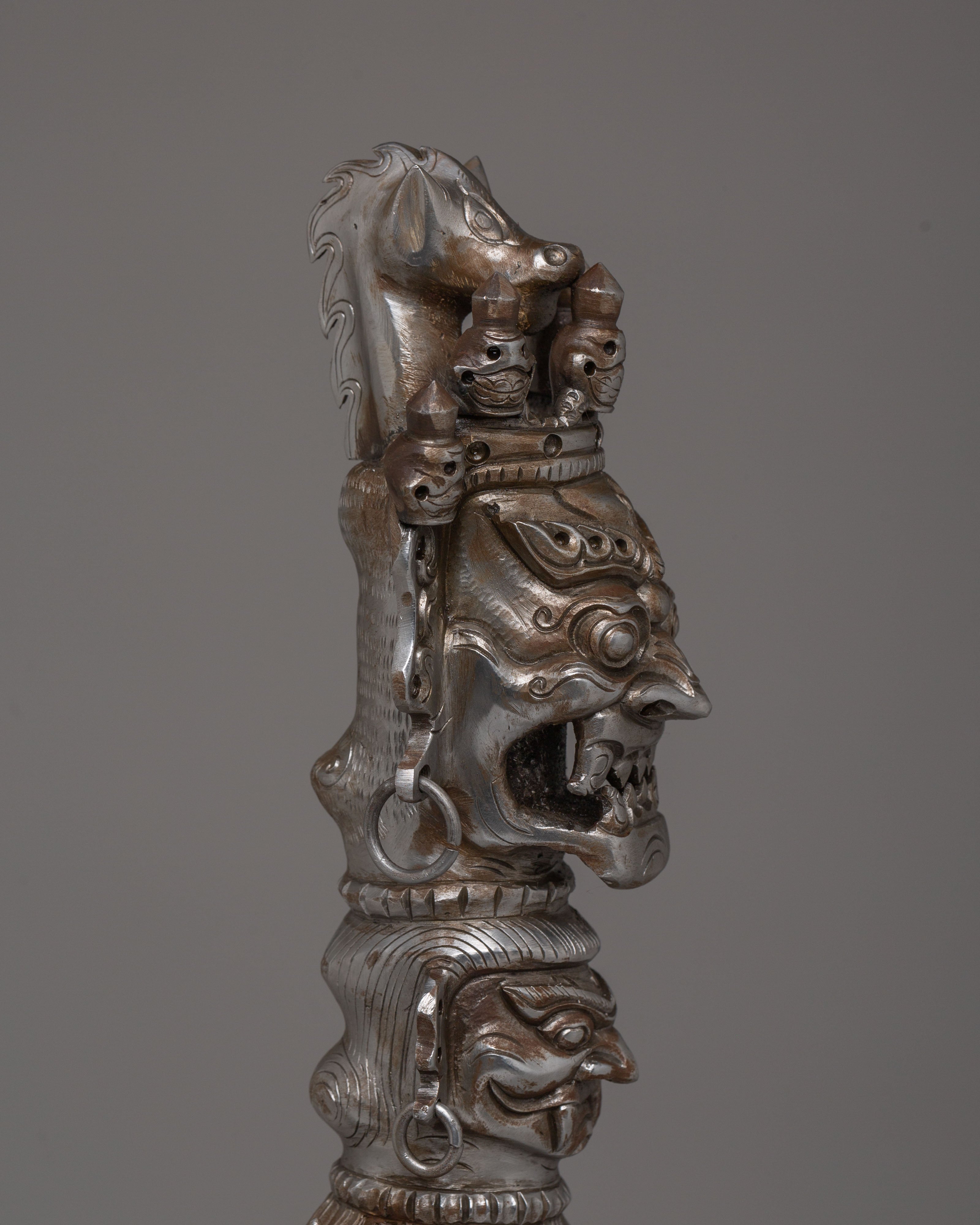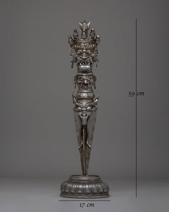 This handcrafted iron ritual phurba, a traditional Tibetan ceremonial dagger used to symbolize spiritual protection and the power to cut through ignorance, is a powerful ritual object. This ceremonial item stands 59 cm tall, measures 17 cm wide, and weighs 5.3 kg. It has a solid iron body, intricate carvings, and a three-sided blade that represents the ability to conquer all harmful forces. The elaborate decorations on the handle, which include animal heads, floral motifs, and sacred symbols, represent the phurba's connection to Vajrayana Buddhism's profound wisdom traditions.