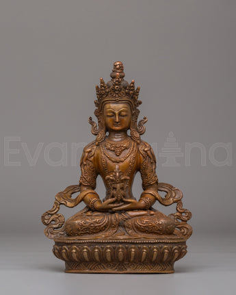 This Tibetan Amitayus statue depicts the deity seated in serene meditation, holding the sacred kalasha vase filled with the nectar of immortality. His peaceful expression reflects compassion and enlightened awareness, while the traditional crown and flowing monastic robes highlight Himalayan craftsmanship. The oxidized copper finish enhances the intricate carvings, giving depth and spiritual richness to every detail of the sculpture.