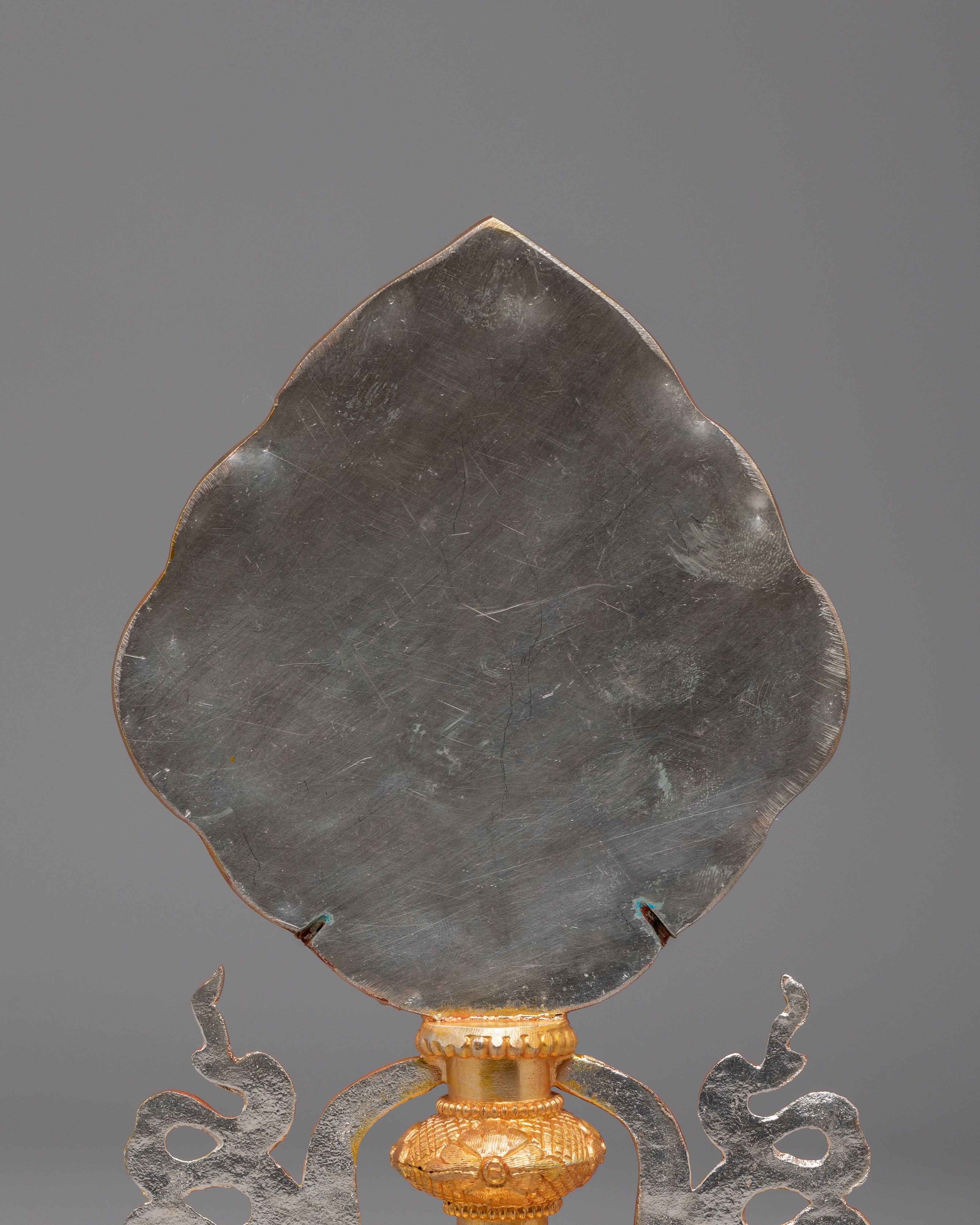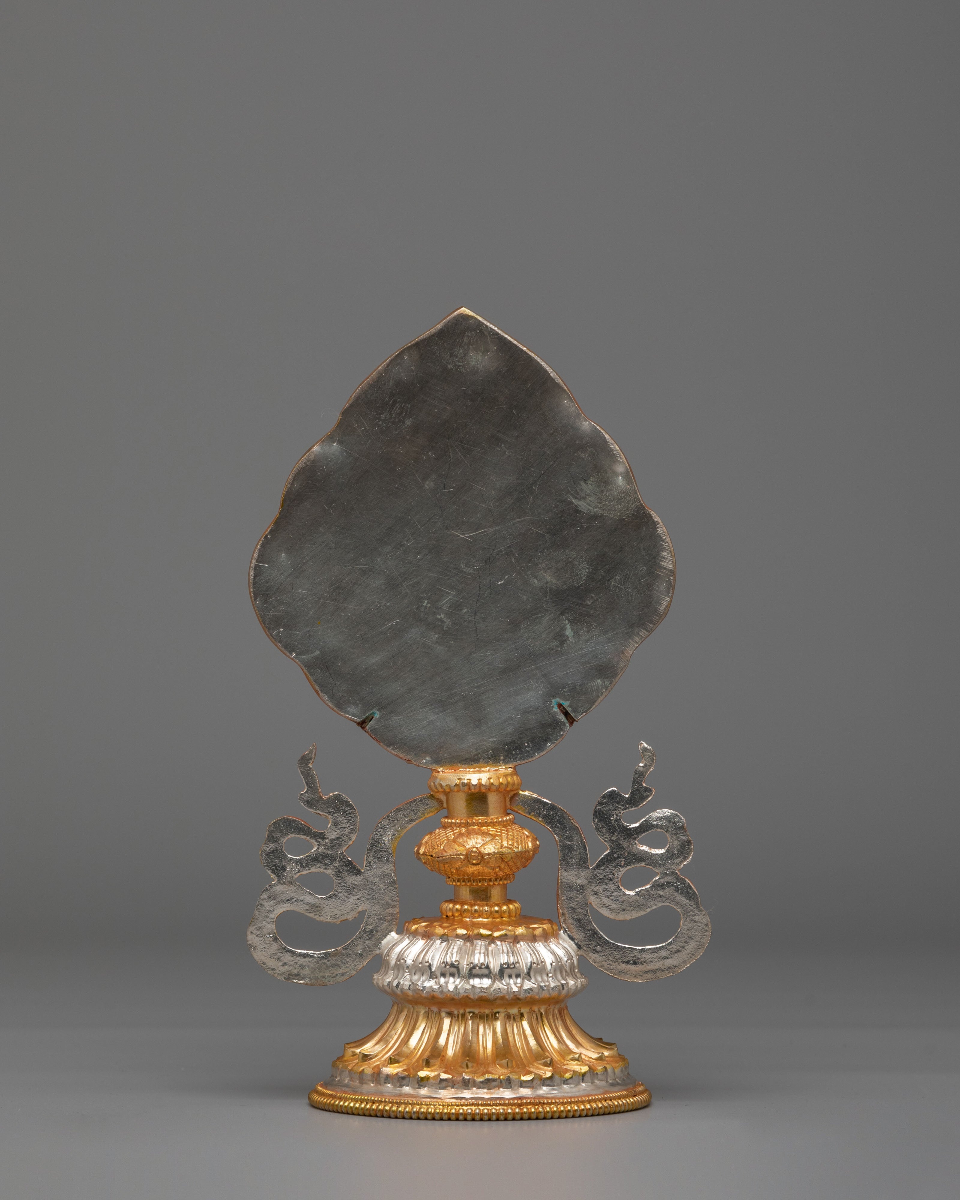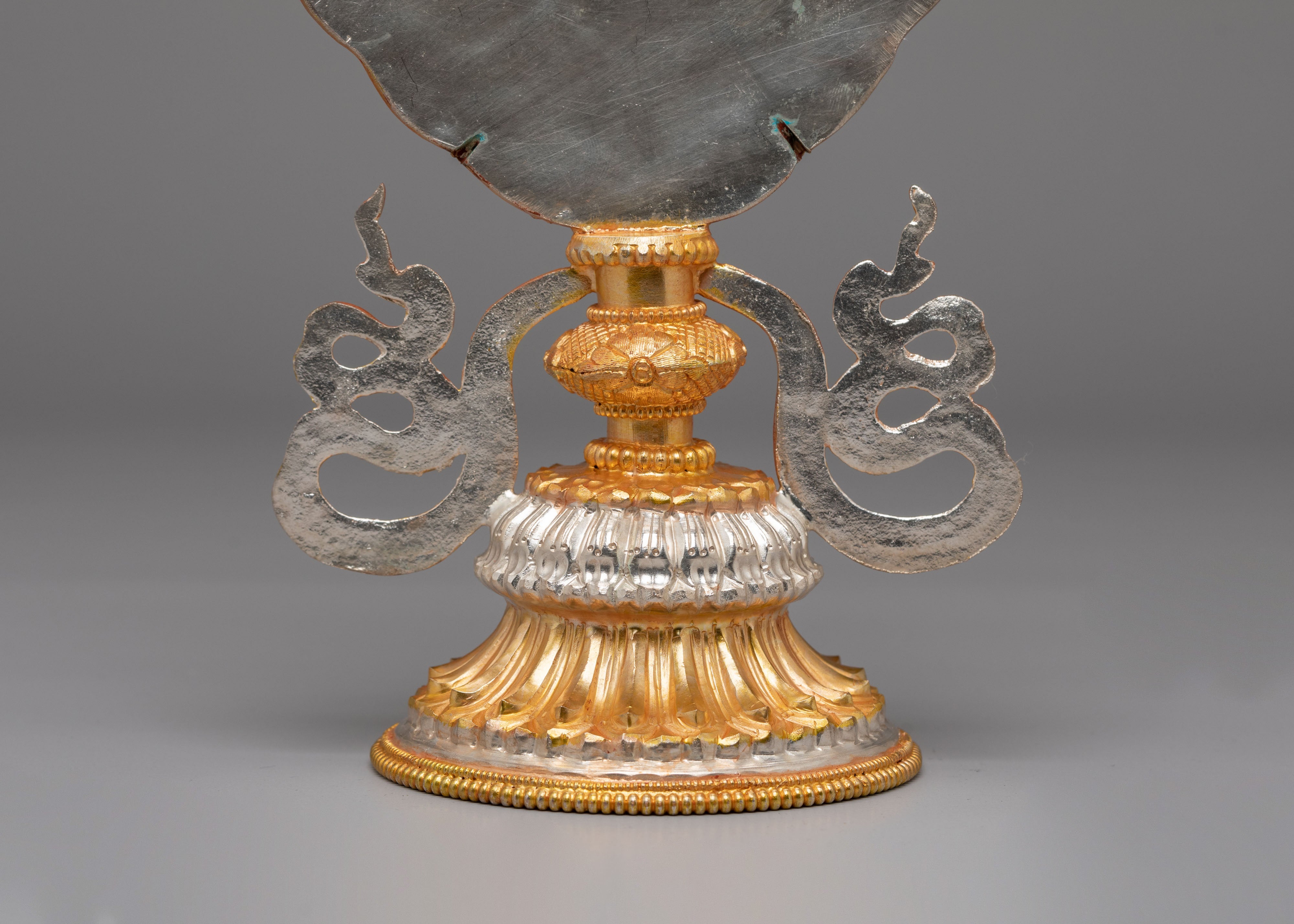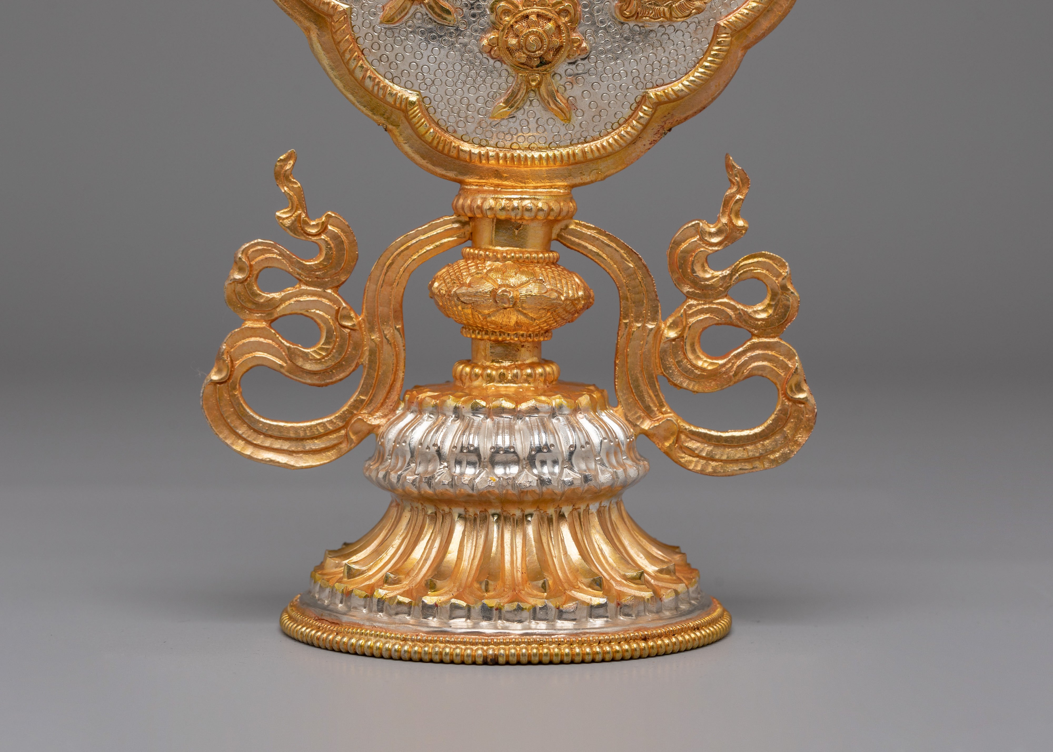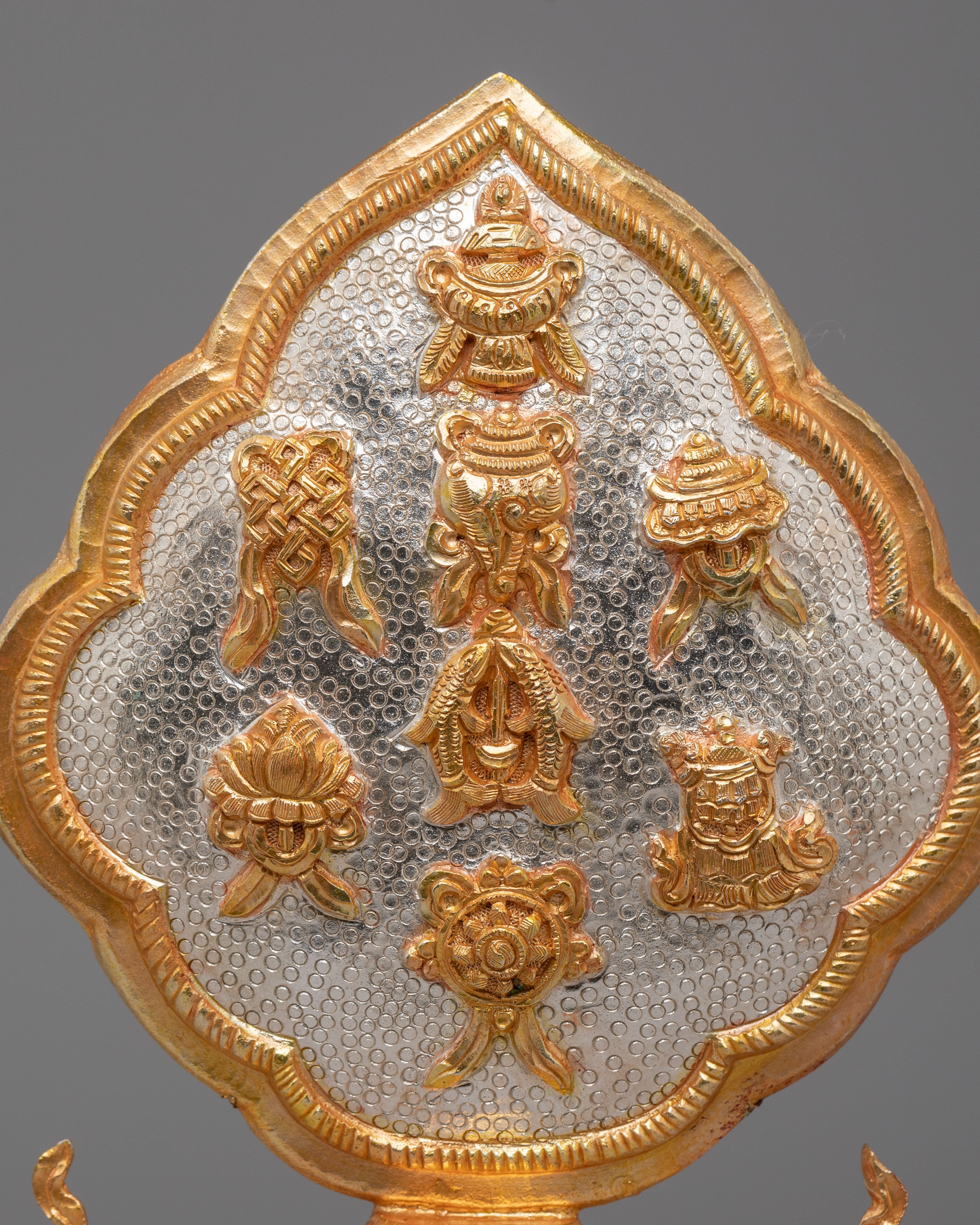 Invite blessings, prosperity, and spiritual harmony into your space with this Handmade Tibetan Auspicious Symbol Sculpture, beautifully crafted with a copper body and electro-gold and silver plating. This sacred artwork represents the revered Ashtamangala, or Eight Auspicious Symbols of Tibetan Buddhism, known for attracting positive energy, protection, and spiritual growth. Designed with radiant gold-plated details set against a textured silver-plated background, this piece creates a striking contrast that enhances its sacred presence, making it perfect for Buddhist altars, meditation rooms, or spiritual home decor.