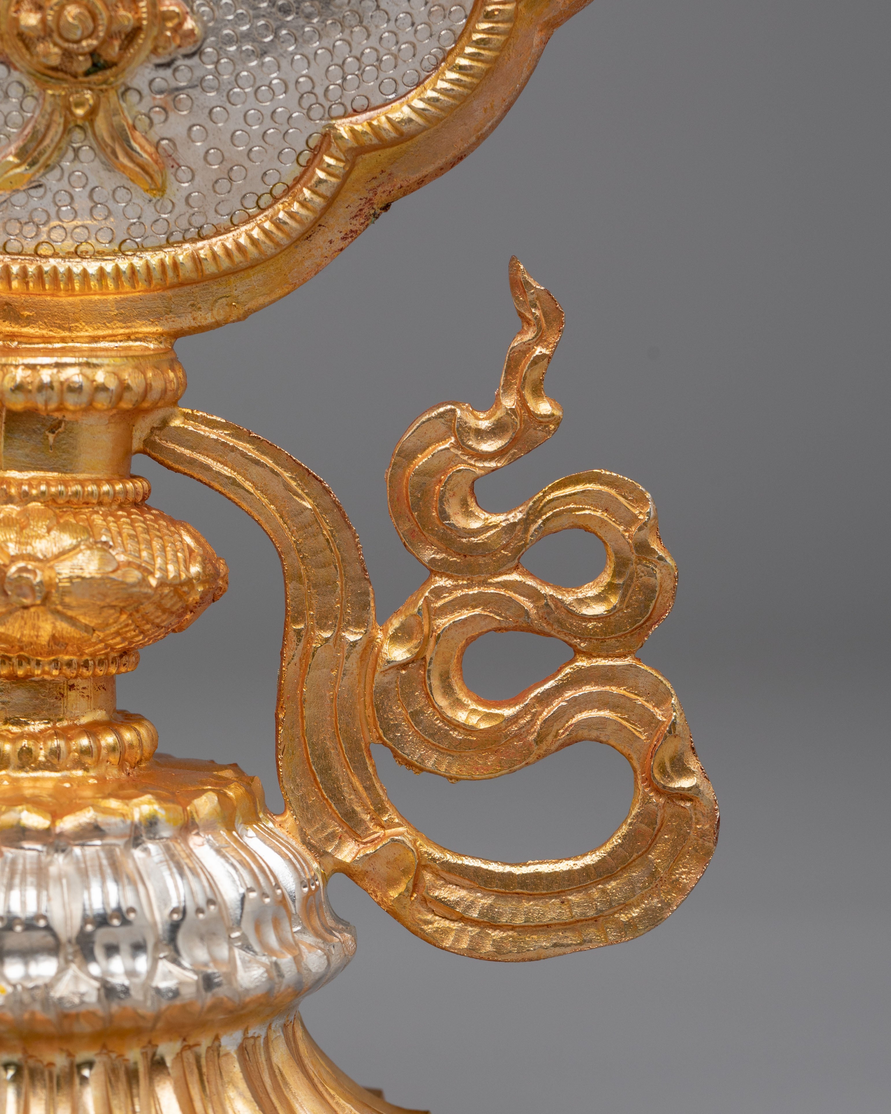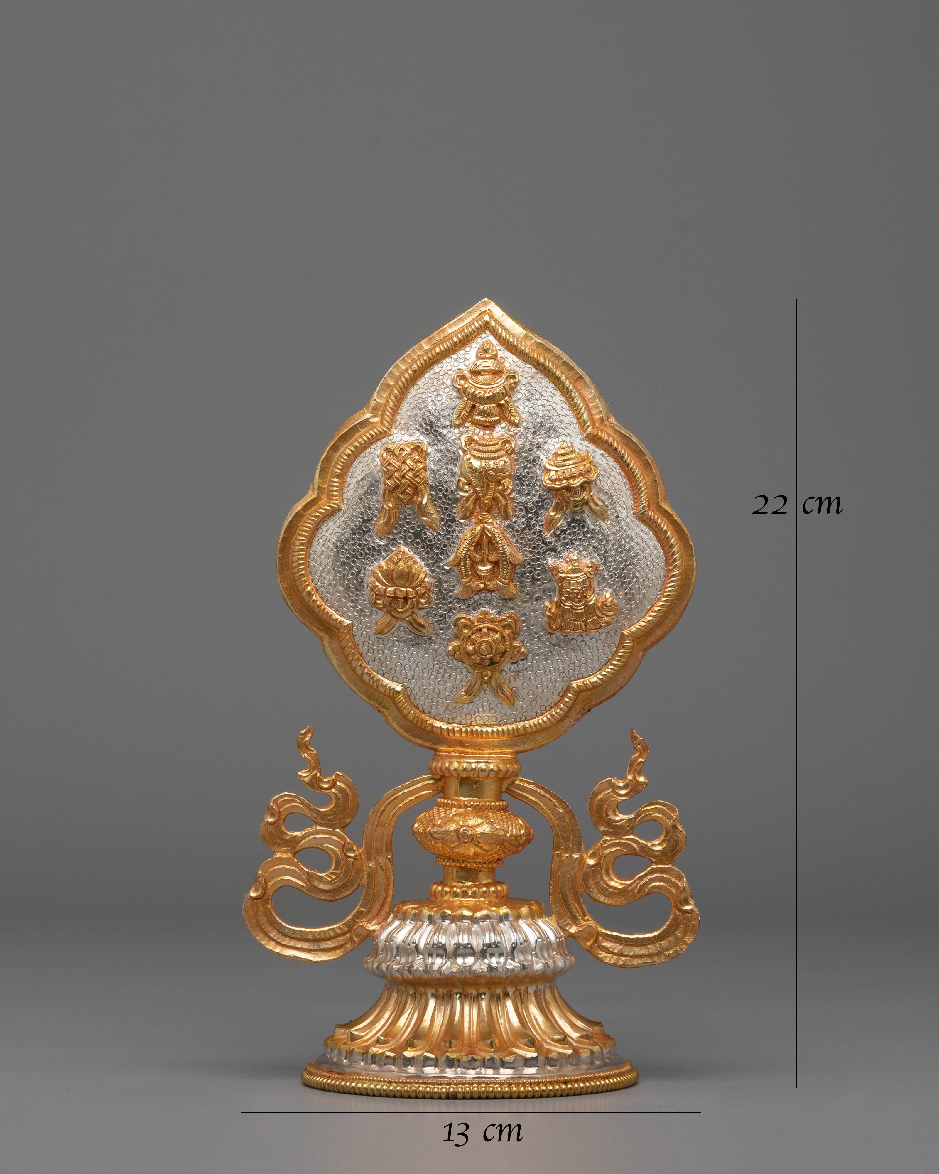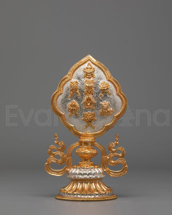 In Tibetan Buddhism, the Eight Auspicious Symbols are powerful emblems of fortune, wisdom, and spiritual awakening. Displaying this sacred symbol sculpture is believed to invite blessings, remove obstacles, and cultivate positive karma. Whether placed on a home altar, meditation space, office, or gifted to a spiritual seeker, this gold and silver-plated Buddhist artwork serves as a meaningful representation of faith, mindfulness, and sacred tradition.
