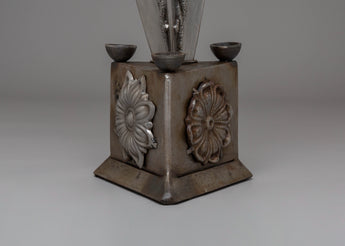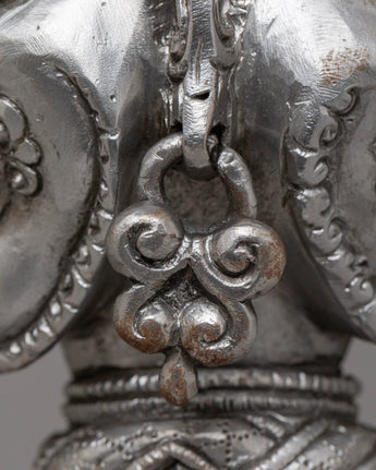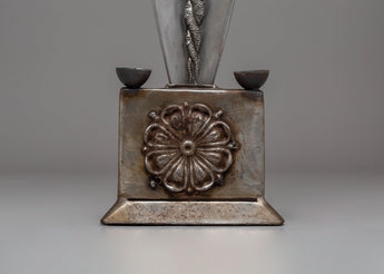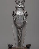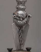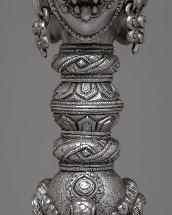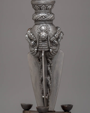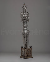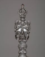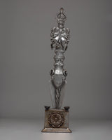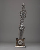 The design of the Iron Phurba with Gemstone is striking, with detailed carvings and gemstone embellishments that enhance its spiritual significance. At the top, the demonic face symbolizes the phurba’s ability to vanquish hostile forces, while the gemstones incorporated into the structure represent wisdom, protection, and the harmony between body, speech, and mind. The phurba’s aesthetic appeal is enhanced with acrylic colors, which bring life to its intricate details and provide a dynamic contrast to the metallic finish. The phurba’s elongated form represents spiritual energy extending in all directions, offering protection and invoking the power of transformation.