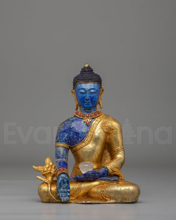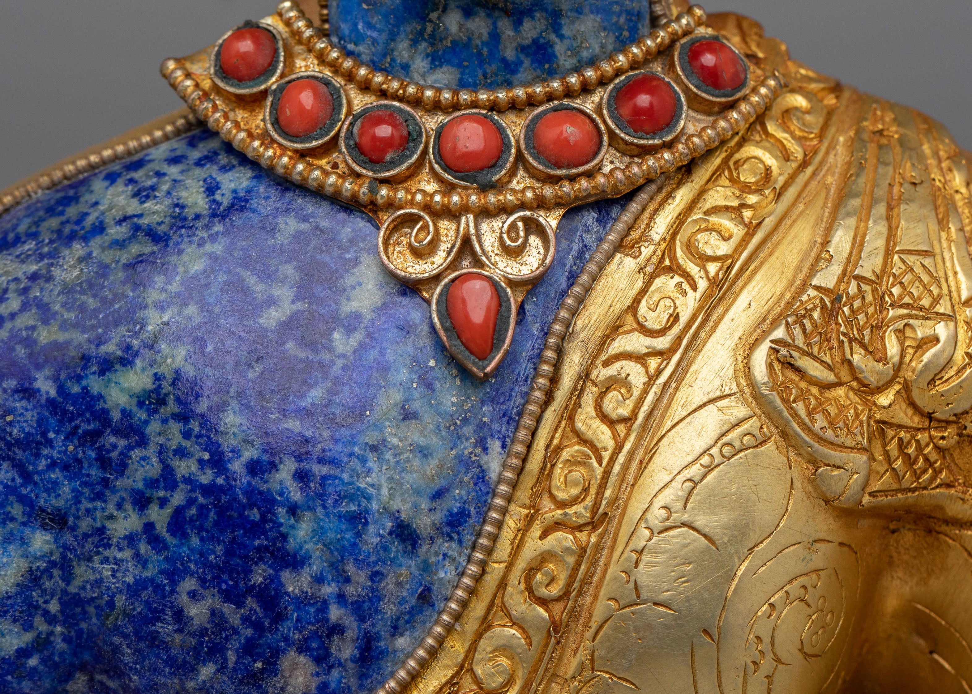 The statue represents the Medicine Buddha (Bhaisajyaguru), revered in Tibetan Buddhism as the embodiment of healing, compassion, and spiritual medicine. Traditional Himalayan design elements are reflected in the calm facial expression, detailed robes, and symbolic posture associated with health, balance, and the removal of suffering. The use of lapis lazuli, a stone traditionally linked to healing and wisdom, enhances the statue’s spiritual symbolism, while crystal and gemstone details highlight sacred artistry.