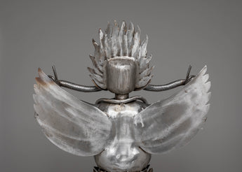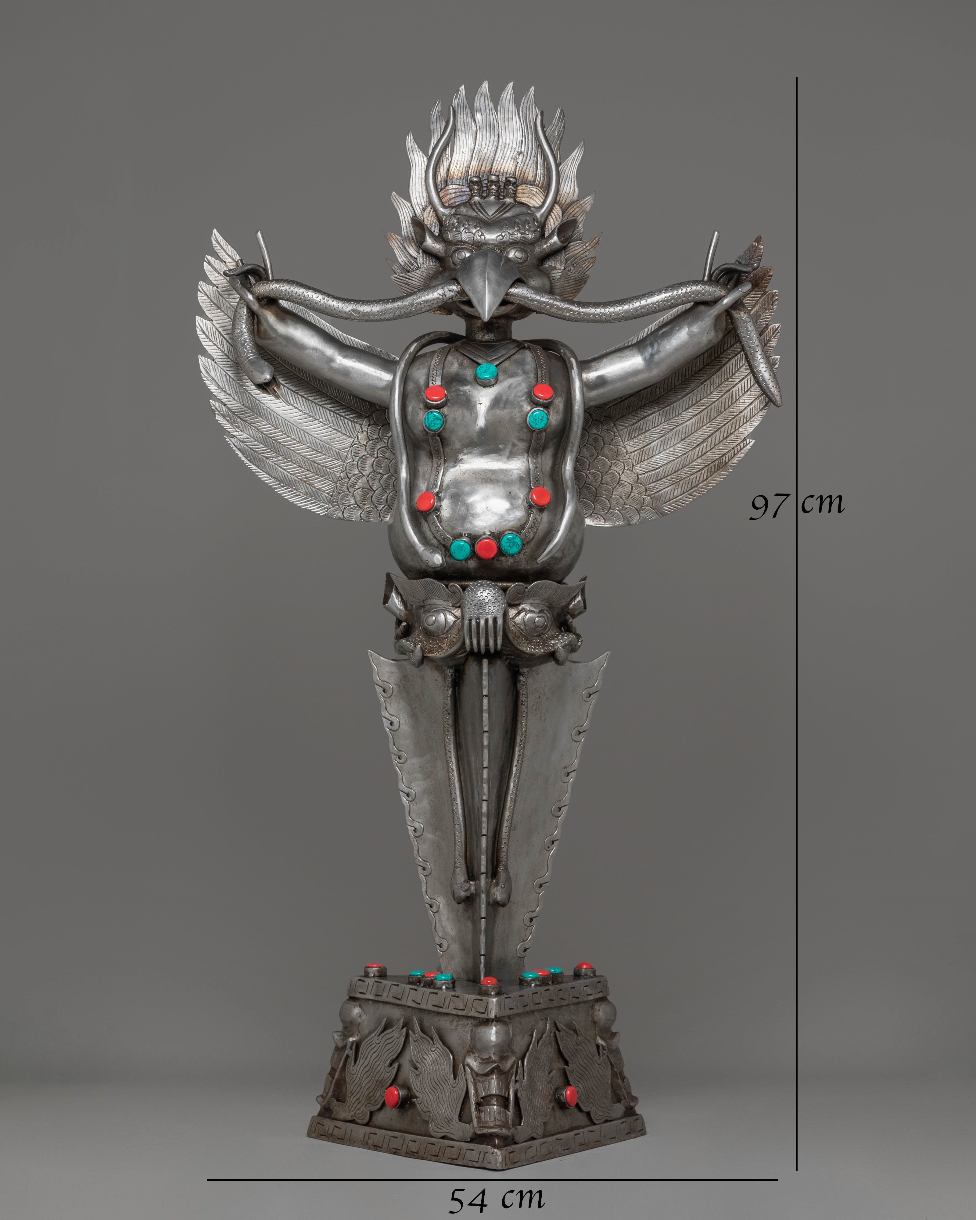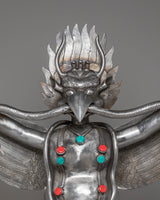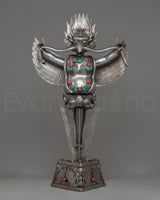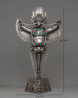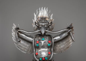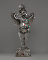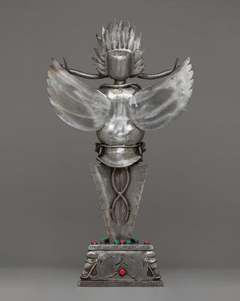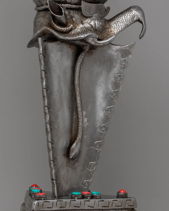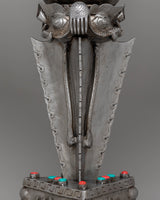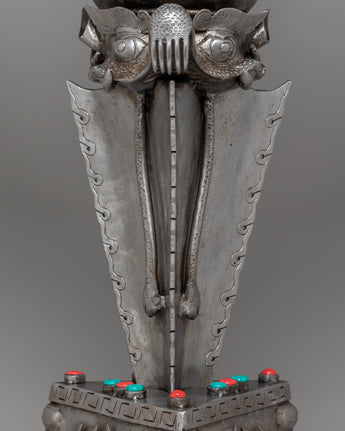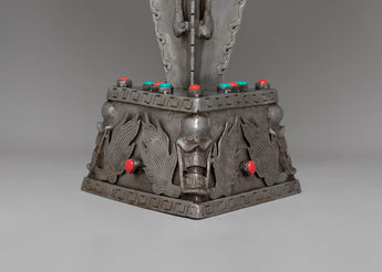 This Sacred Traditional Tibetan Phurba is a remarkable example of Tibetan craftsmanship, embodying both spiritual significance and artistic mastery. Standing at an impressive 97 cm tall and 54 cm wide, this ritual dagger is a powerful symbol of protection and spiritual strength. Made from iron and adorned with gemstones, it carries deep meaning in Tibetan Buddhism, often associated with overcoming obstacles and banishing negative energies. Its intricate design features multiple blades, each representing a different aspect of wisdom and protection, making it a visually stunning and spiritually profound piece.
