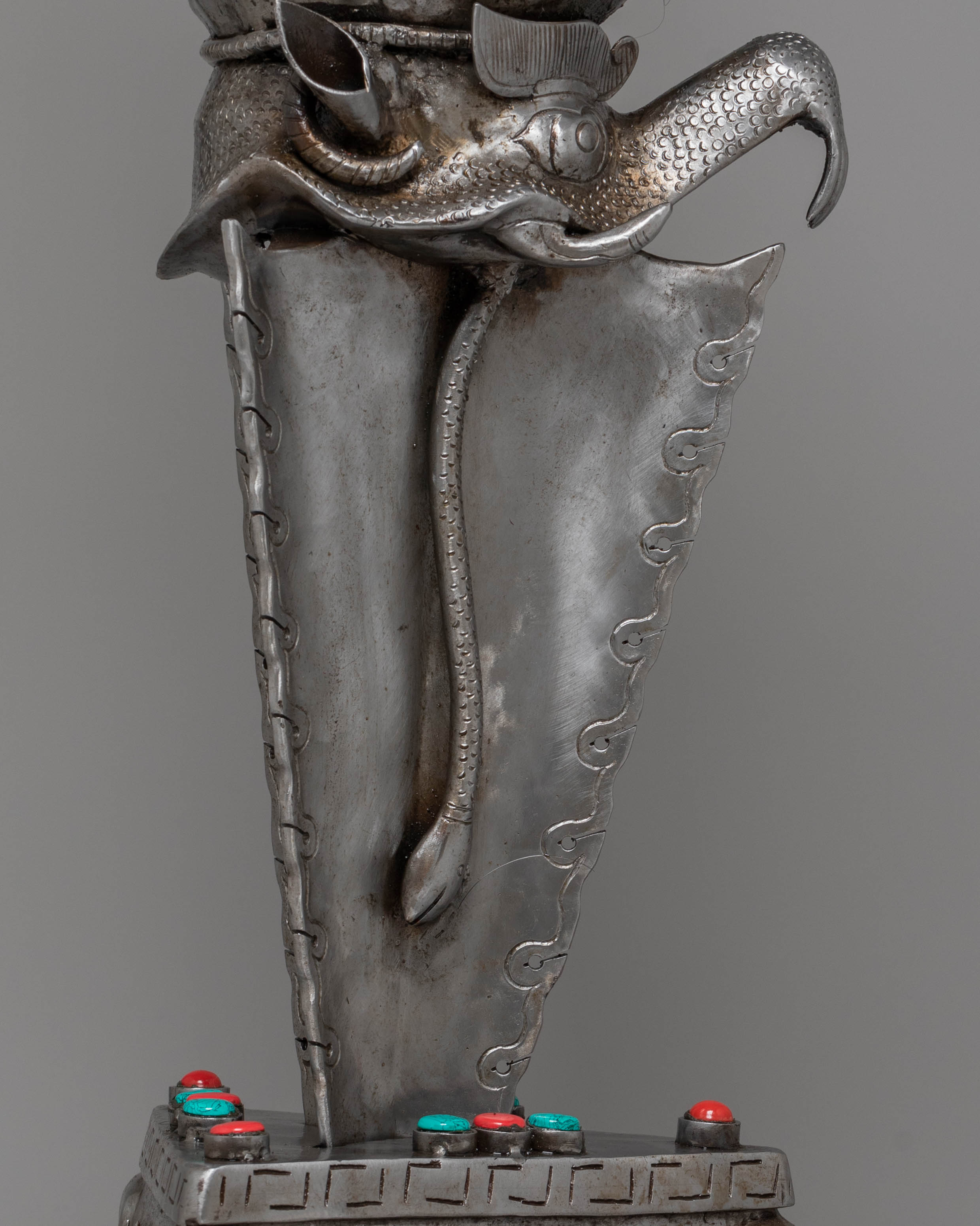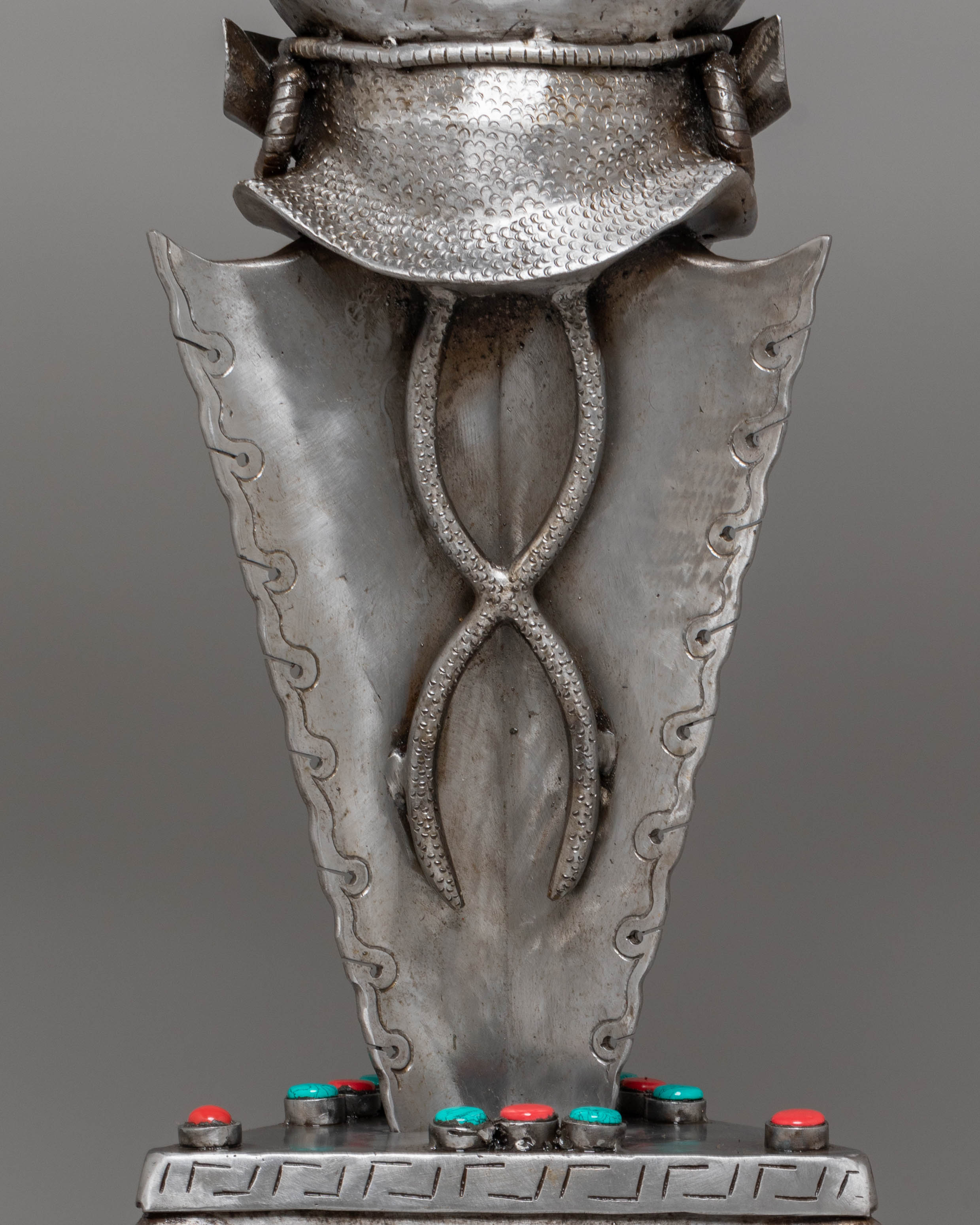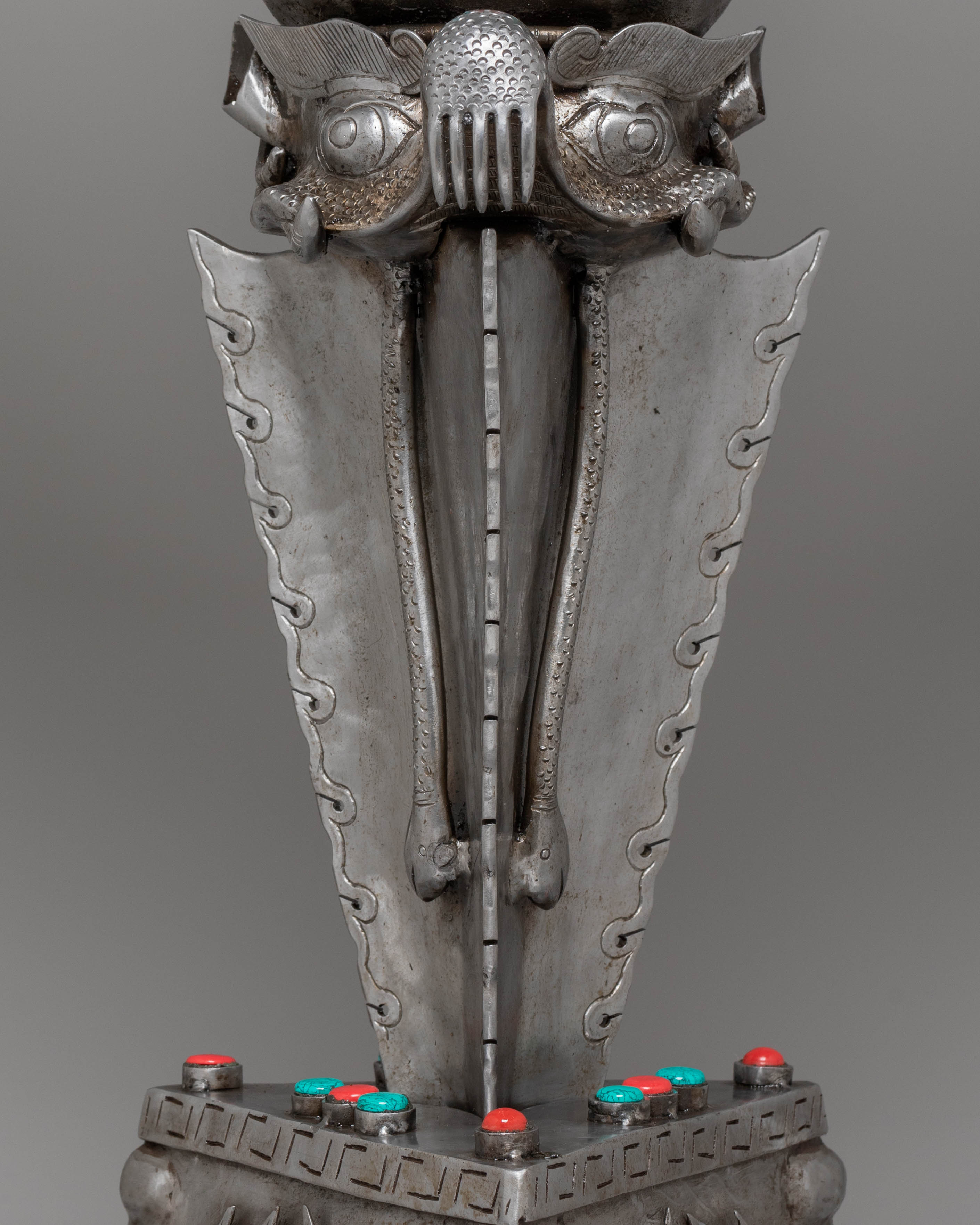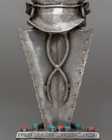 The gemstone inlays add vibrant color and energy to the phurba, enhancing its spiritual potency. These gemstones are believed to amplify the phurba’s protective abilities, bringing harmony and balance to the practitioner. The multiple blades of the phurba represent the cutting through of ignorance, attachment, and illusion, helping the practitioner achieve greater wisdom and enlightenment. This powerful artifact serves as a reminder of the transformative journey toward inner peace and spiritual growth, making it an essential addition for practitioners seeking deeper connection and protection in their rituals.