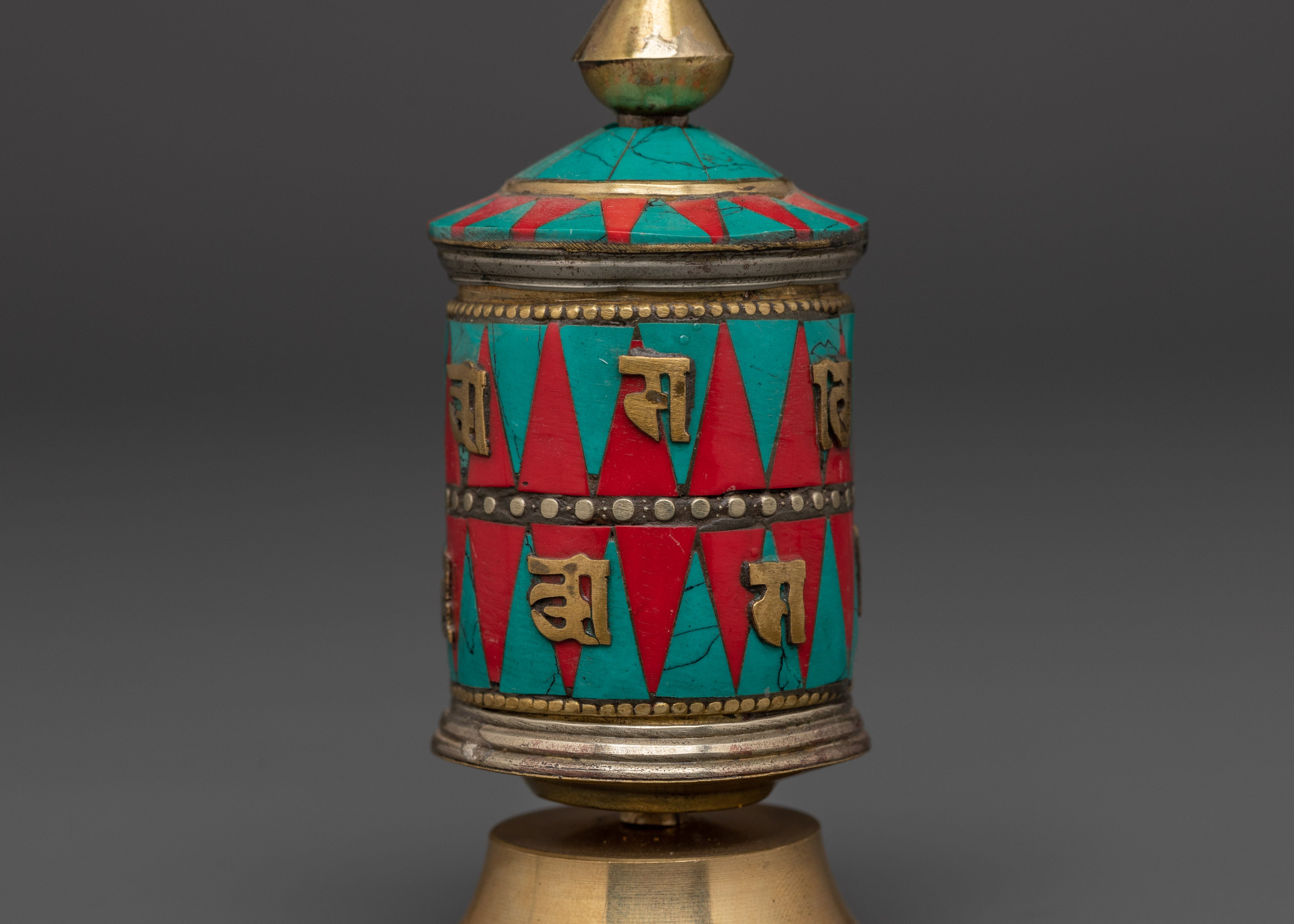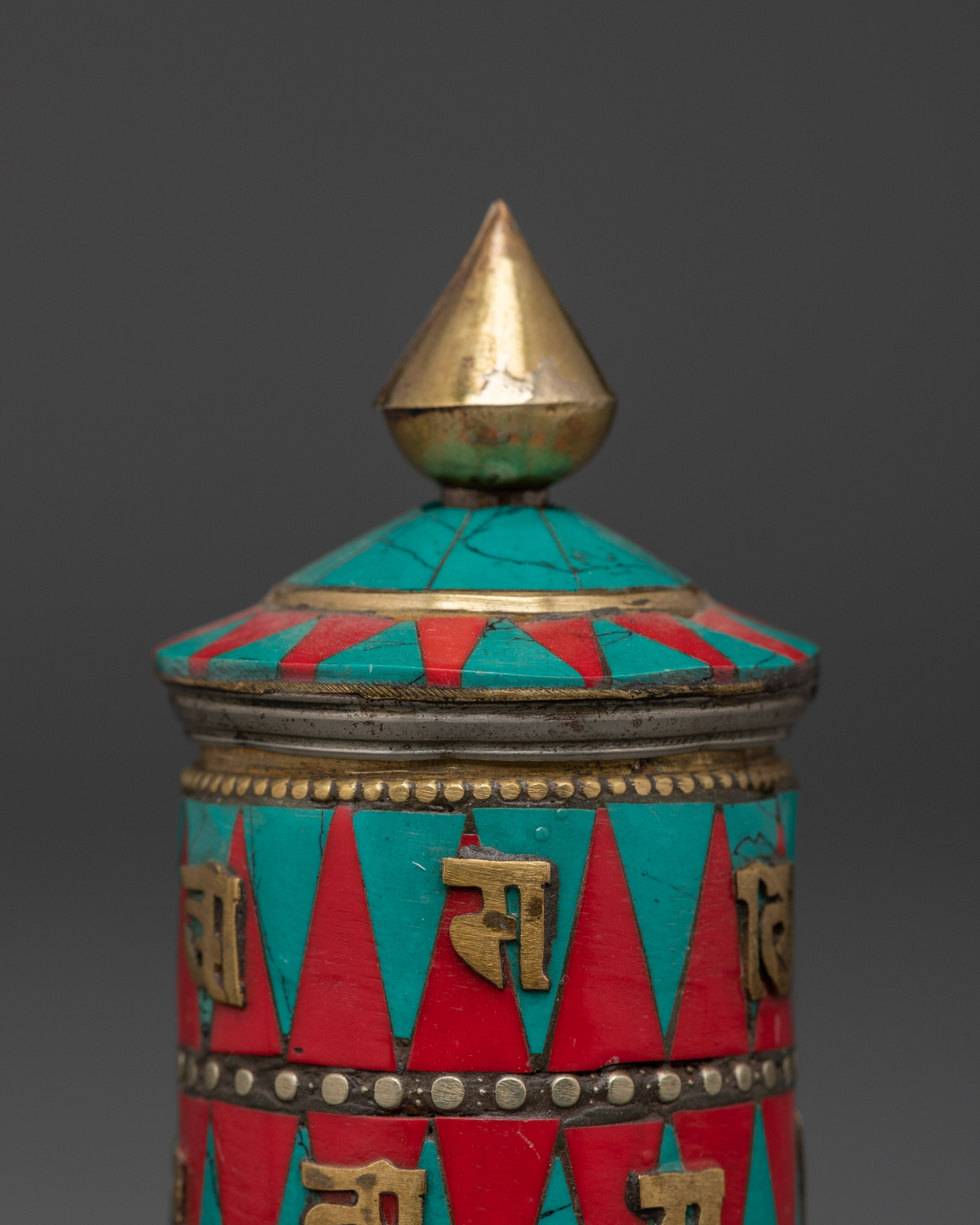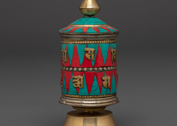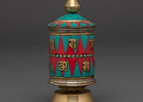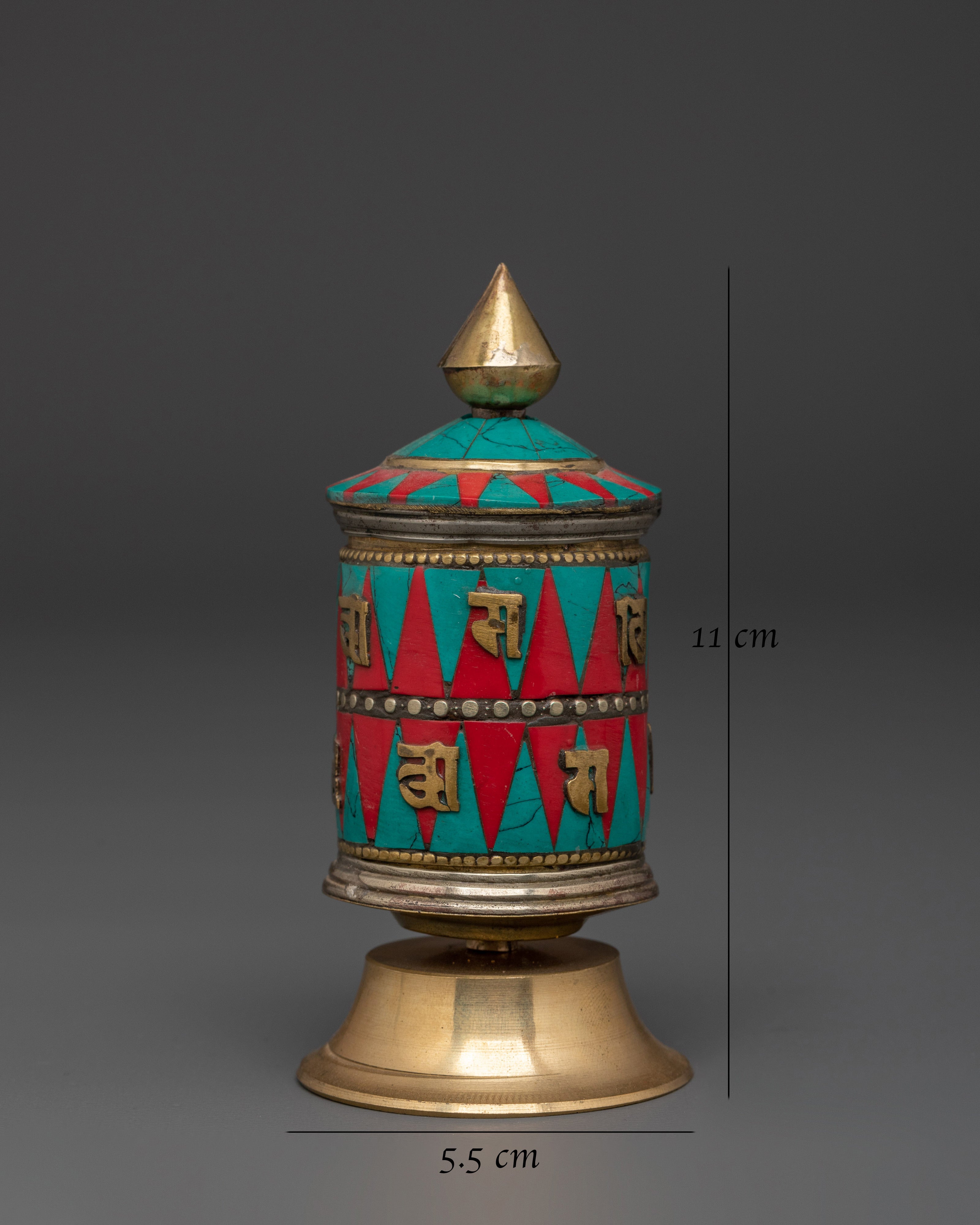 This Spiritual Tibetan Decor Prayer Wheel is a sacred depiction of peace, compassion, and mindfulness with profound roots in Tibetan Buddhist traditions. This handcrafted piece is 11cm tall, 5.5cm wide, and weighs 0.086kg. It is made of brass and features colorful coral and turquoise inlays. Its circular form features the spiritual chant "Om Mani Padme Hum," which represents the union of wisdom and compassion. Turning this wheel while meditating or praying is thought to release positive energy, cleanse the mind, and accumulate spiritual merit.