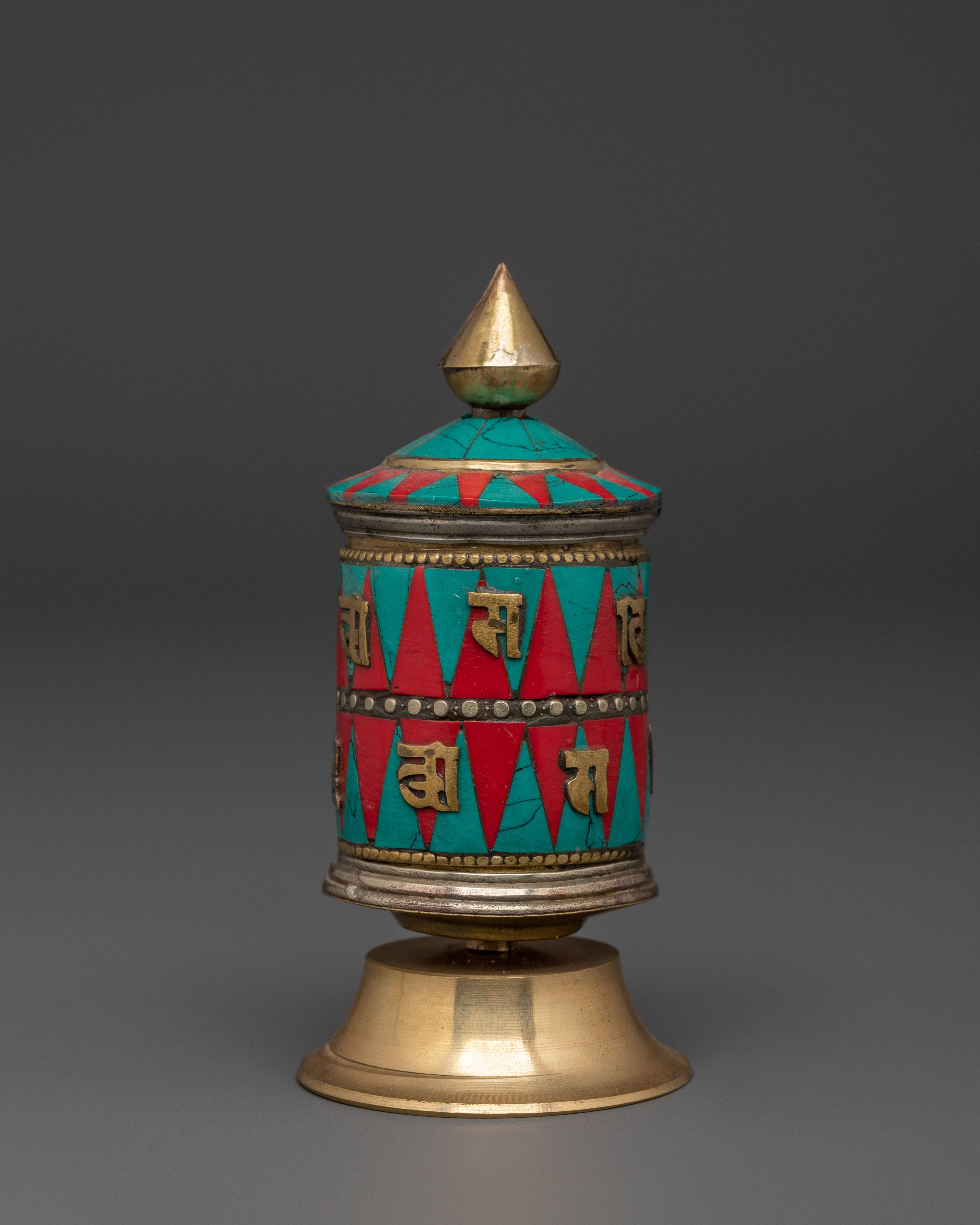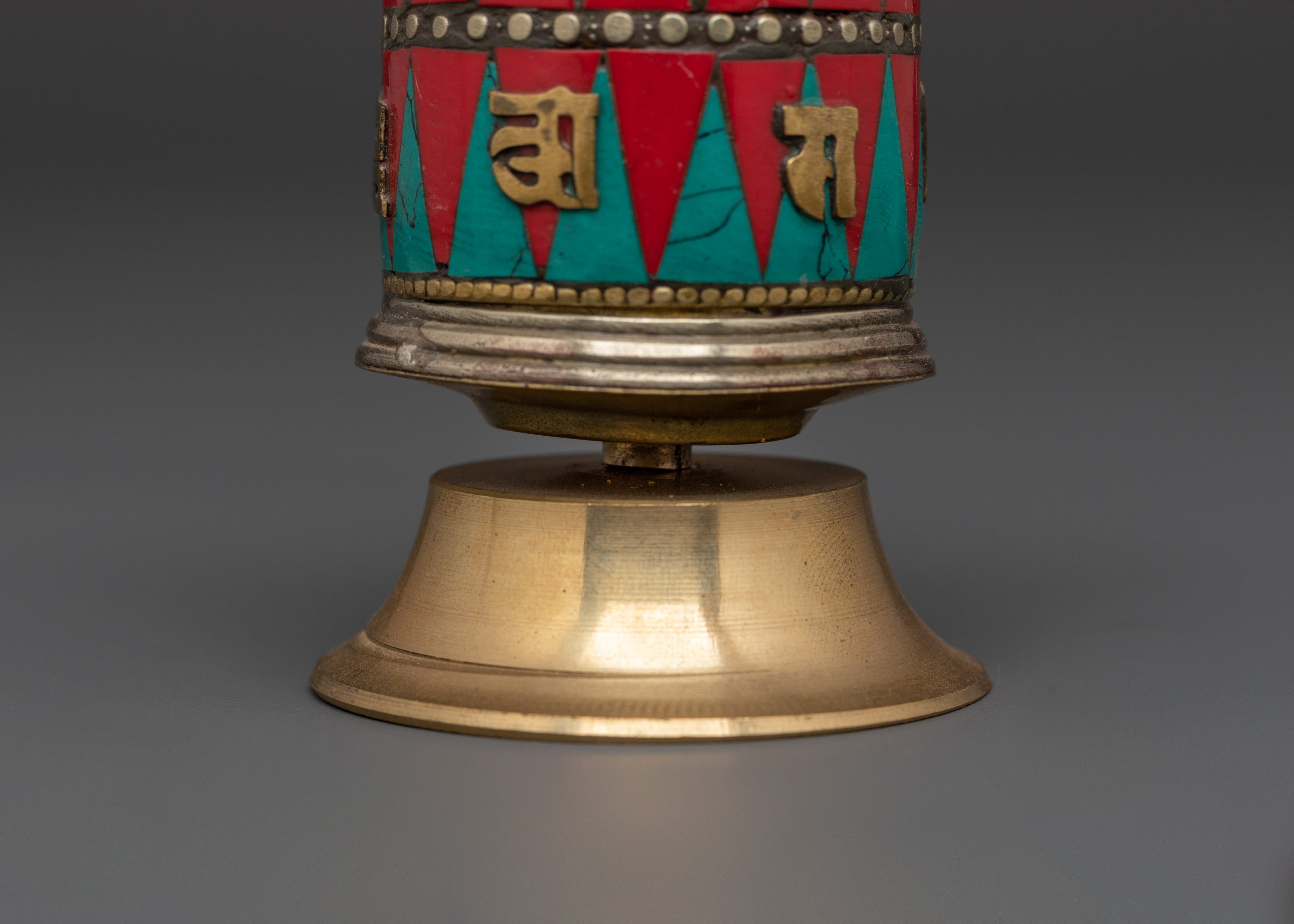 The complex craftsmanship encapsulates the splendor of Himalayan artistry, with beautiful coral and turquoise stones forming a vibrant geometric pattern around the copper-colored surface. The golden brass base provides a strong foundation and enhances the design's mystical aura. Each phrase and detail carved into this Buddhist mantra wheel conveys a spiritual message, increasing its religious and ornamental significance. The top finial symbolizes enlightenment, leading practitioners to inner harmony and peace.