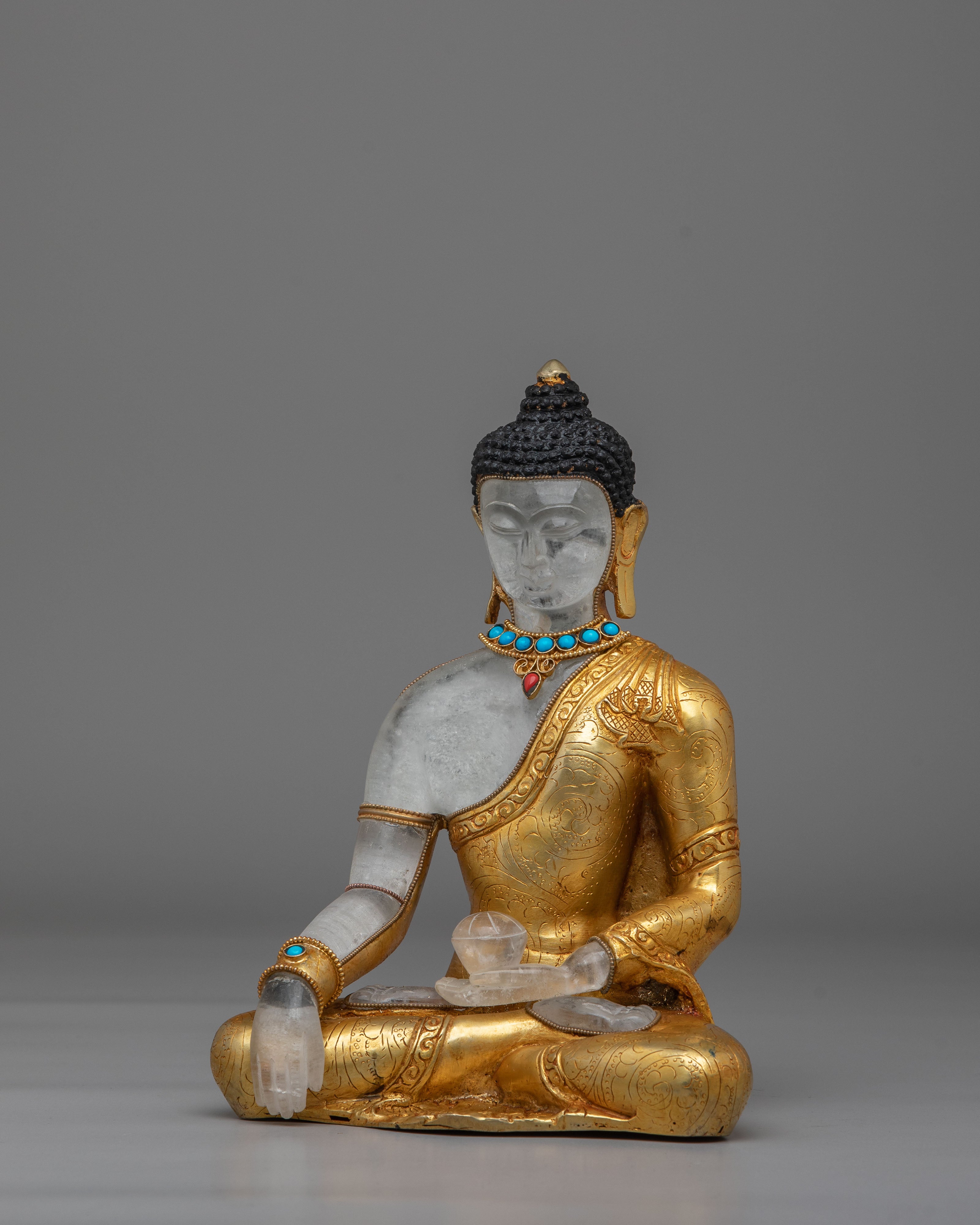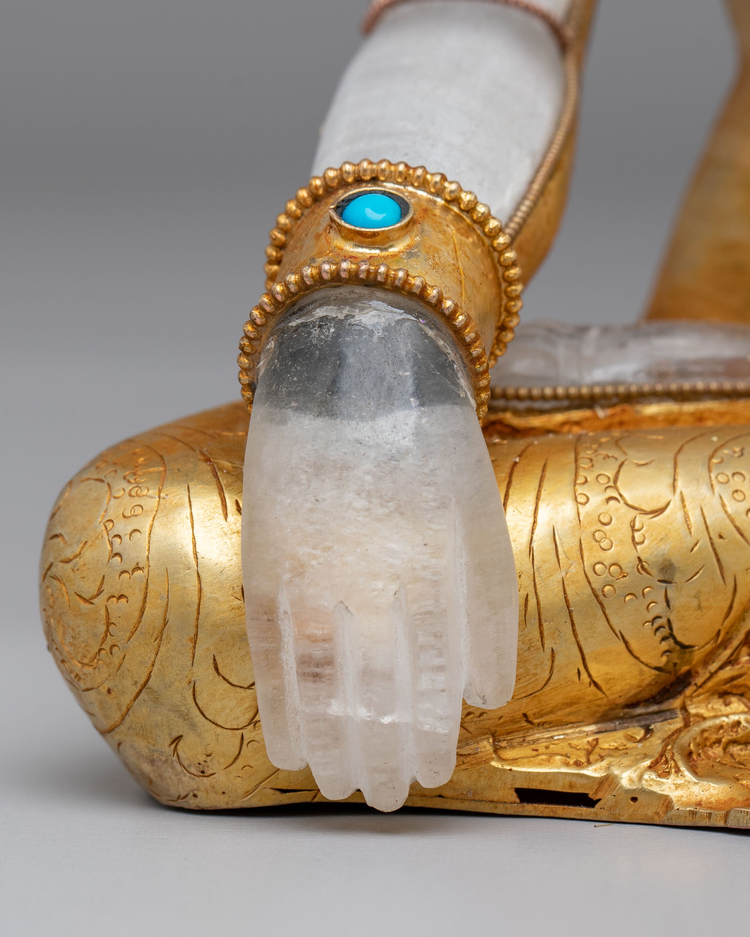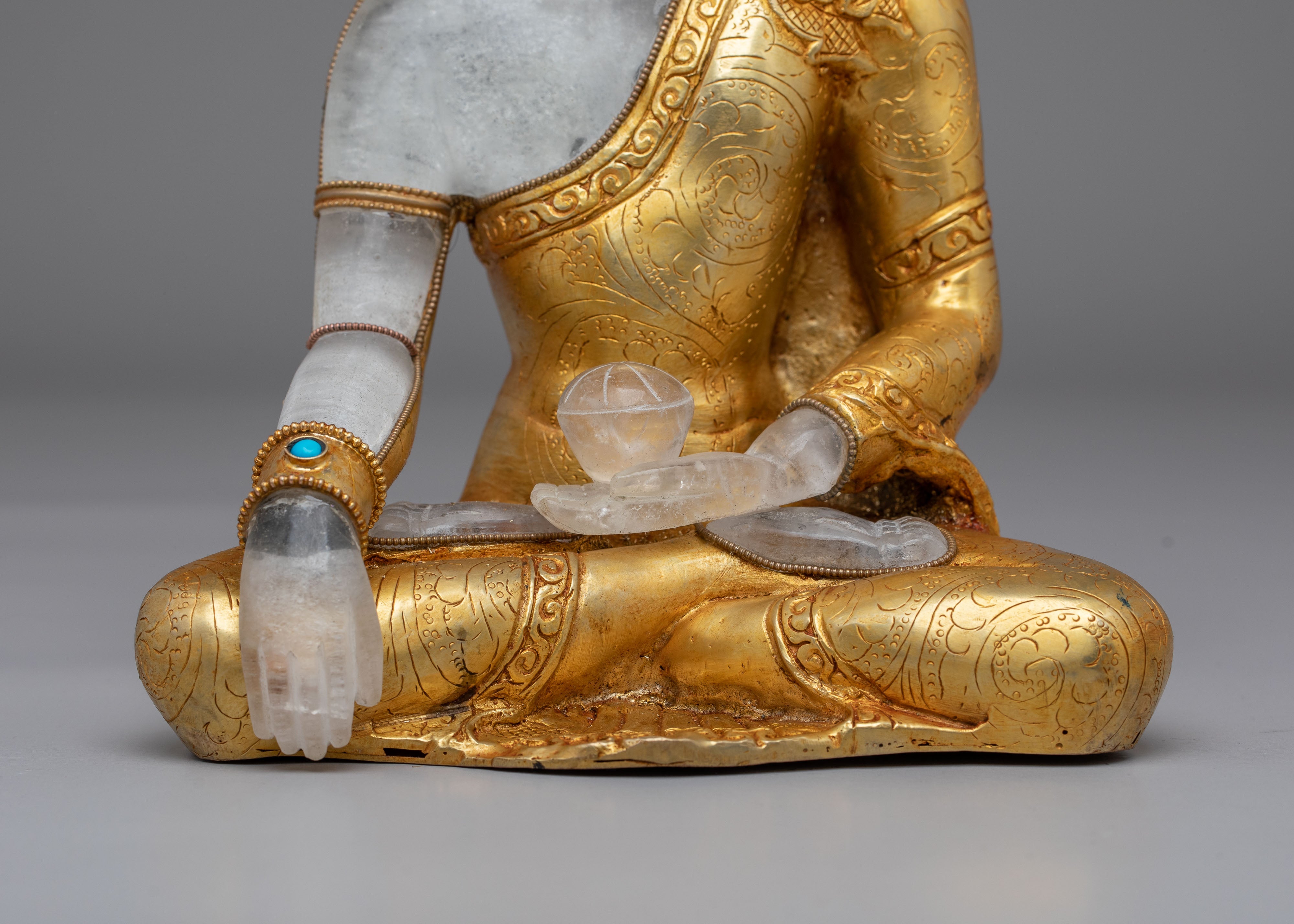 The statue depicts Shakyamuni Buddha, the historical Buddha, in a serene meditative posture that symbolizes enlightenment, inner peace, and awakening. Traditional Himalayan design elements are reflected in the calm facial expression, detailed robes, and symbolic hand gesture, representing wisdom, compassion, and mindfulness. The use of gemstones and crystal highlights sacred symbolism, while gold-plated details enhance its spiritual significance and traditional Buddhist aesthetic.