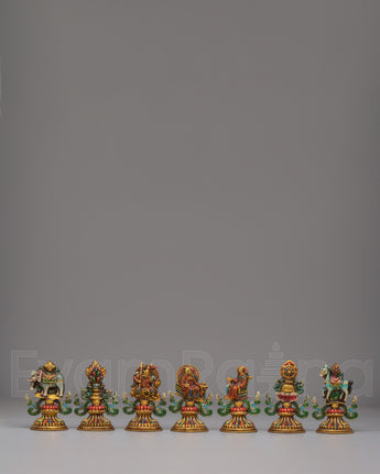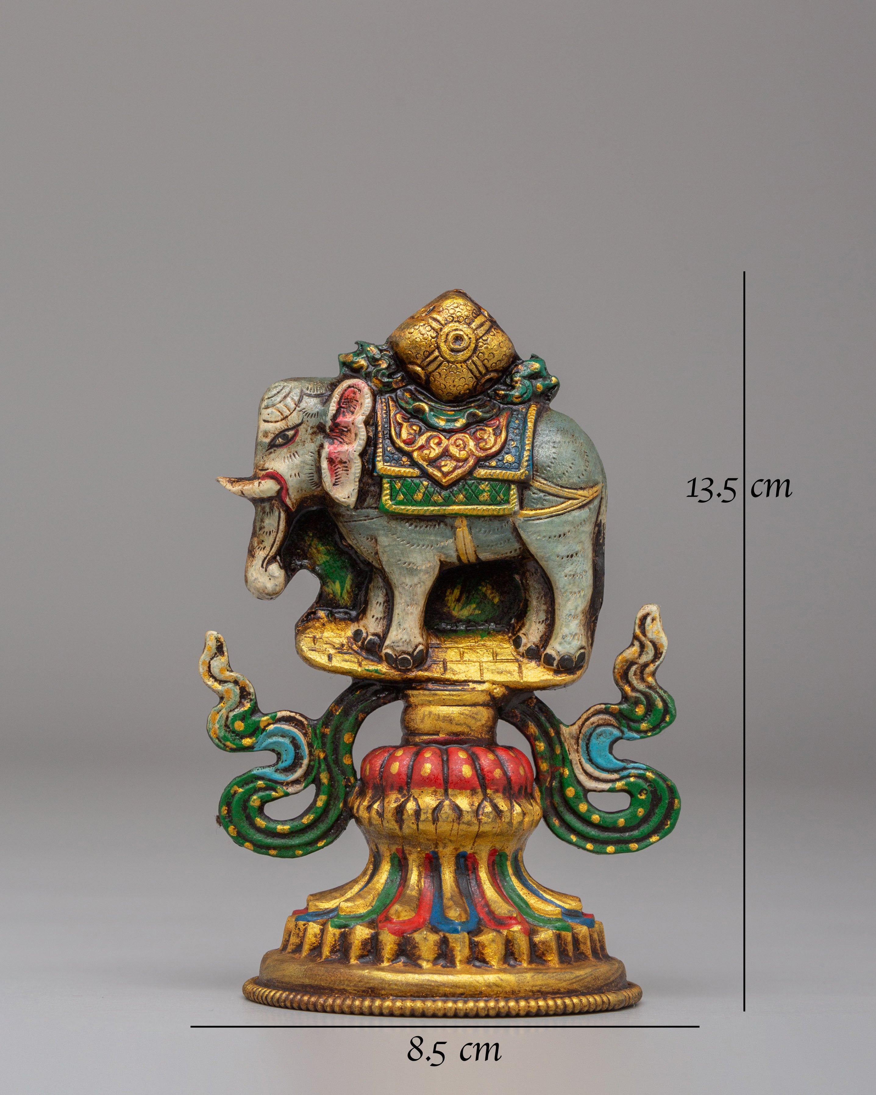 The Chakravartin King's Possessions set showcases traditional Tibetan workmanship and spiritual symbolism. These represent the royal treasures associated with the legendary Chakravartin King, revered as a symbol of universal sovereignty and enlightenment. Standing at 13.5 cm tall, each statue depicts a unique aspect of the king's possessions.