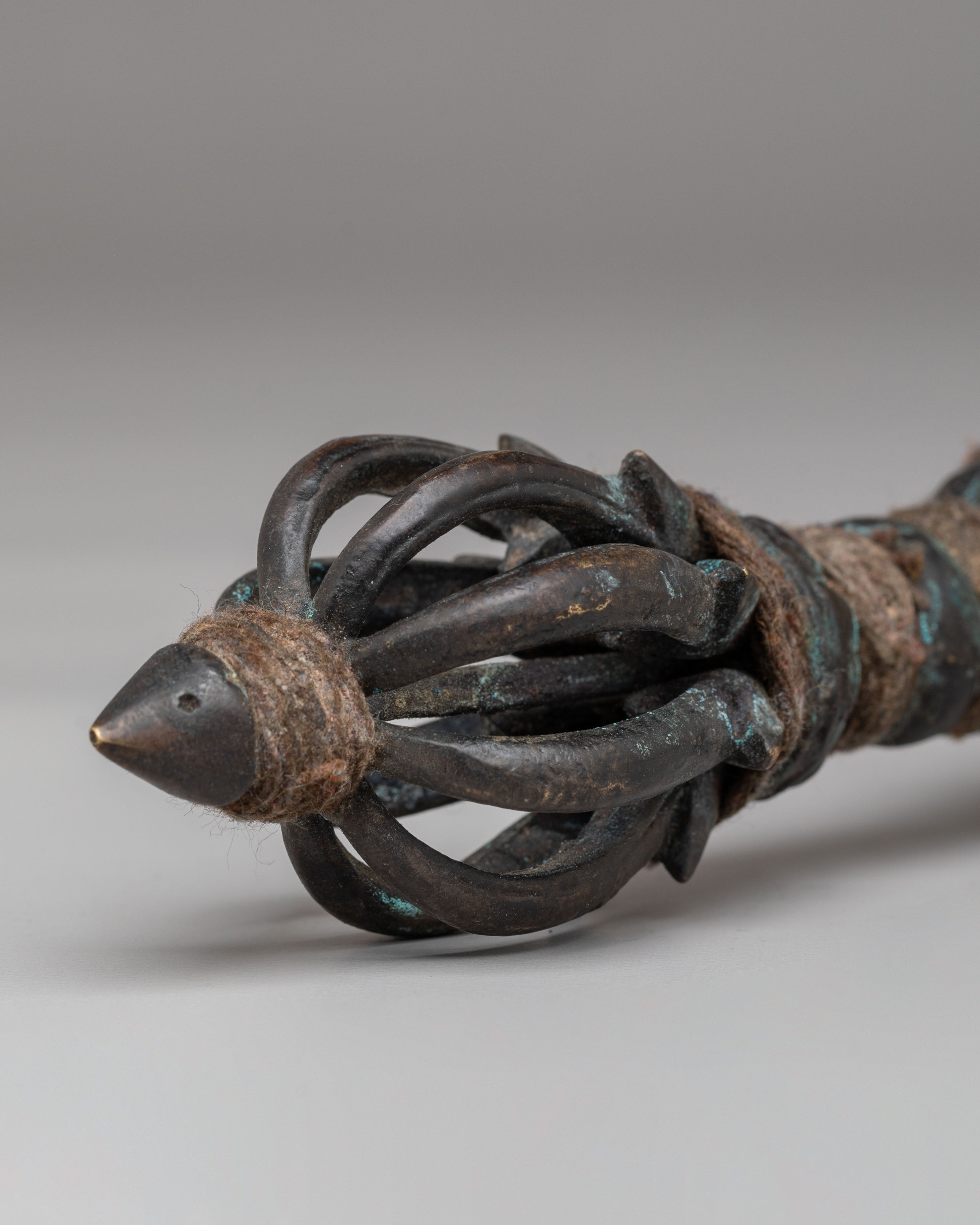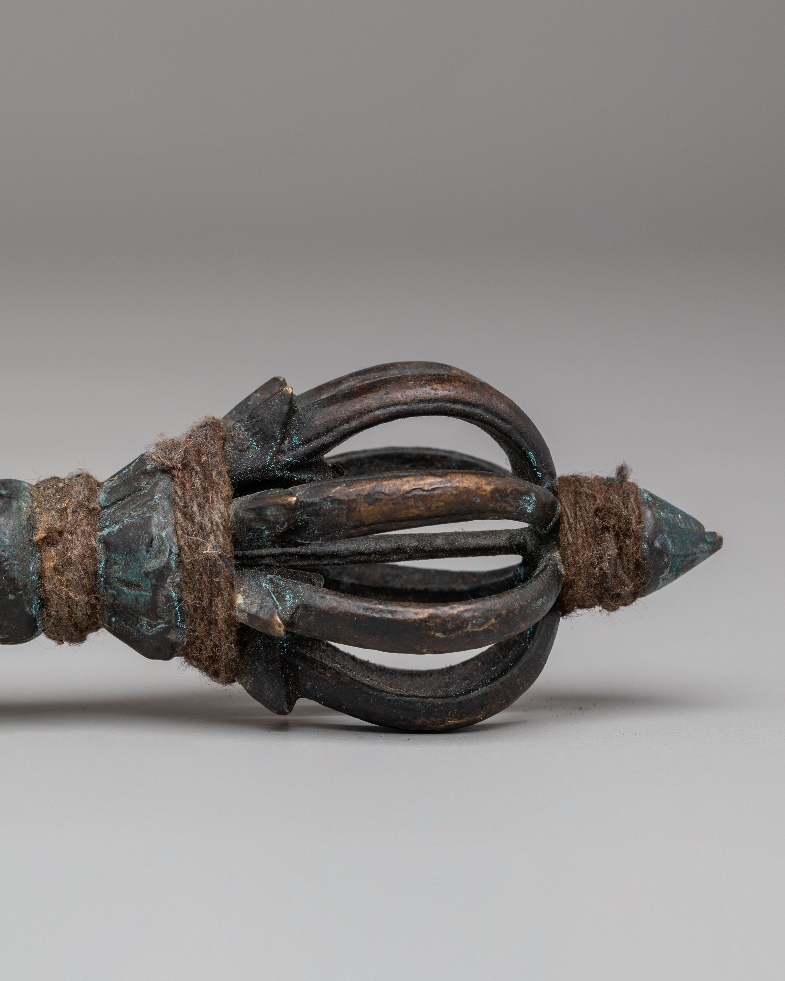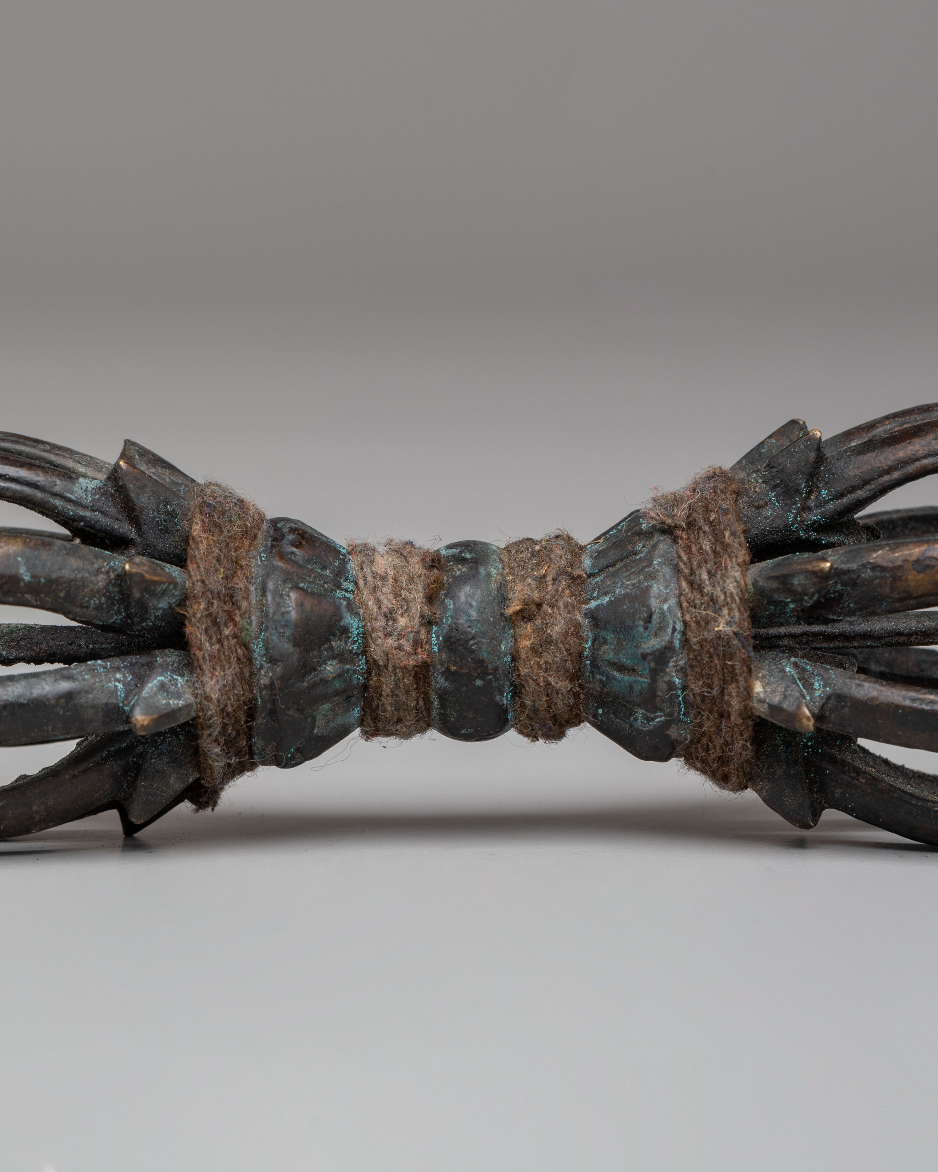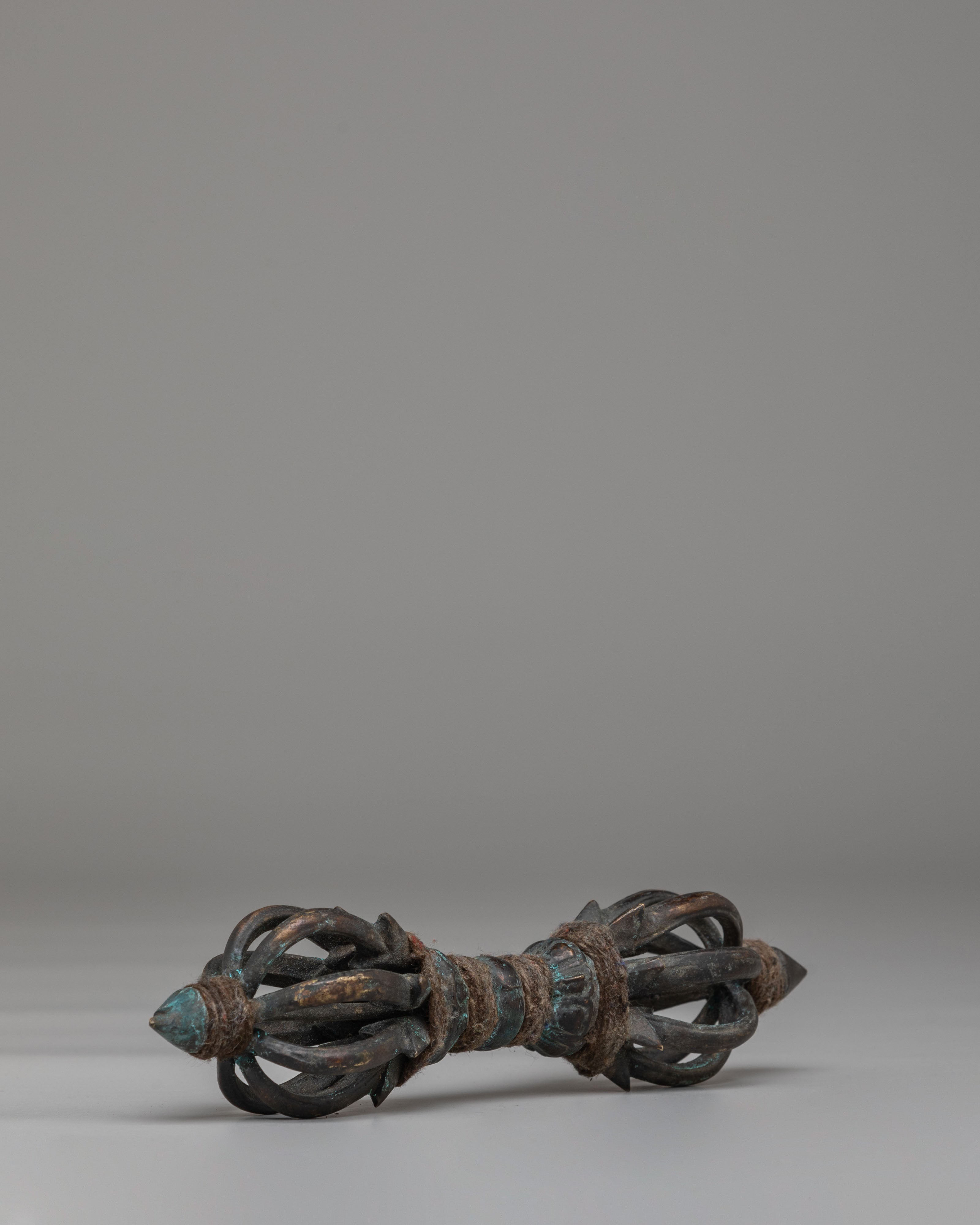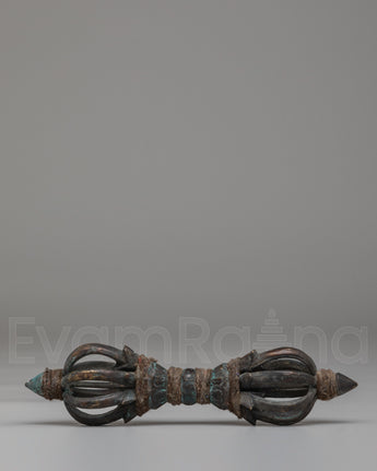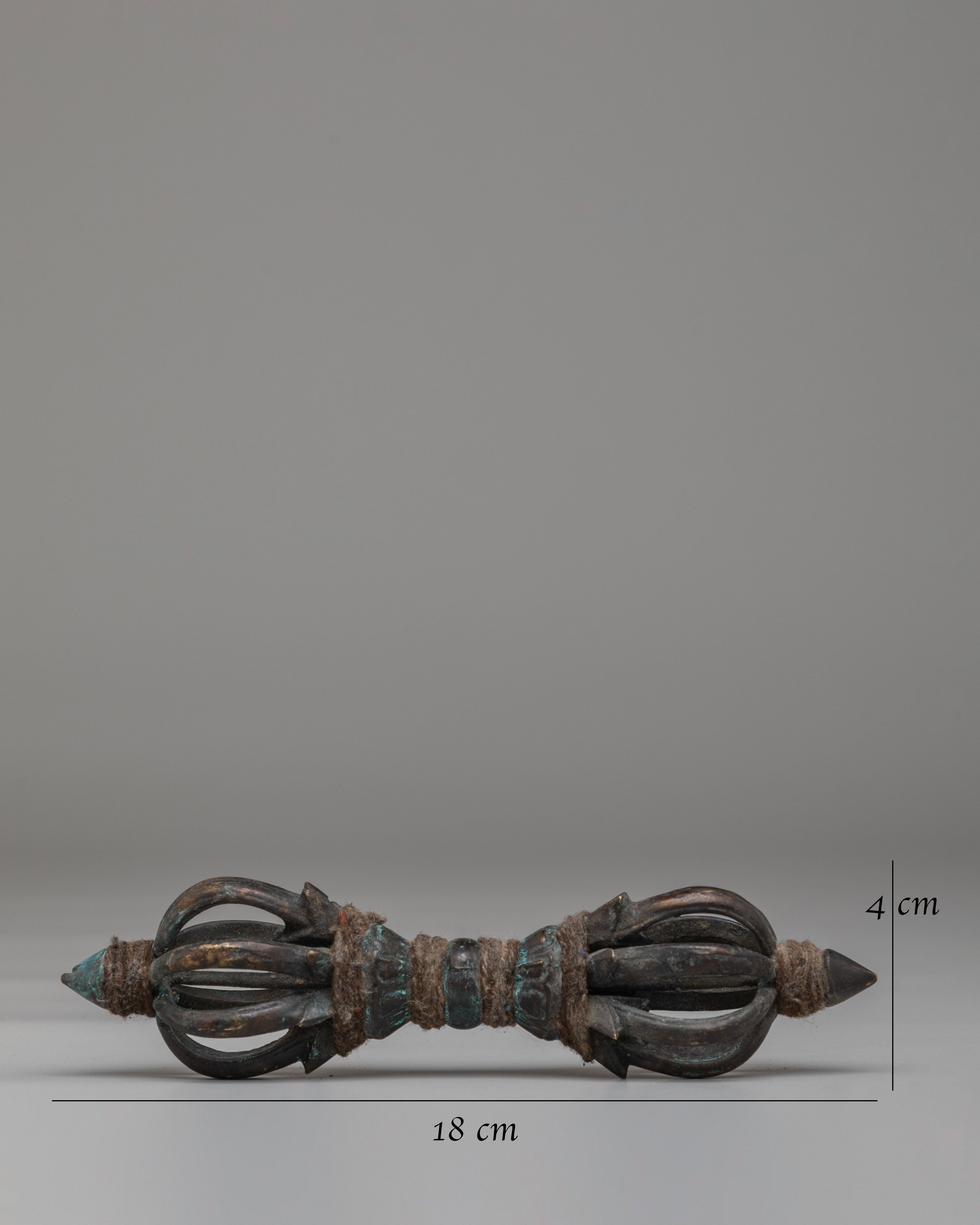 The brass material provides a warm, traditional tone, while the antique finish enhances the Dorje's spiritual presence, reflecting centuries of Tibetan craftsmanship. The sharp points at each end symbolize the ability to cut through ignorance, and the central body represents the unshakable nature of spiritual truth. This Tibetan Dorje is commonly used in rituals to create a sacred space, offer protection, and bring clarity and wisdom to spiritual practices.
