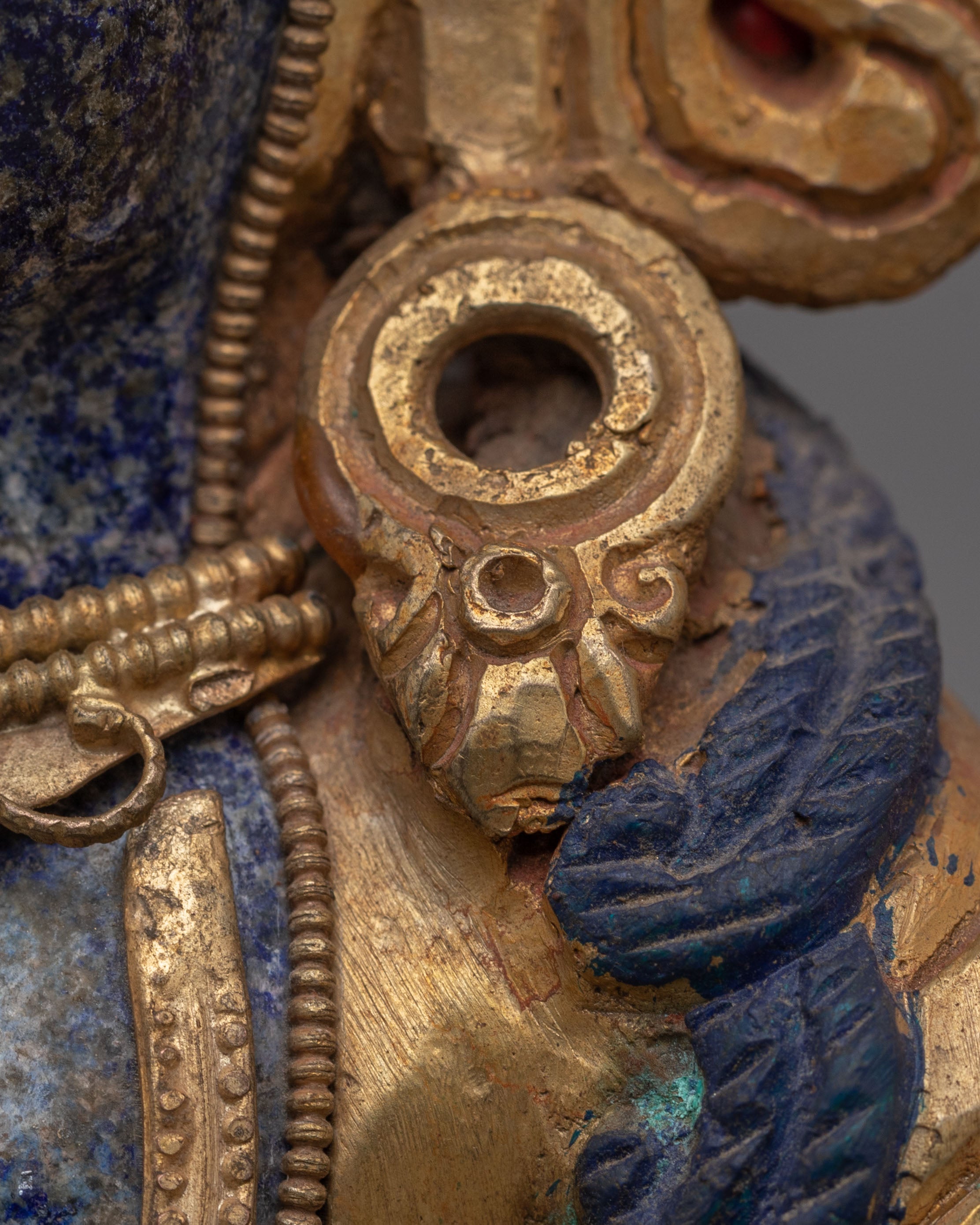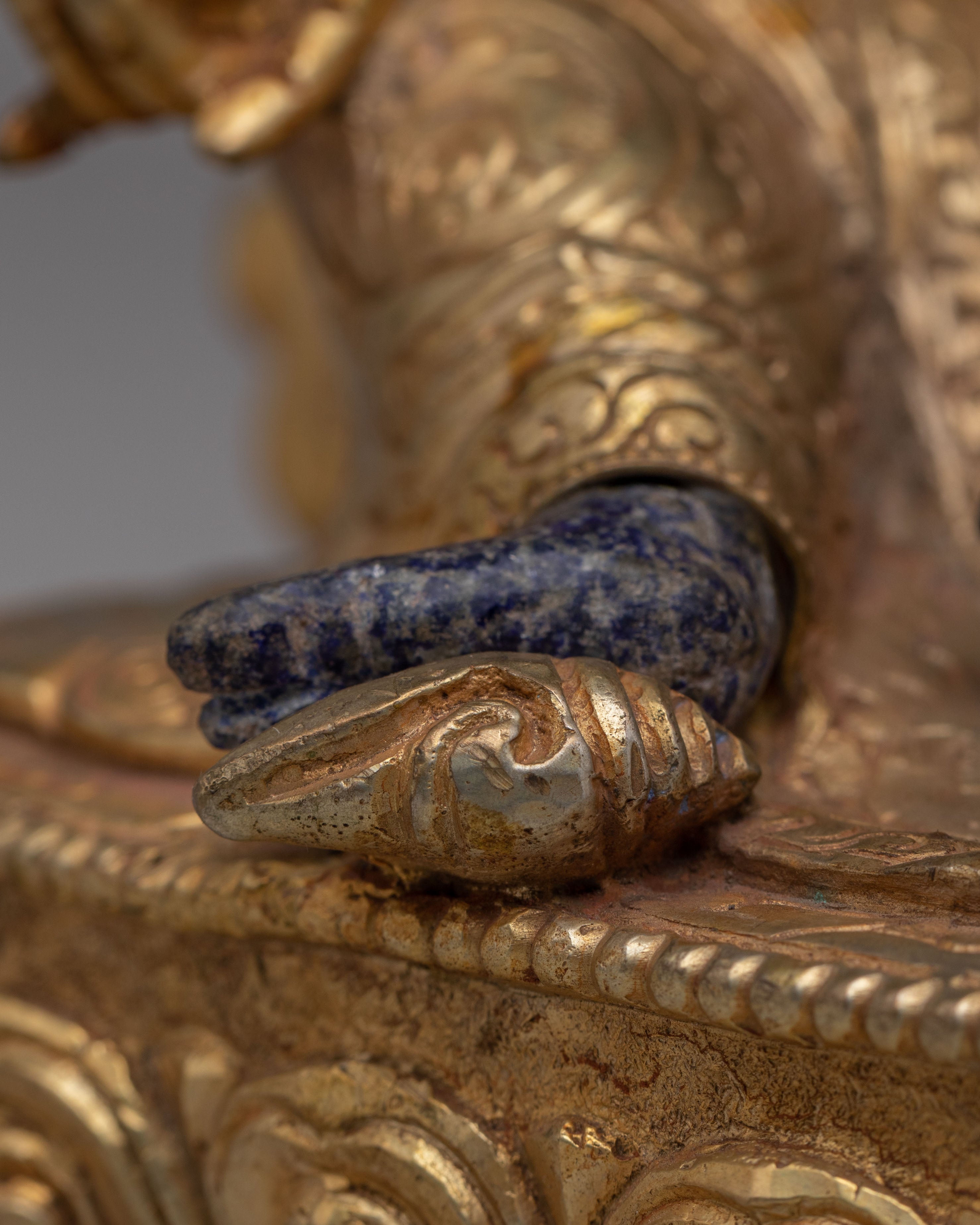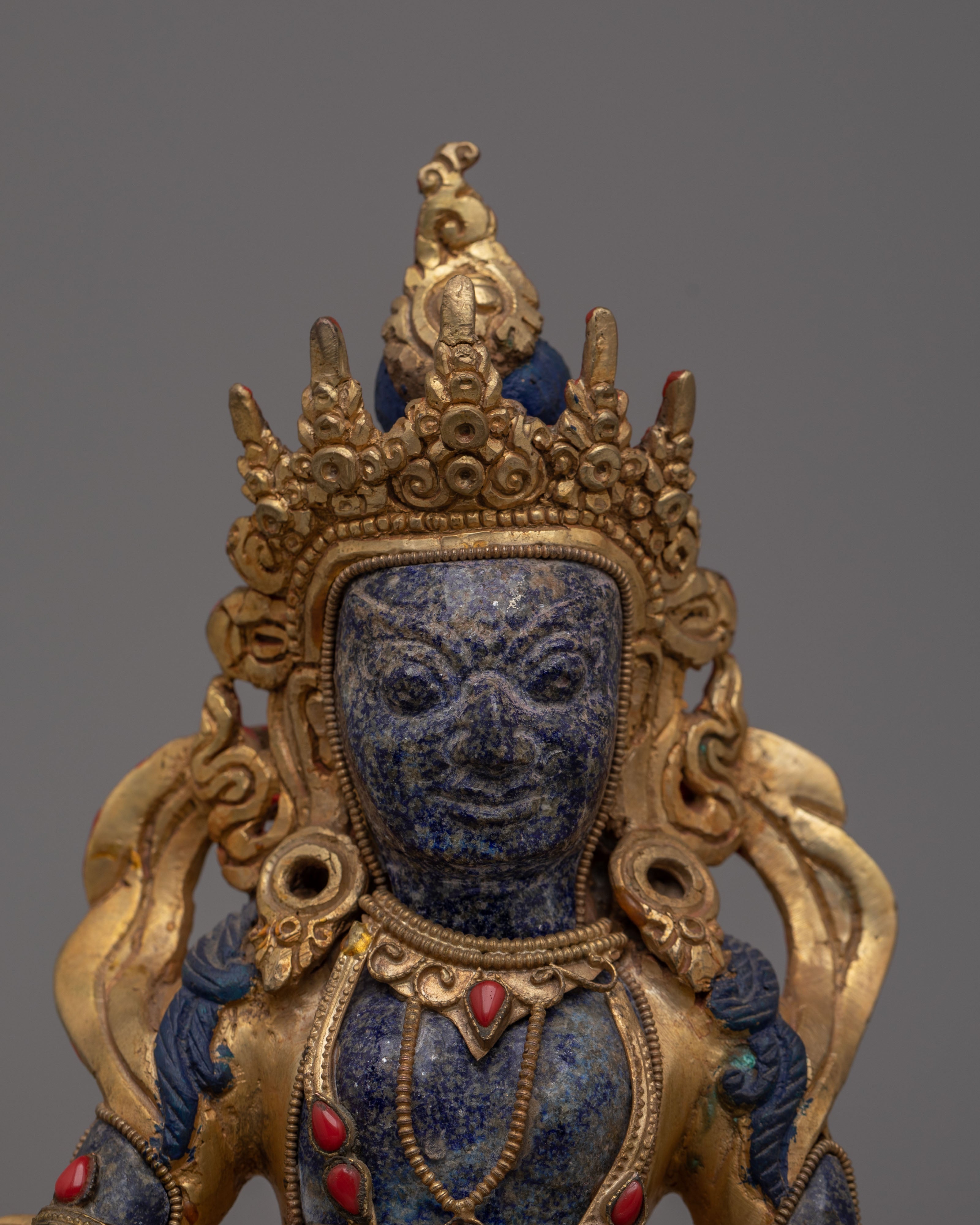 The Lapis Stone Dzambhala Statue features intricate detailing, with vibrant acrylic colors highlighting the texture of his robes and the fine lines of his facial features. His hands often hold a wish-fulfilling jewel, symbolizing his ability to grant desires and attract wealth. The copper elements further enhance the statue's spiritual energy, creating a powerful focal point in any space. The combination of lapis lazuli, copper, and gemstones enhances the statue's visual appeal and spiritual power, making it an asset for those seeking material and spiritual abundance.