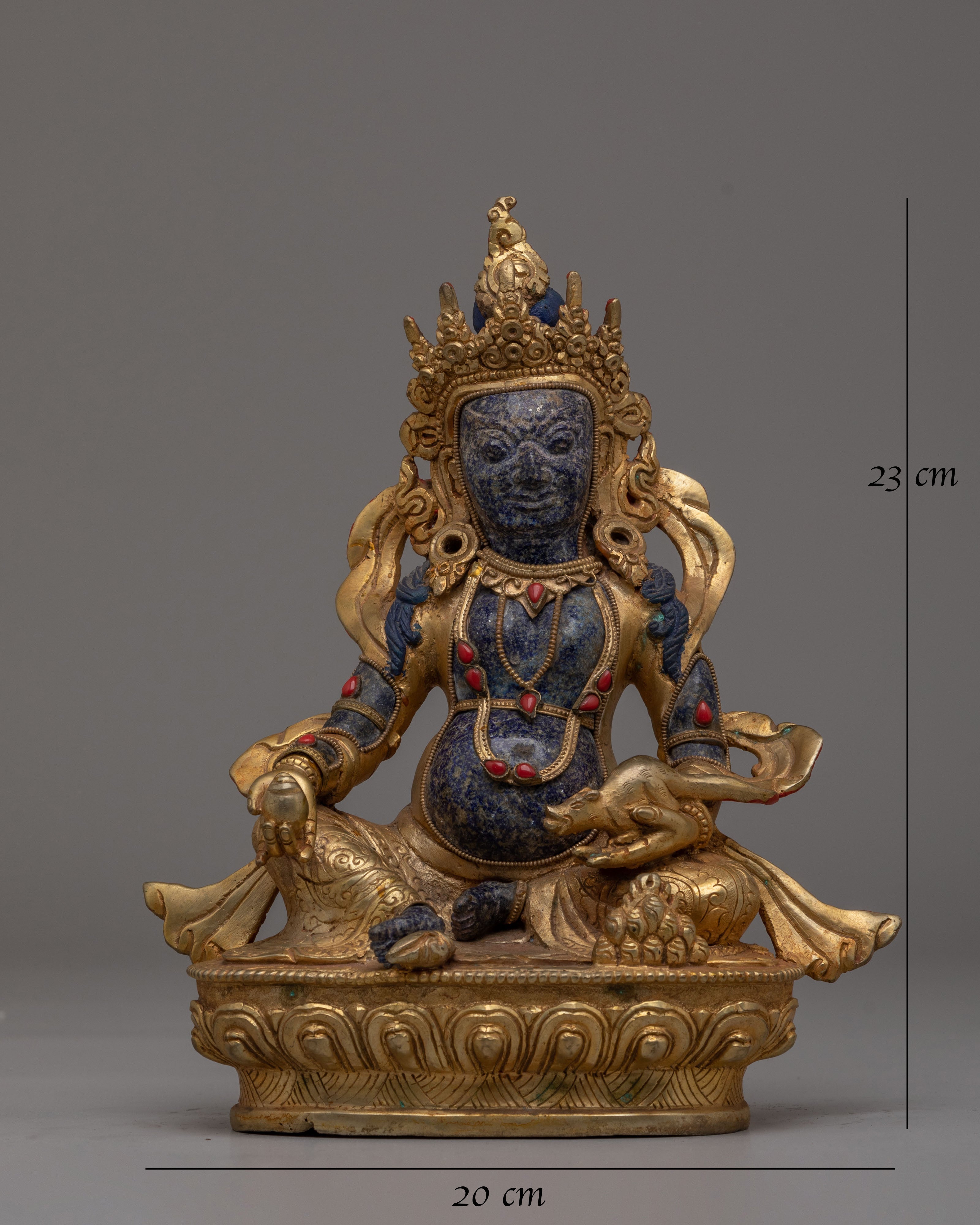 The Lapis Stone Dzambhala Statue is a captivating and spiritually significant representation of Dzambhala, the Buddhist deity of wealth, prosperity, and abundance. Standing 23 cm tall and weighing 1.84 kg, this statue is crafted from lapis lazuli and copper, enhanced with acrylic paint and gemstones. Dzambhala is depicted in a dynamic, protective pose, underscoring his role as a bringer of good fortune and material wealth. The rich blue hues of the lapis stone symbolize wisdom and clarity, while the copper body adds a warm, divine touch. This statue is ideal for enhancing your home, altar, or meditation space, inviting blessings of prosperity, success, and spiritual growth.