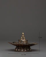 This Buddha Incense Holder is ideal for burning stick incense, loose incense, or tiny aromatic offerings, gathering ashes, and diffusing soothing scents throughout your rituals. The harmonic blend of brass and copper demonstrates the traditional Tibetan design, while the seated Buddha represents enlightenment and mindfulness. This incense holder is an essential tool for creating a relaxing environment during prayer or meditation, making it ideal for practitioners and fans of Buddhist art. Use it to cleanse your surroundings, attract positive energy, and reconnect with your spiritual practice.