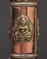 The Buddhist Incense Container is a beautifully constructed object combining utility and spiritual beauty. Standing 21.5 cm tall and 3 cm wide, this incense holder is copper and brass, giving it a typical Tibetan appearance. It weighs only 0.080 kg and is lightweight, making it excellent for travel or ceremonial use. The cylindrical shape and secure closure make it ideal for storing incense sticks on the go, keeping them fresh and protected from damage. This container, adorned with Buddha engravings and intricate patterns, is an essential accessory and a stunning piece of spiritual decor.