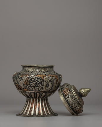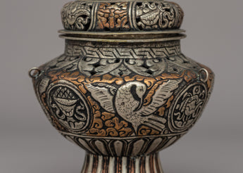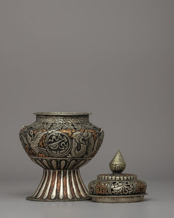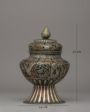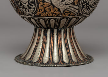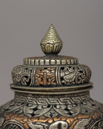 The beautiful hand-engraved Buddhist designs that decorate the body of this incense burner are sacred emblems of enlightenment and spiritual protection. The embossed auspicious symbols and floral designs honor Tibetan Buddhist creativity, while the intricate sacred script carvings lend a magical touch. Incense burning has long been an element of spiritual offerings, meditation, and cleansing rites, eliminating negativity and the welcome of divine gifts. Whether used for everyday meditation, sacred rites, or home decor, this Buddhist incense burner is a profound and artistic statement of faith, peace, and dedication.