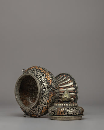 This elegant Buddhist ritual incense burner, made of excellent copper with a dazzling silver-plated finish, is 20cm in height and 14cm in breadth, making it an ideal addition to any home altar, temple, or meditation room. This thurible-style incense burner, which has traditionally been used in Buddhist ceremonies, provides for controlled incense burning, cleansing the surroundings while generating an environment of peace and dedication. The base and elaborate top design ensure safe and even burning, resulting in a utilitarian yet artistic ritual piece.
