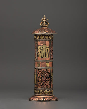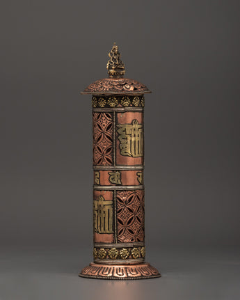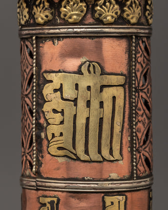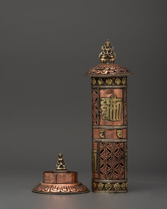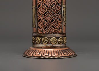 Incense burners, such as this one, have long been utilized in Tibetan ceremonies as symbols of cleansing and a means of giving prayers. The mantras written on the burner's body reflect holy chants that resonate with divine energy, providing calm and serenity to your surroundings. Crafted with precision and care, the copper and brass parts combine to create an incense burner that is useful and artistic, reflecting profound cultural importance. This incense burner is an essential addition to any Buddhist altar or meditation place, improving both the spiritual and visual environment.