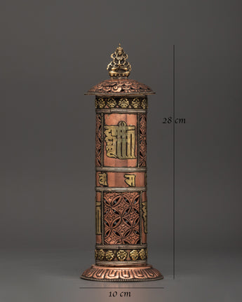 This Buddhist Incense Burner is made of copper and brass that can enhance your spiritual practice and home decor. Standing 28 cm tall and 10 cm wide, it has complex Tibetan mantras inscribed on the surface, providing a strong and relaxing aura. The burner is ideal for people looking to improve their meditation sessions or create a spiritual environment in their area.