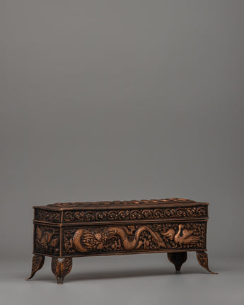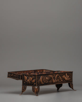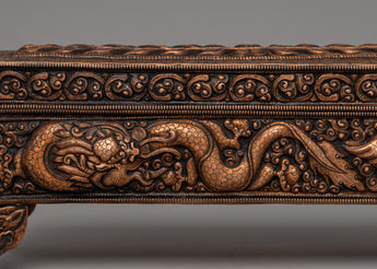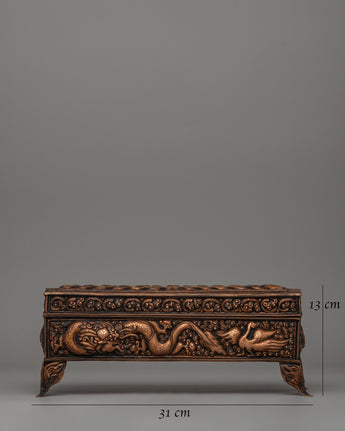 The Copper-Made Incense Burner is a stunning piece crafted from iron and brass. It features intricate floral carvings that enhance its visual appeal. At 13 cm high, 31 cm wide, and weighing 0.996 kg, the burner showcases detailed dragon carvings, symbolizing power and protection. These carvings are expertly integrated into the structure, adding a majestic and mystical touch. The floral details complement the mythical dragon motif, enriching the overall artistic design.