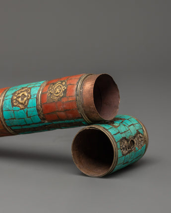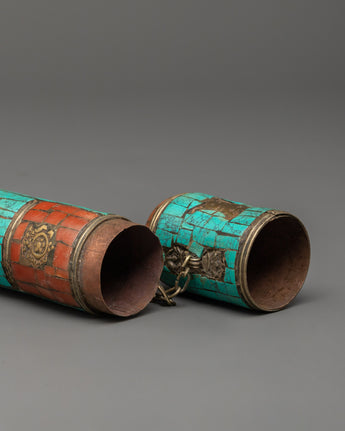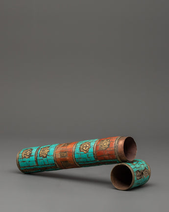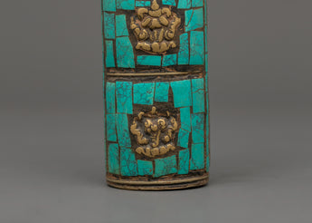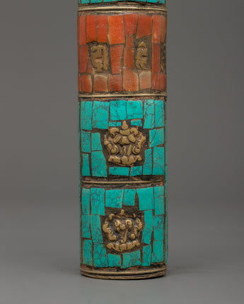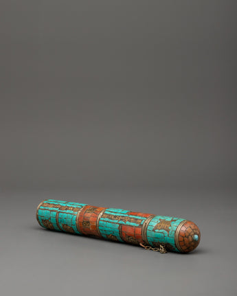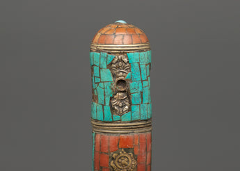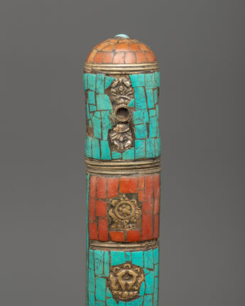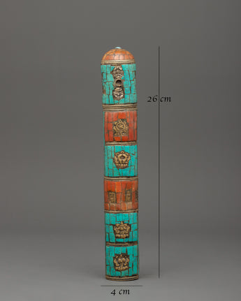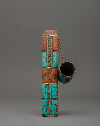 Bring divine elegance to your spiritual place with this Handcrafted Coral Inlaid Incense Holder, which has gorgeous turquoise and coral stones. This circular incense tube stands 26cm tall and is made of brass and copper. It is decorated with elaborate metalwork and symbolic Buddhist patterns. The hinged lid with chain allows for convenient use, while the wholly colored inlays make a stunning visual presence on any altar or meditation nook.