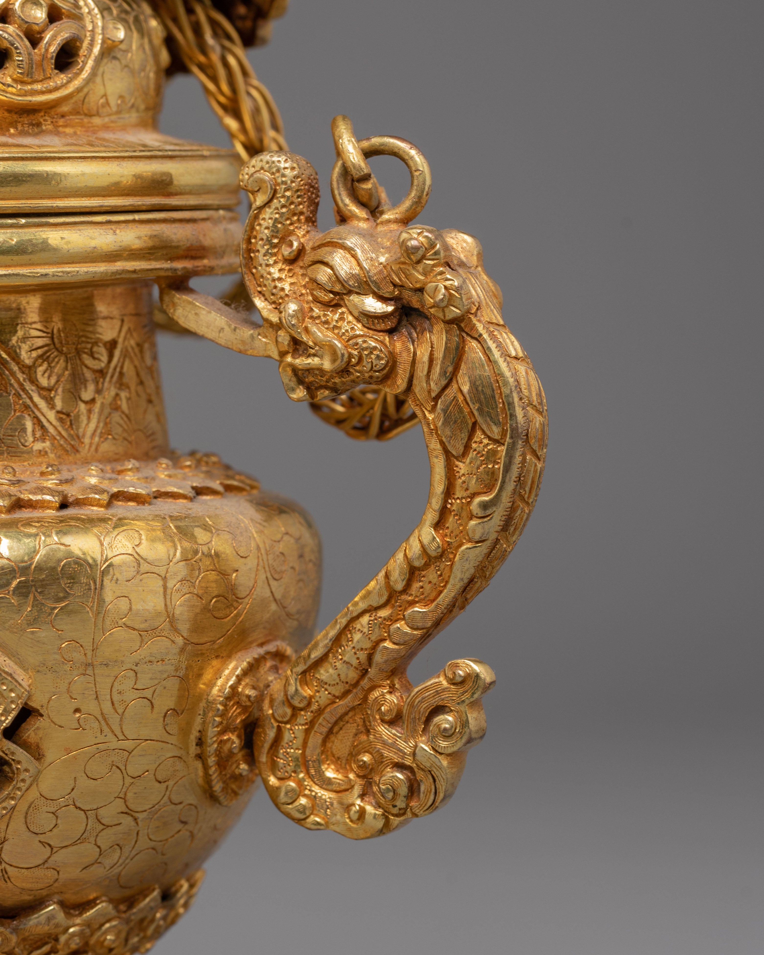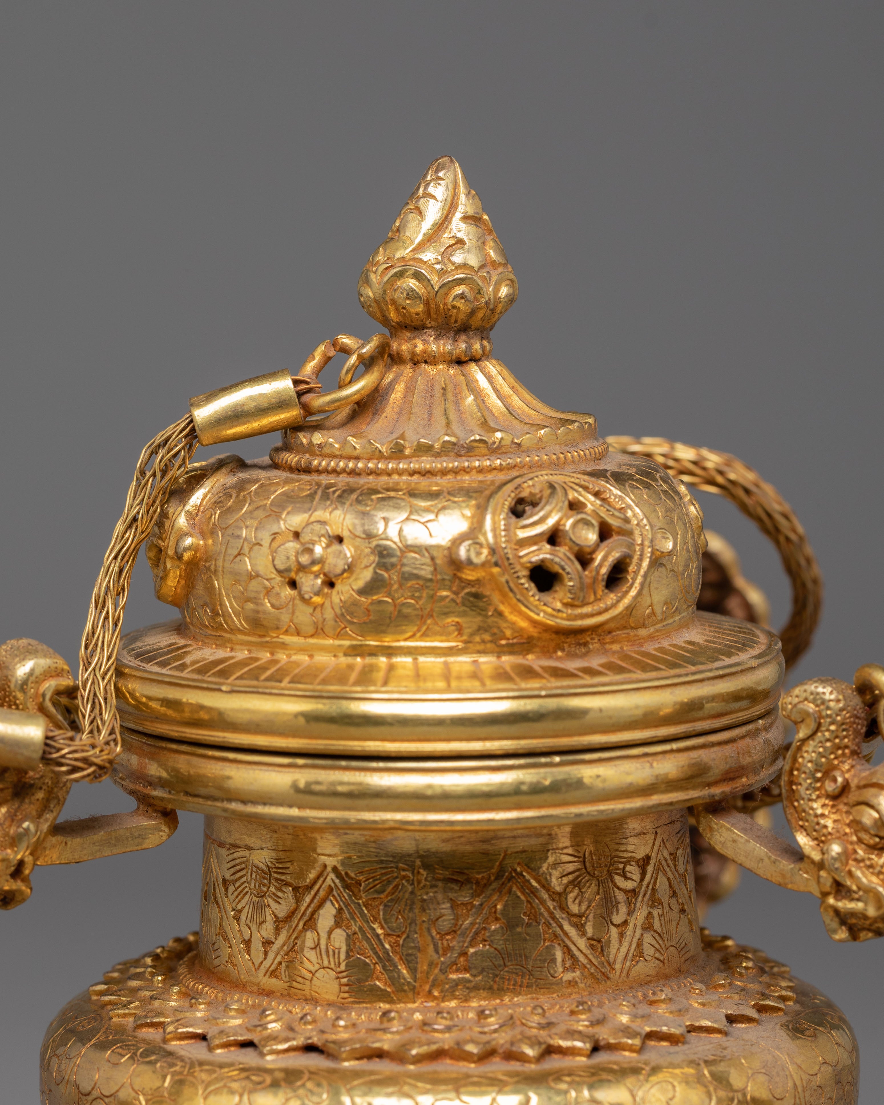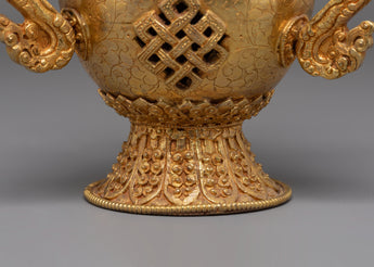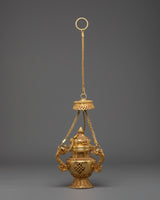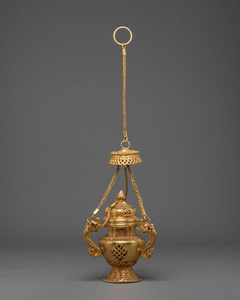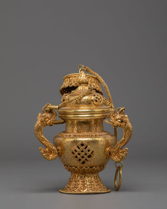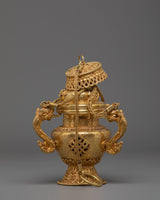The design of the incense burner showcases traditional motifs inspired by Tibetan and Hindu cultures. The two decorative handles on either side are gracefully shaped, adding a sense of balance and harmony to the piece. The detailed filigree work around the burner, as well as the lattice design, ensures that this burner isn't just a ritual object but a beautiful art piece. The gold plating reflects the light, creating a warm glow that complements any altar, meditation space, or home decor.