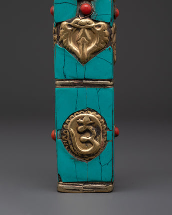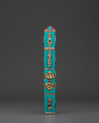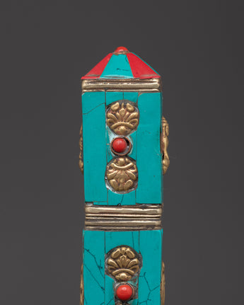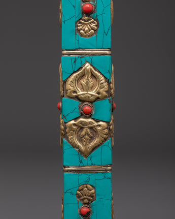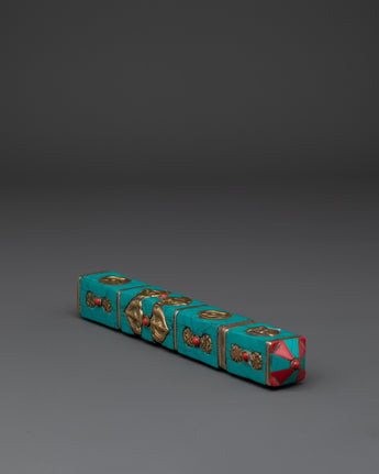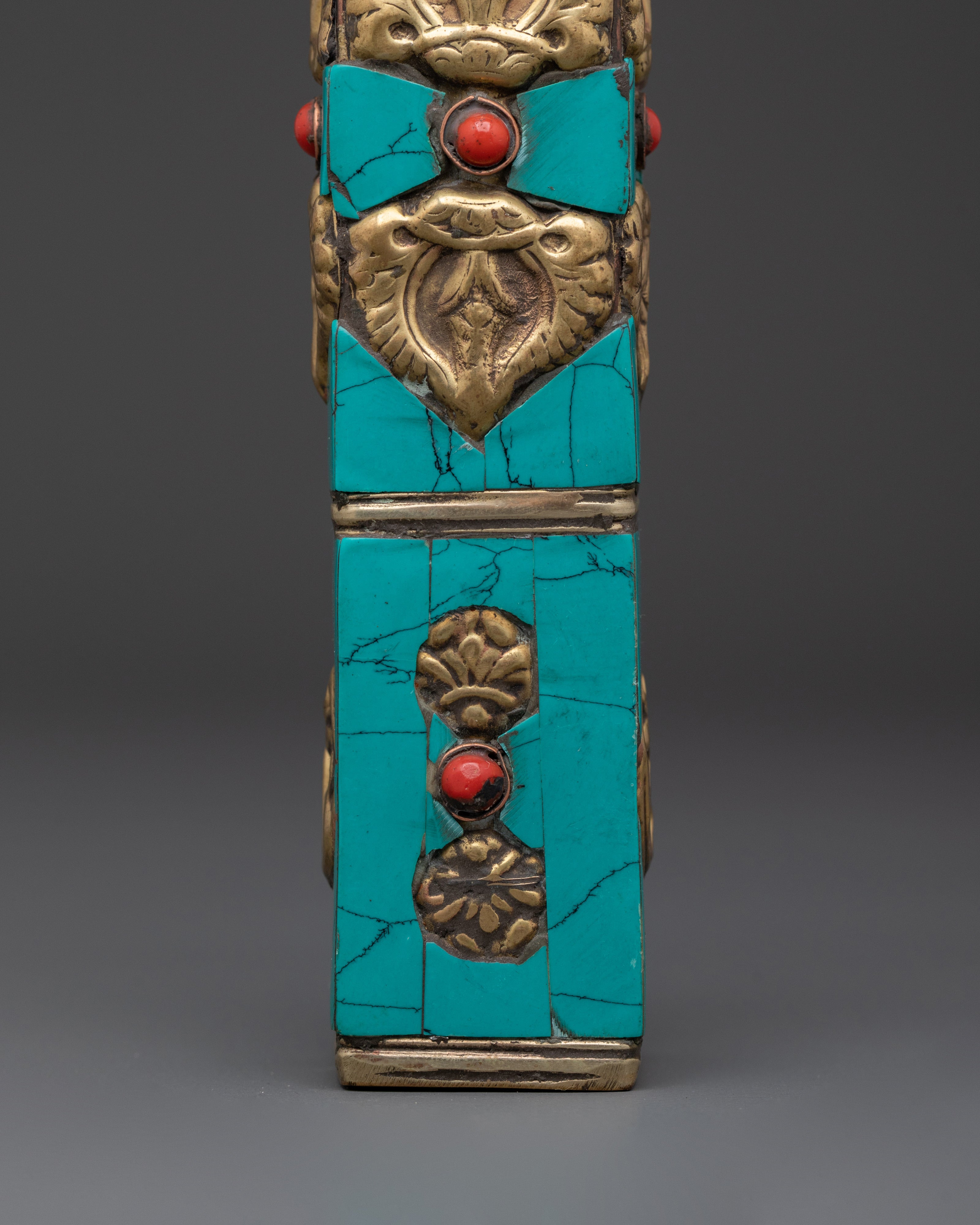 The incense burner is a vital element in Buddhist rituals, believed to purify the environment and the spirit. When incense is lit, the rising smoke symbolizes the offering of prayers to the divine, carrying wishes of peace, clarity, and enlightenment. The delicate craftsmanship and metalwork reflect traditional Himalayan artistry, where each curve and carving holds spiritual meaning. The turquoise and coral embellishments are more than decorative—they embody protection, healing, and spiritual awakening.