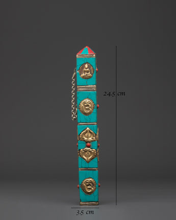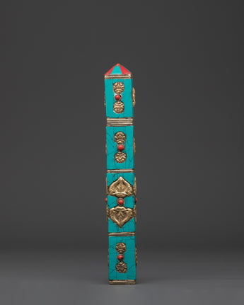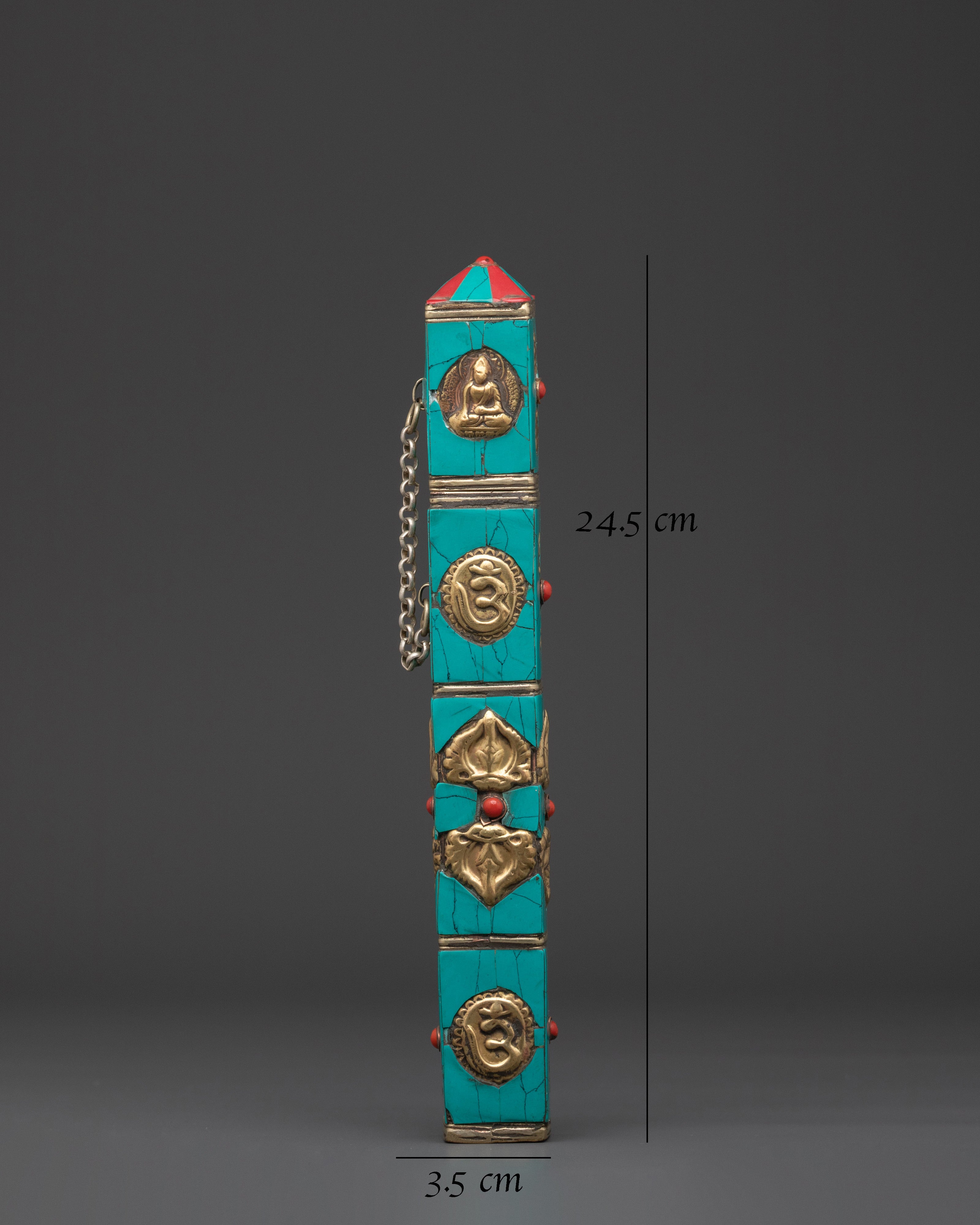 This Handcrafted Buddhist Incense Burner Peaceful measures 24.5cm in height and 3.5cm in width, making it an elegant piece suitable for any altar or meditation space. Crafted from brass and copper, it features intricate patterns highlighted with artificial turquoise and coral stones that symbolize wisdom and compassion in Tibetan culture. Weighing 0.15kg, it is lightweight yet stable—ideal for safely holding incense sticks during prayer or meditation sessions. Each material is thoughtfully chosen to represent the sacred balance between the elements, bringing harmony and peace to your surroundings.