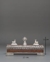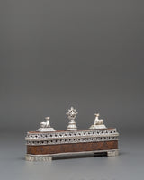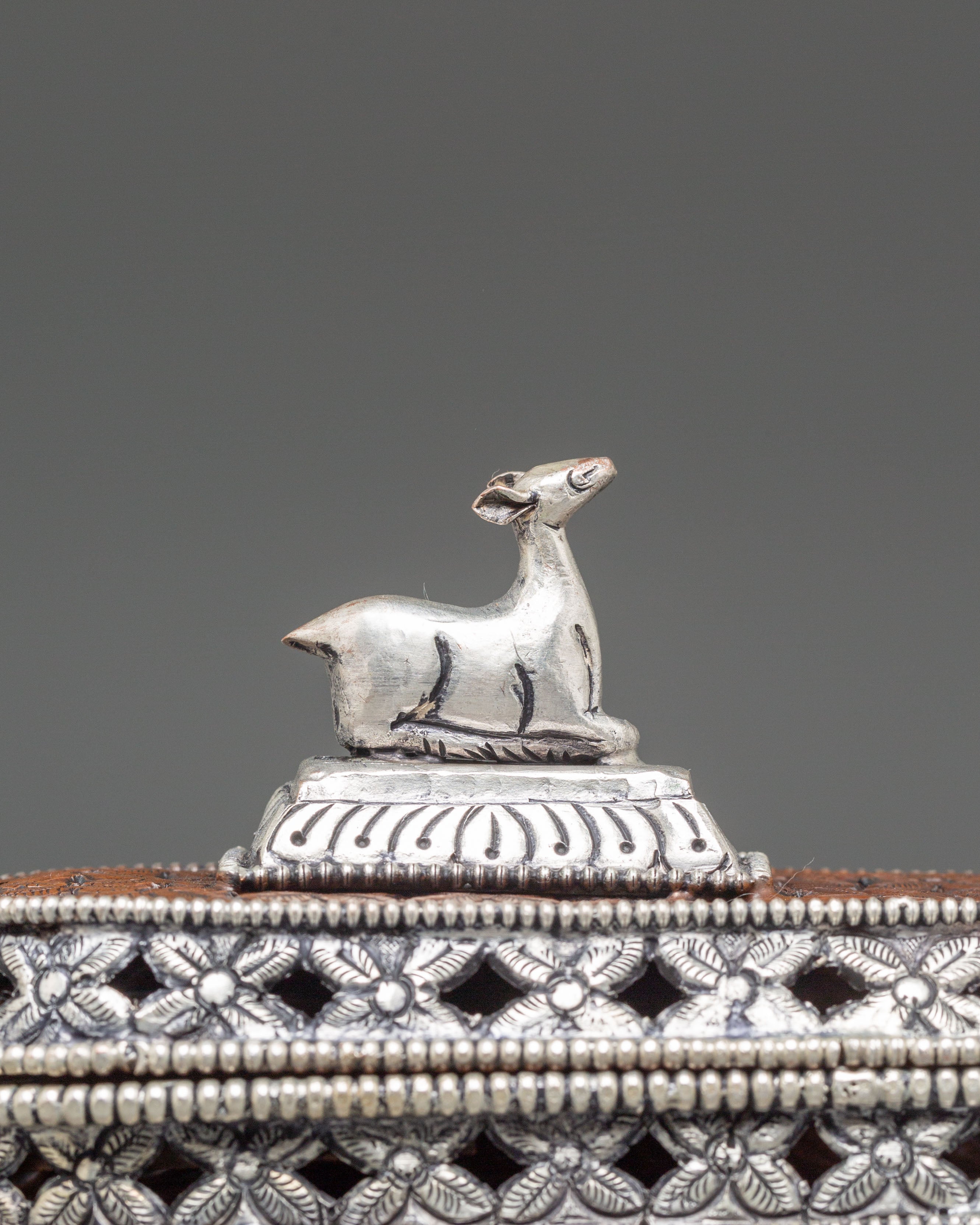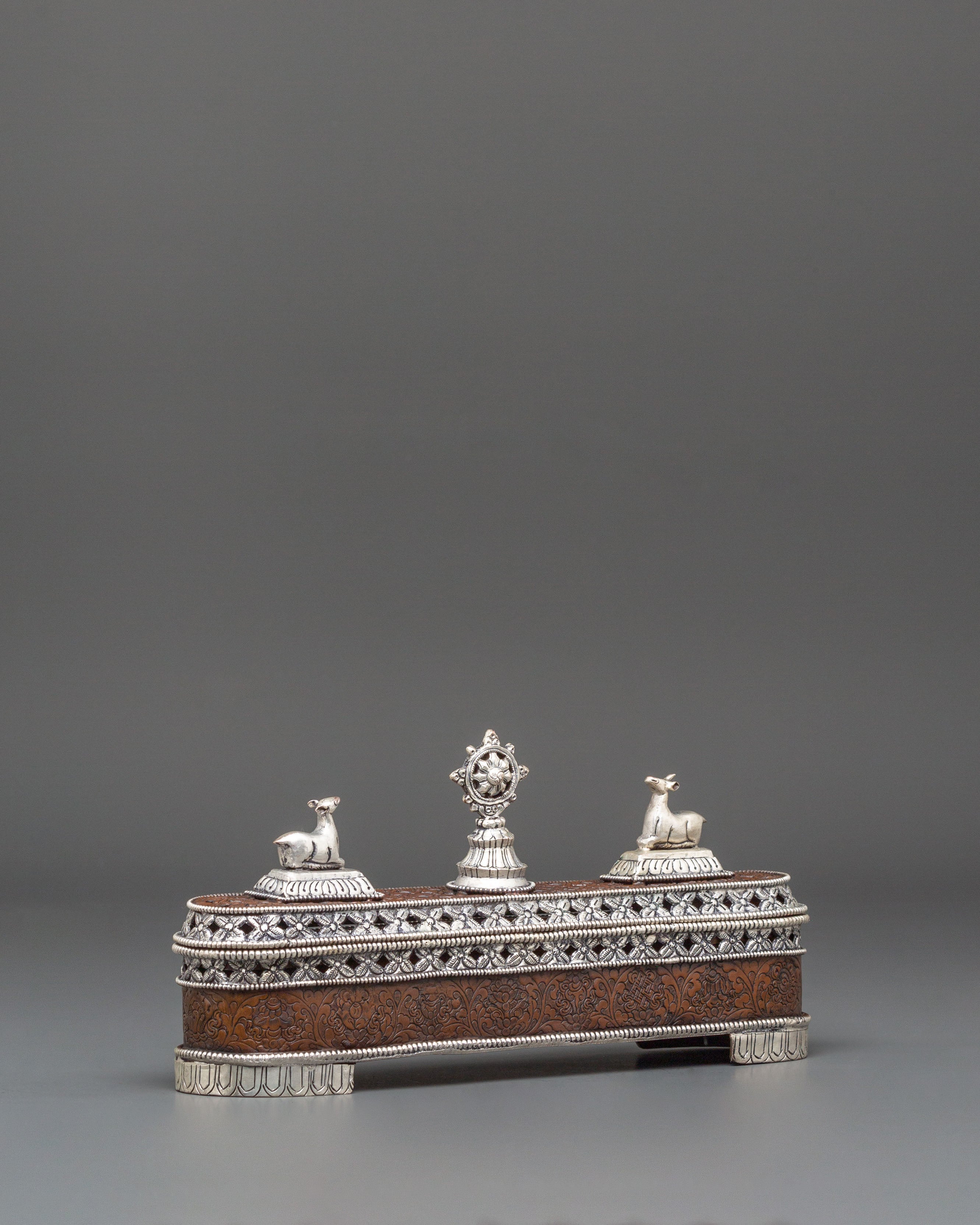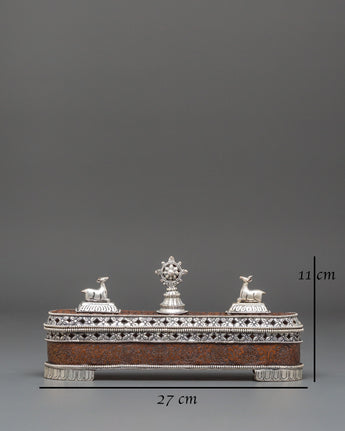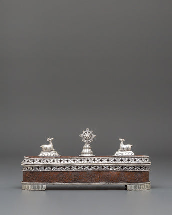 The Handmade Silver-Plated Incense Burner is an excellent example of Tibetan craftsmanship, embodying commitment, artistry, and spiritual meaning. This magnificent burner, made of oxidized copper and silver-plated, features sacred symbols of the Dharma Wheel (Dharmachakra) flanked by two deer, which represent the Buddha's first sermon at Sarnath. It is both a ritual object and a spiritual centerpiece, intended to promote tranquility, mindfulness, and Dharma teachings during meditation and prayer.