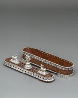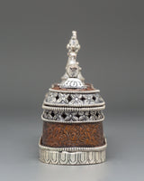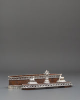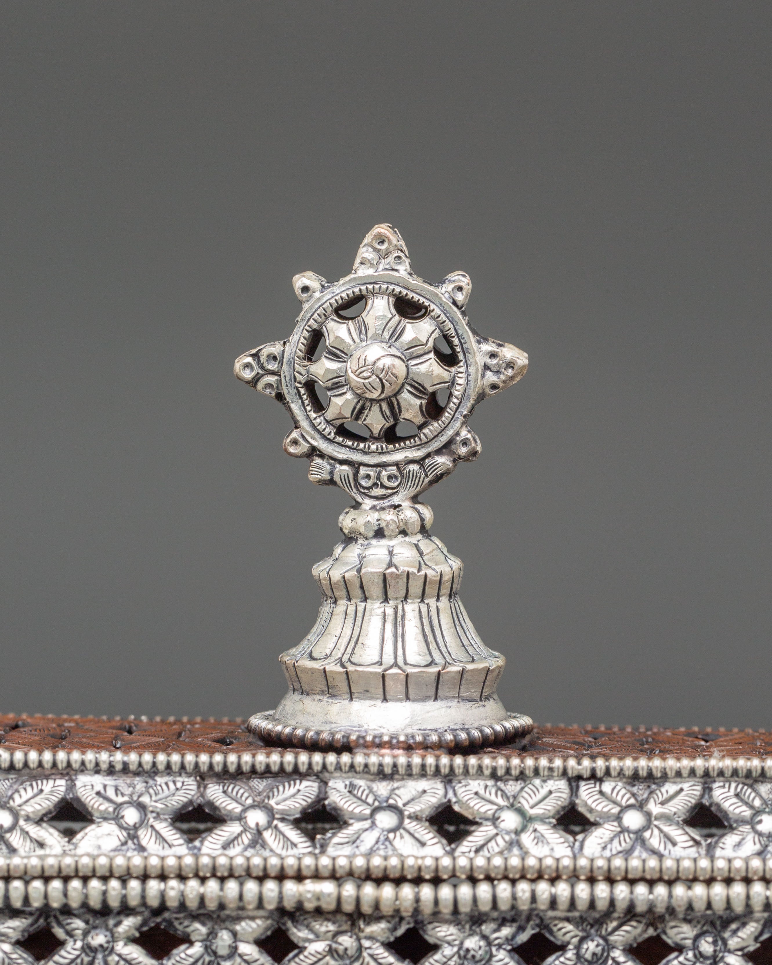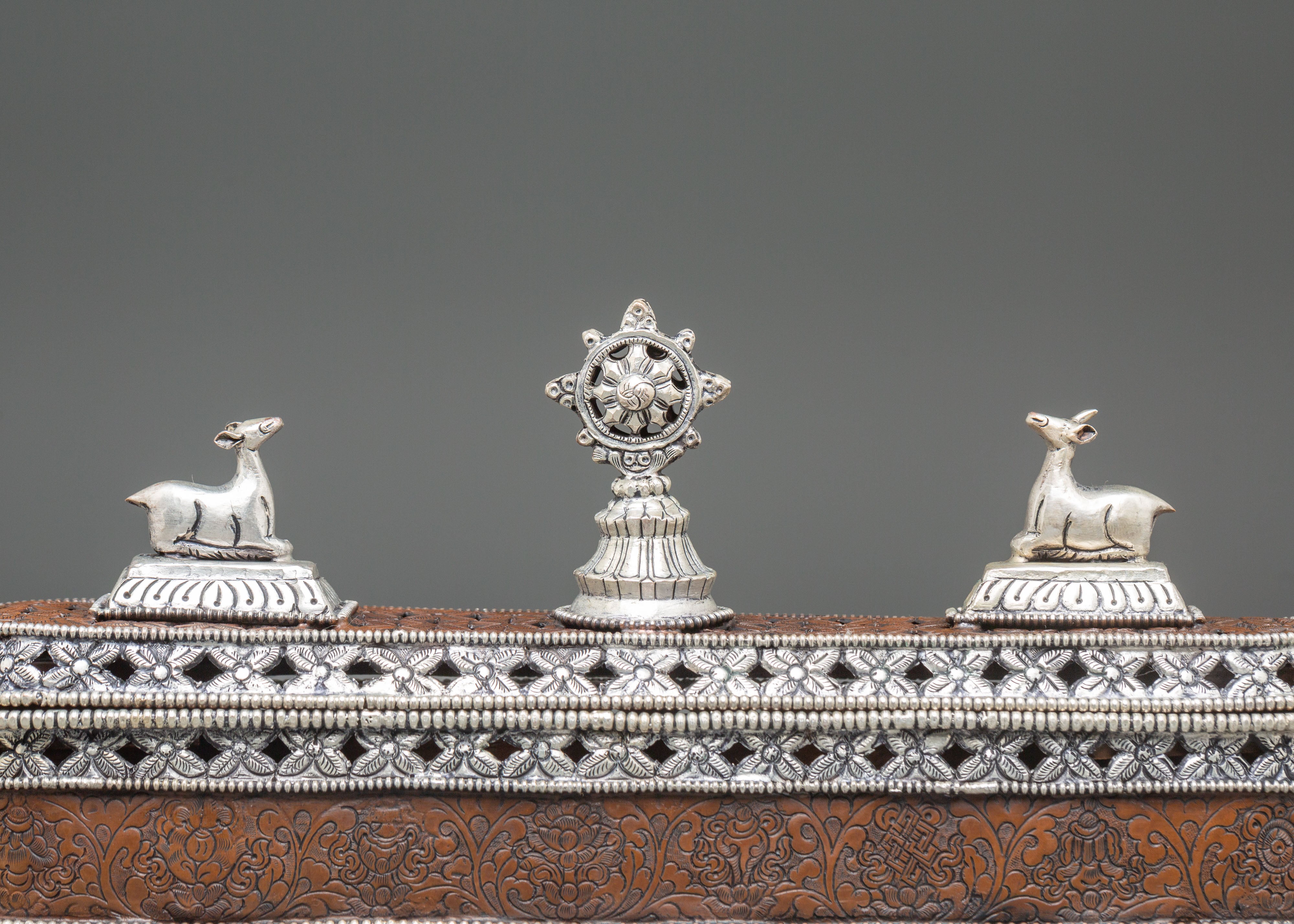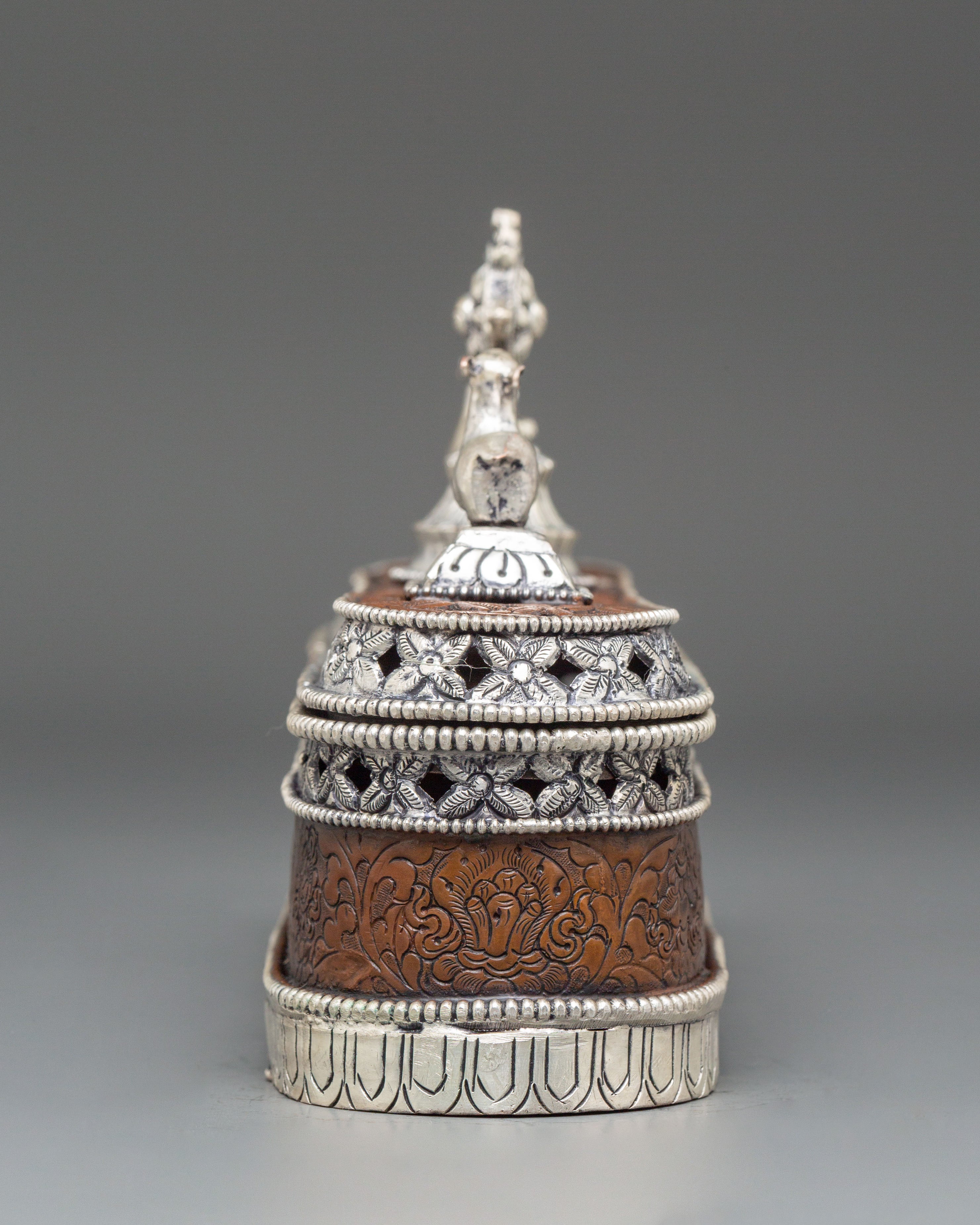 The Handmade Silver-Plated Incense Burner is an excellent example of Tibetan craftsmanship, embodying commitment, artistry, and spiritual meaning. This magnificent burner, made of oxidized copper and silver-plated, features sacred symbols of the Dharma Wheel (Dharmachakra) flanked by two deer, which represent the Buddha's first sermon at Sarnath. It is both a ritual object and a spiritual centerpiece, intended to promote tranquility, mindfulness, and Dharma teachings during meditation and prayer.