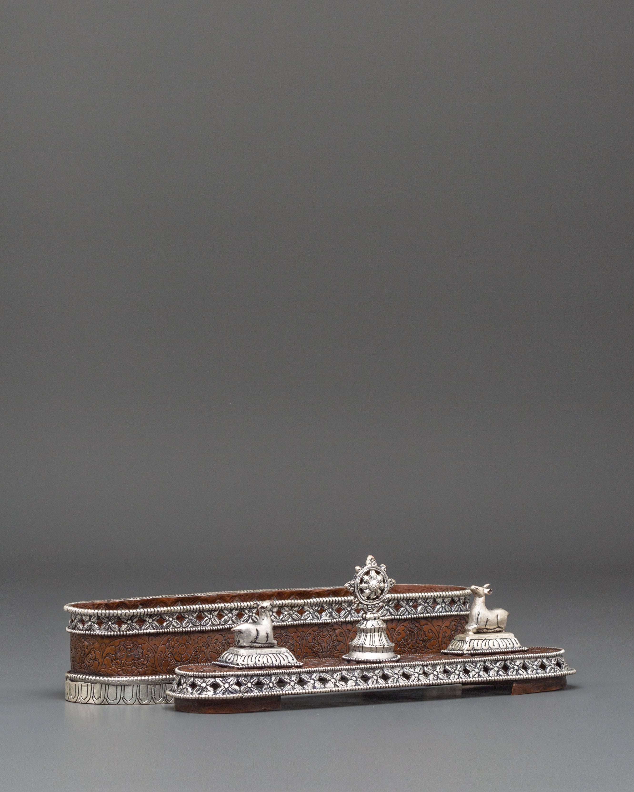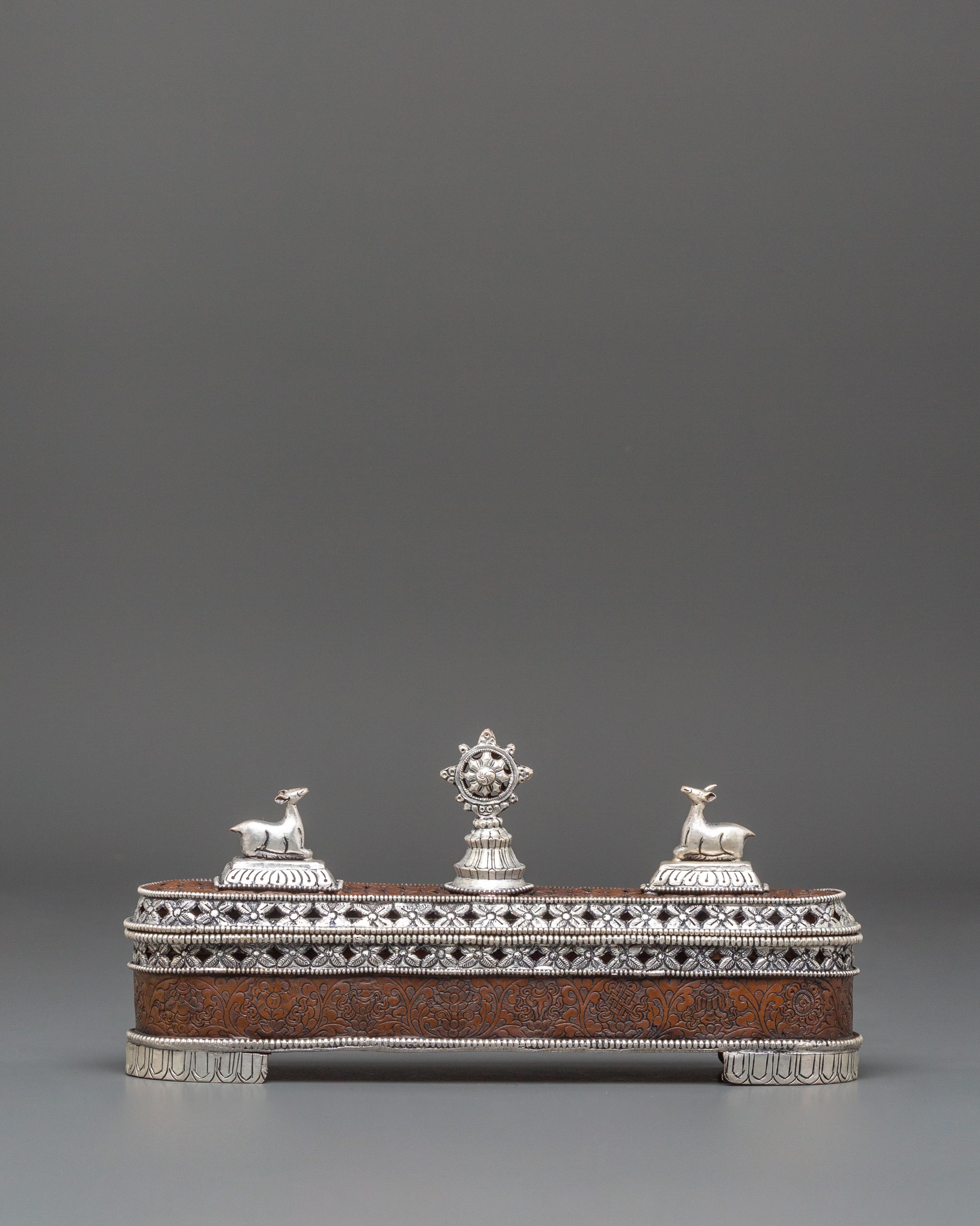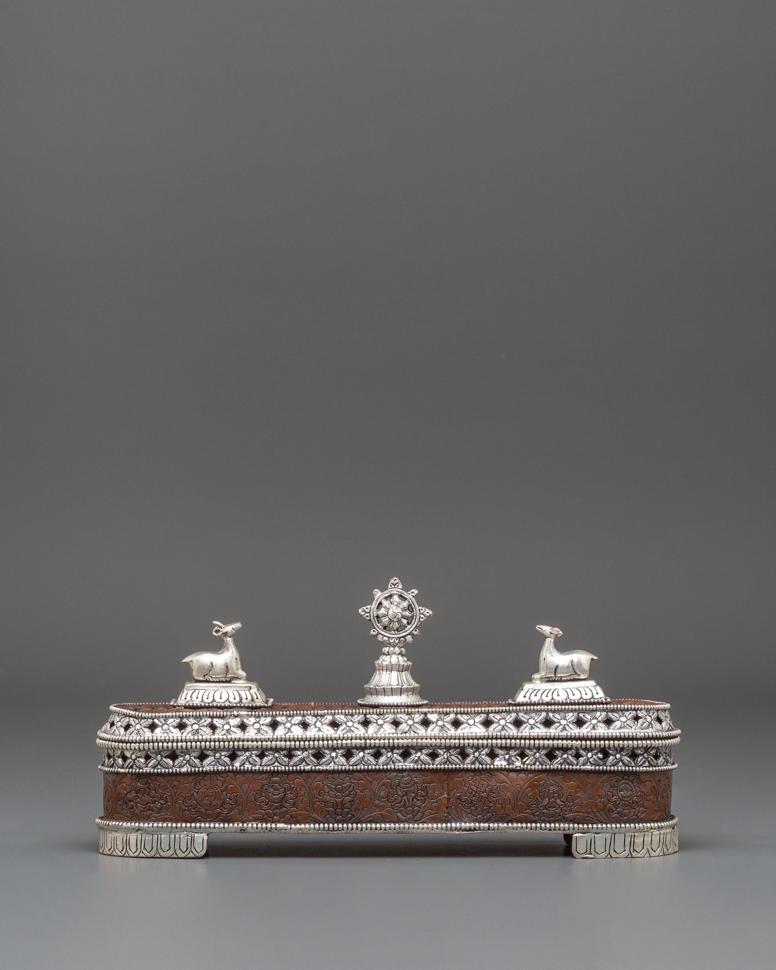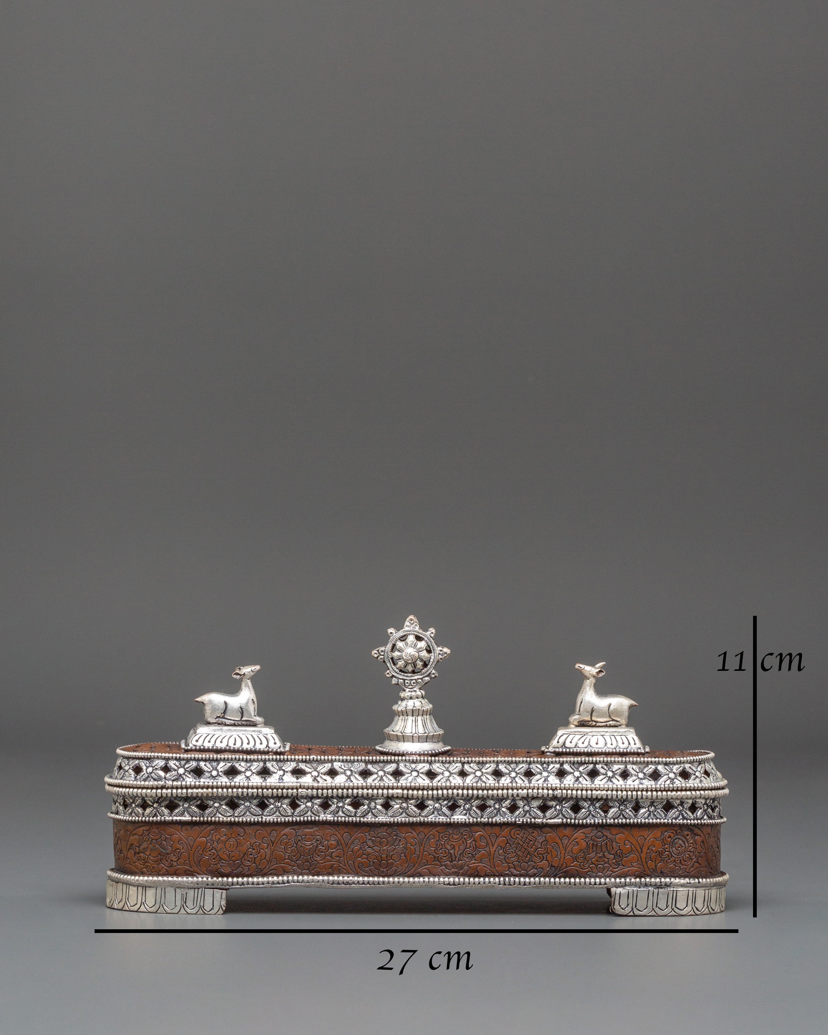 The elaborate workmanship on this burner demonstrates Nepalese artisans' high level of competence. The edges are artistically etched with flower patterns and traditional motifs, and the Dharma Wheel in the center symbolizes the cycle of birth, life, and enlightenment. The deer on each side represent kindness, harmony, and the receptiveness of those who hear the Buddha's teaching. Its silver-plated surface exudes purity and peace, while the oxidized copper base adds antique depth, lending the piece a timeless spiritual presence.