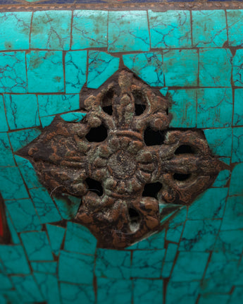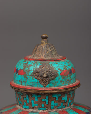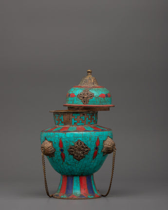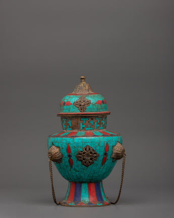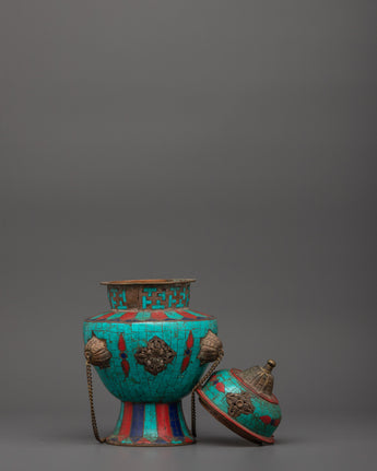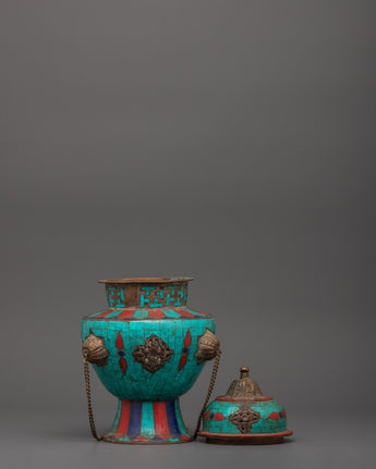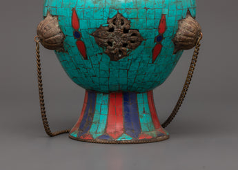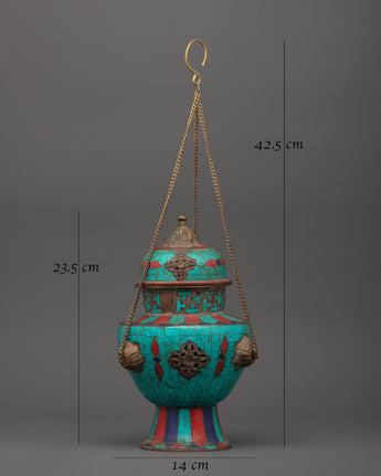With this beautiful handcrafted Tibetan hanging incense burner, a symbol of spiritual dedication and purification, you can lose yourself in the tranquility of Tibetan rituals. In addition to being a helpful incense burner, this carefully crafted copper censer with turquoise and coral inlay is a stunning ornamental addition to your altar, meditation area, or holy space. It weighs 0.84 kg and is 42.5 cm tall with the chain (23.5 cm without), making it lightweight and appropriate for ceremonial use.