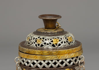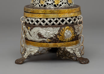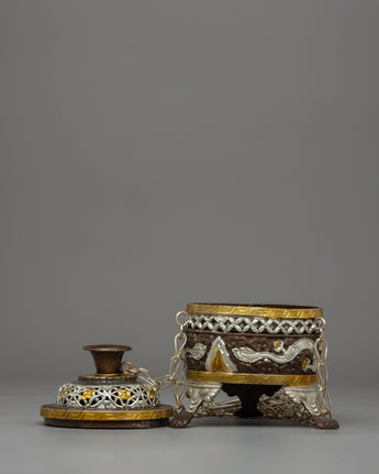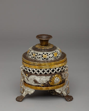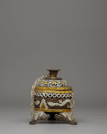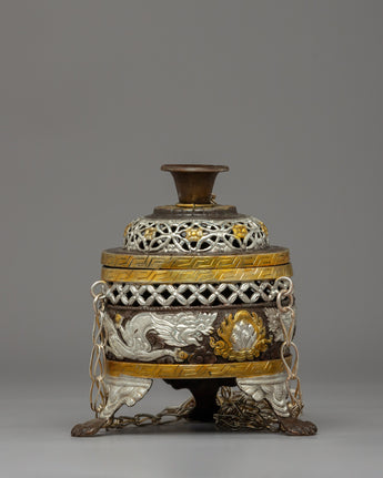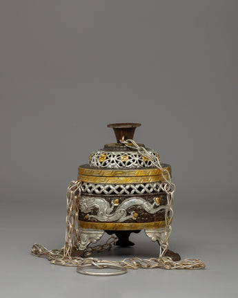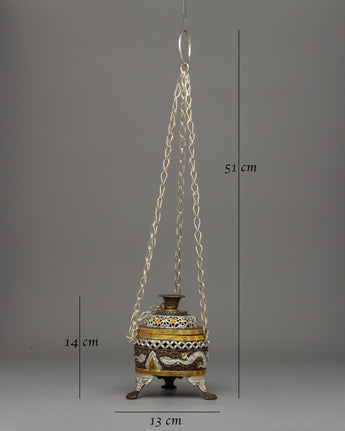 The burner's base is adorned with small, carefully etched motifs that serve as both decorative and symbolic elements, capturing the essence of Buddhist art and ritual. The chain suspends the incense burner, allowing it to hang gracefully while serving a practical purpose. The delicate chains used for hanging are strong, preserving the burner's structure while enhancing its aesthetic by allowing the piece to move freely. This incense burner is ideal for ceremonial use, spiritual spaces, or as a decorative piece, adding beauty and calm to any environment. Its design and attention to detail make it valuable to any collection.