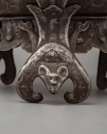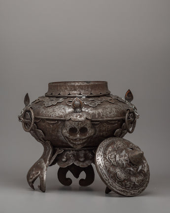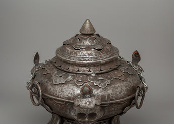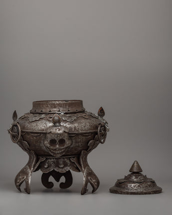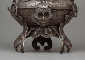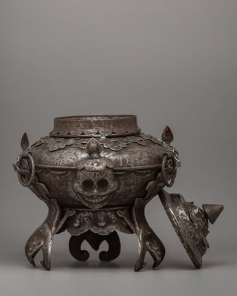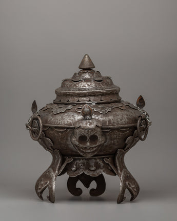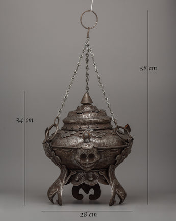This hanging sacred incense burner, made from iron, is 58 cm high, 34 cm wide, and 28 cm in diameter at its base. Its intricate design features skull heads on either side of the central body, adding a significant ritualistic touch to the piece. These skull heads symbolize transformation and impermanence, profoundly connecting the burner to spiritual practices centered around mortality and the afterlife. The body is beautifully adorned with floral carvings, adding elegance to the otherwise bold, symbolic structure.