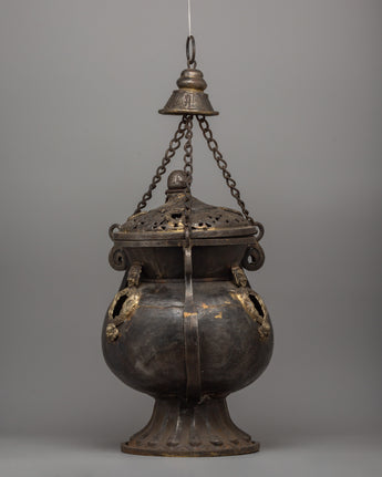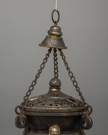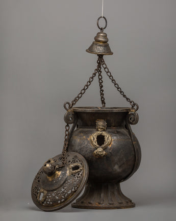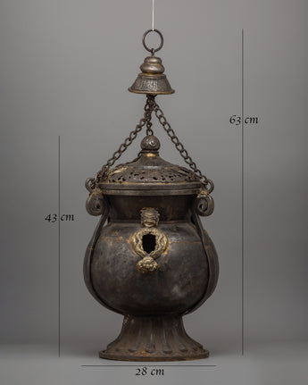 The Himalayan incense burner, made of iron, stands at 63 cm in height and 28 cm in width. It is designed to be hung, featuring an elegant bell-shaped craft at the top that secures the hanging chains, making it ideal for ceremonial or altar use. The intricate design of the burner is complemented by floral carvings decorating the body, enhancing its visual appeal and adding a sense of refinement and sacredness to the object.