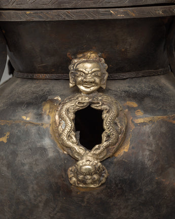 At the center of the burner is a deity’s head, representing divine energy and protection. This striking feature is surrounded by delicate engravings, with a hole below the deity to allow the incense smoke to escape as it burns. The design also incorporates two dragons, one on each side, potent symbols of protection and guardianship in many cultures. These dragons wrap around the central hole of the burner, adding a dynamic and mythical appearance while symbolizing strength and spiritual guidance. The kirtimukha at the bottom of the burner adds an extra layer of mystique, with a face that signifies protection from evil spirits.