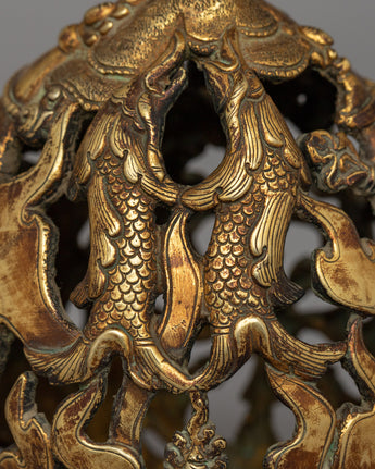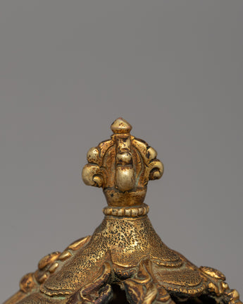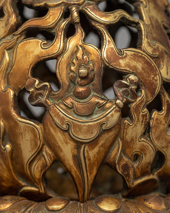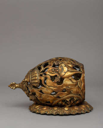 Crafted by skilled artisans, this Buddhist incense burner features intricate detailing that reflects the sacred importance of incense offerings in Buddhist traditions. The act of burning incense represents purity, mindfulness, and the connection between the physical and spiritual worlds. This ritual accessory is both a functional tool and a work of art that symbolizes devotion and spiritual harmony. This ornate gold-plated incense burner, ideal for personal meditation, temple use, or as a one-of-a-kind gift for practitioners, will enhance any sacred space.