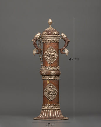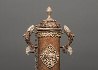 This Incense Burner Set is a stunning and valuable addition to any spiritual or meditation environment. Each incense holder stands 42 cm tall with a 17 cm base and is meticulously carved from copper and polished with silver, giving it a sacred spiritual appeal. This set's fish-carved handles are unique features, with exquisitely etched fish designs representing wealth, change, and energy flow in spiritual activities. Weighing 3.644 kg, it has a commanding presence, and the chain detail adds an extra dimension of elegance, making it suitable for display in a designated ceremonial area.