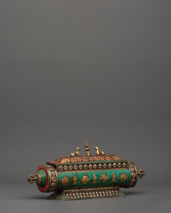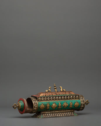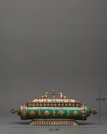 Designed to enhance your prayers and meditations, the guardian lions represent strength, protection, and courage, making this incense burner essential for everyone practicing Tibetan Buddhism or appreciating sacred rituals. The turquoise provides a touch of elegance, representing peace and innocence. The Buddhist symbols added to decorate the gorgeous cover contribute to the spiritual spirit surrounding you. This one-of-a-kind artwork is ideal for burning incense during meditation and prayer or to create a serene environment in your house.