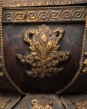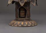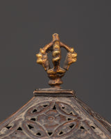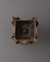 This handcrafted copper and brass Incense Burner with a prayer wheel is 27.5cm tall and has an integrated prayer wheel, adding to its spiritual significance. The 0.66 kg weight ensures stability during use, while the 12 cm width provides ample space for incense placement. This piece serves as both a practical ritual tool and an elegant addition to meditation spaces or altars.