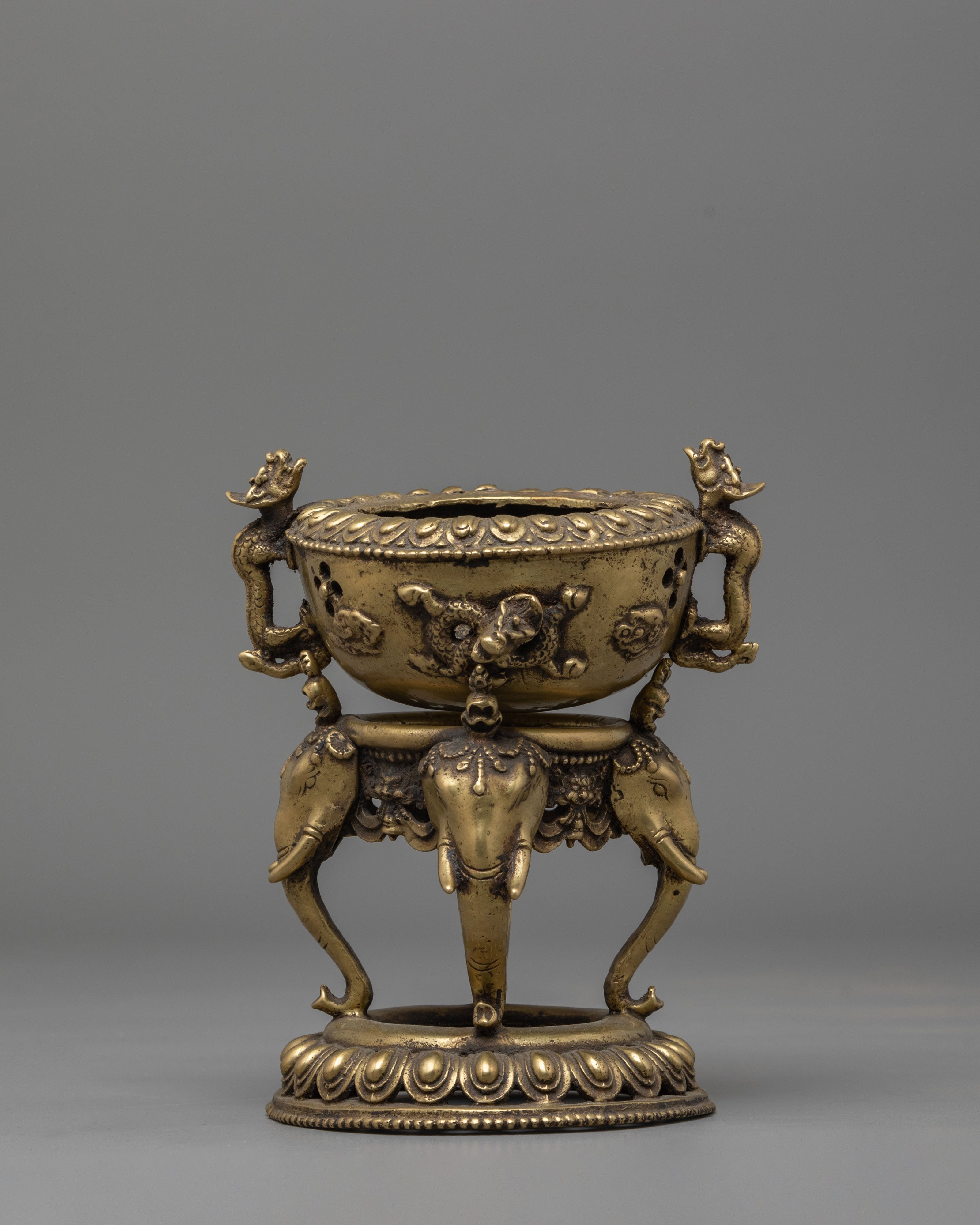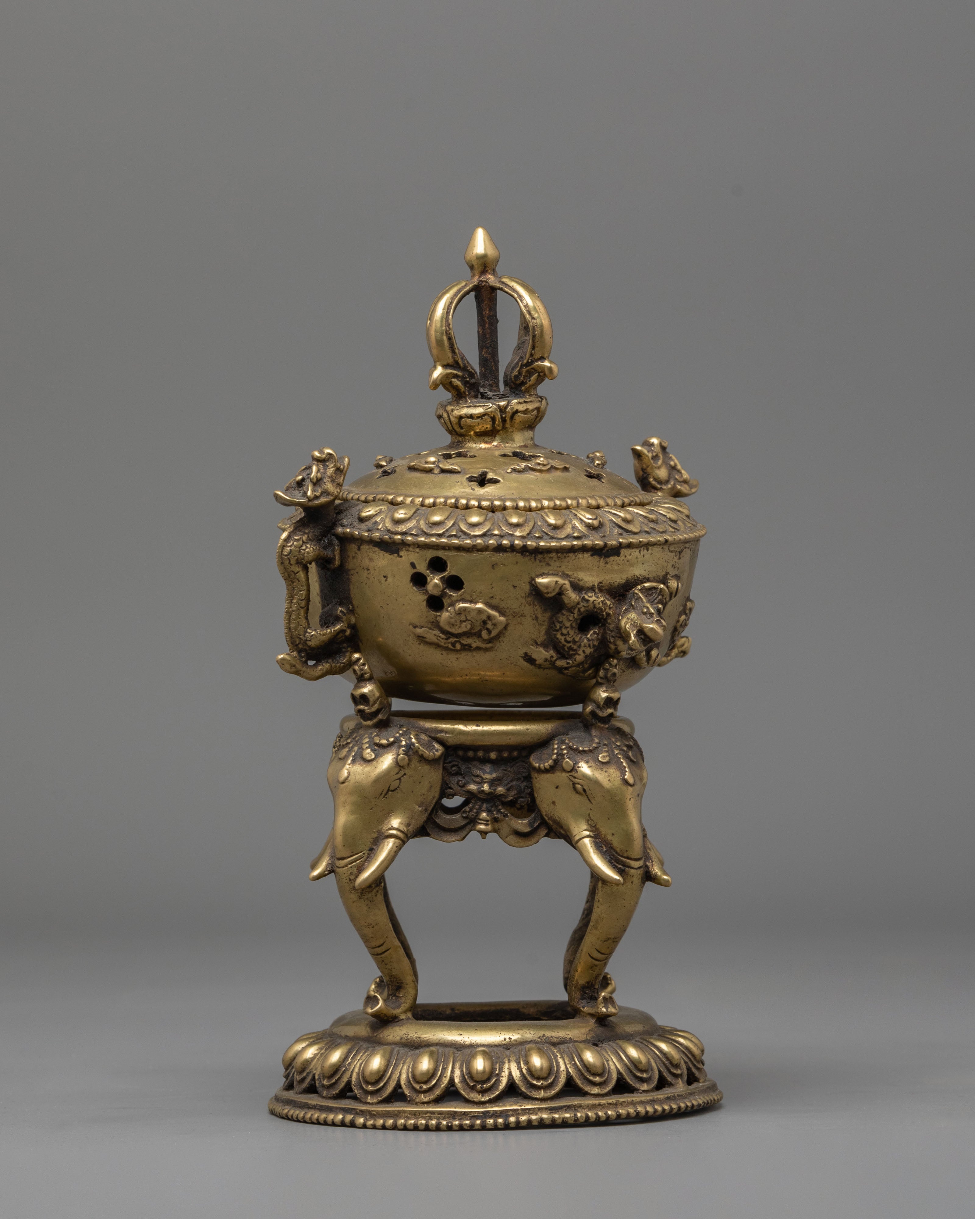 Three wonderfully sculpted elephant statues support the stand and represent power, wisdom, and stability, all of which are key values in both Buddhist and Hindu traditions. The sides of the censer have exquisite floral engravings and dragon images that reflect change and the purity of one's ideals. The perforated lid lets incense smoke rise smoothly, infusing your room with a relaxing aroma that promotes spiritual focus and mindfulness activities.