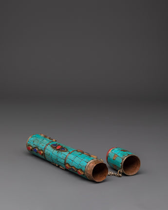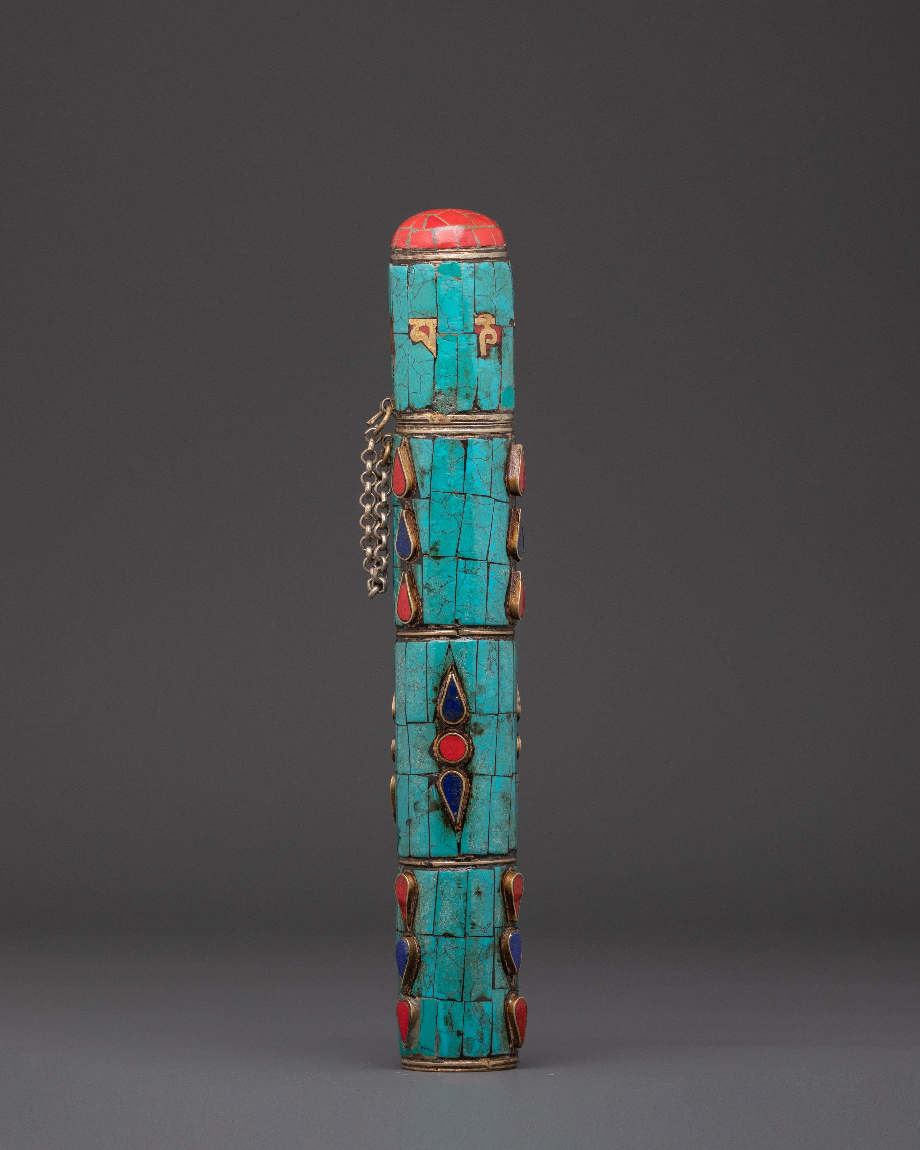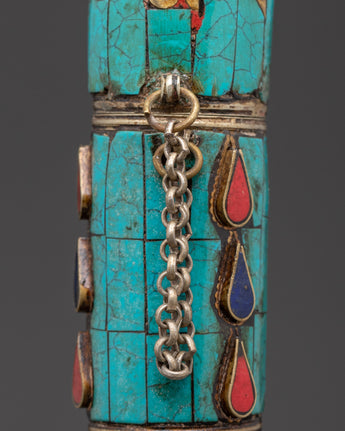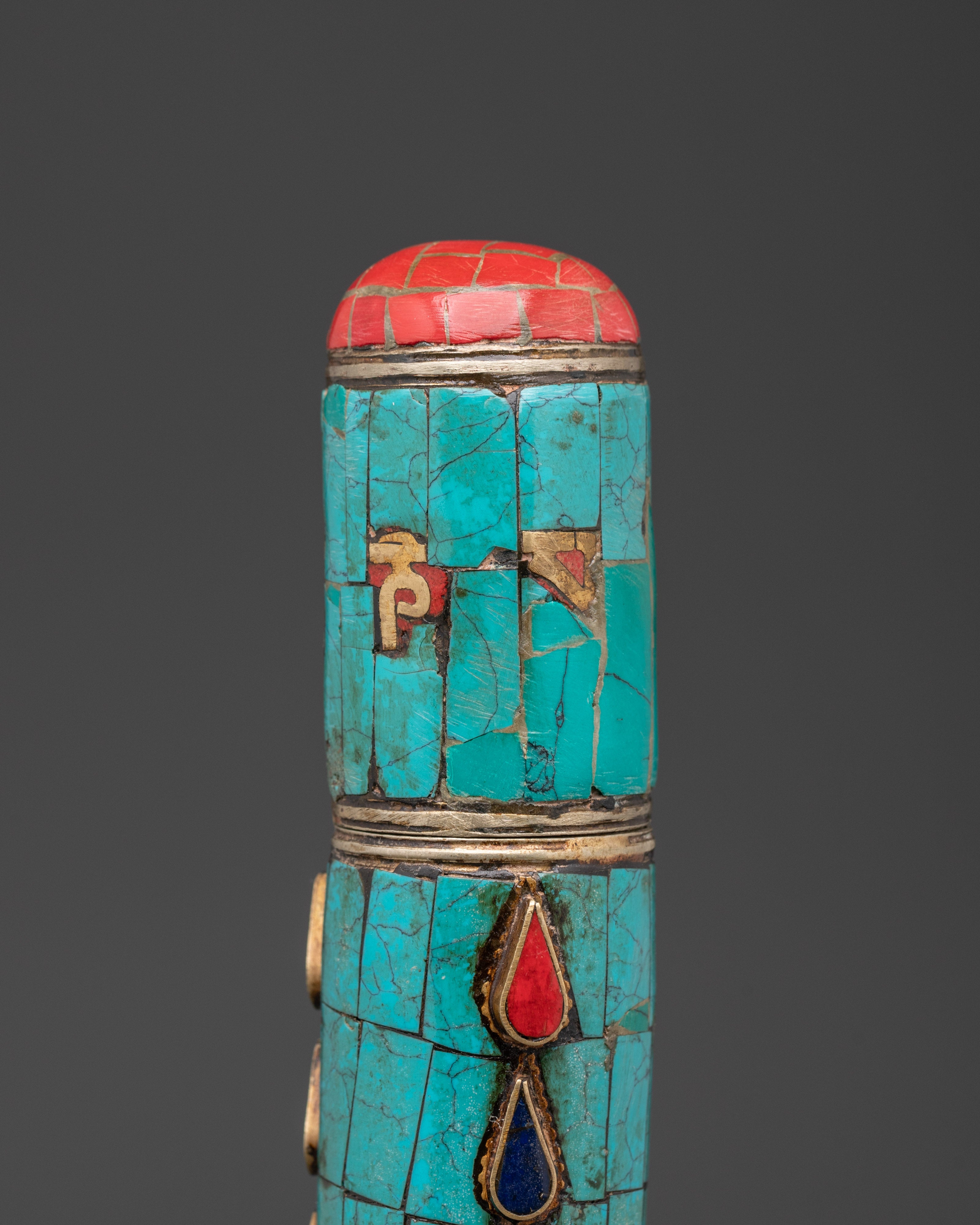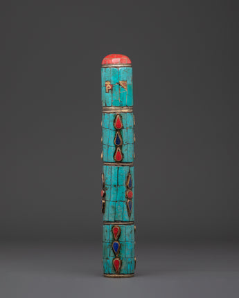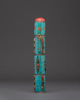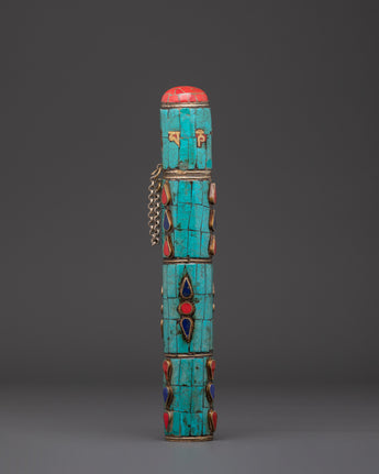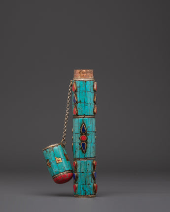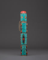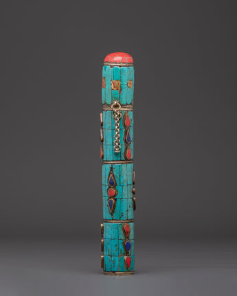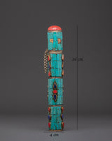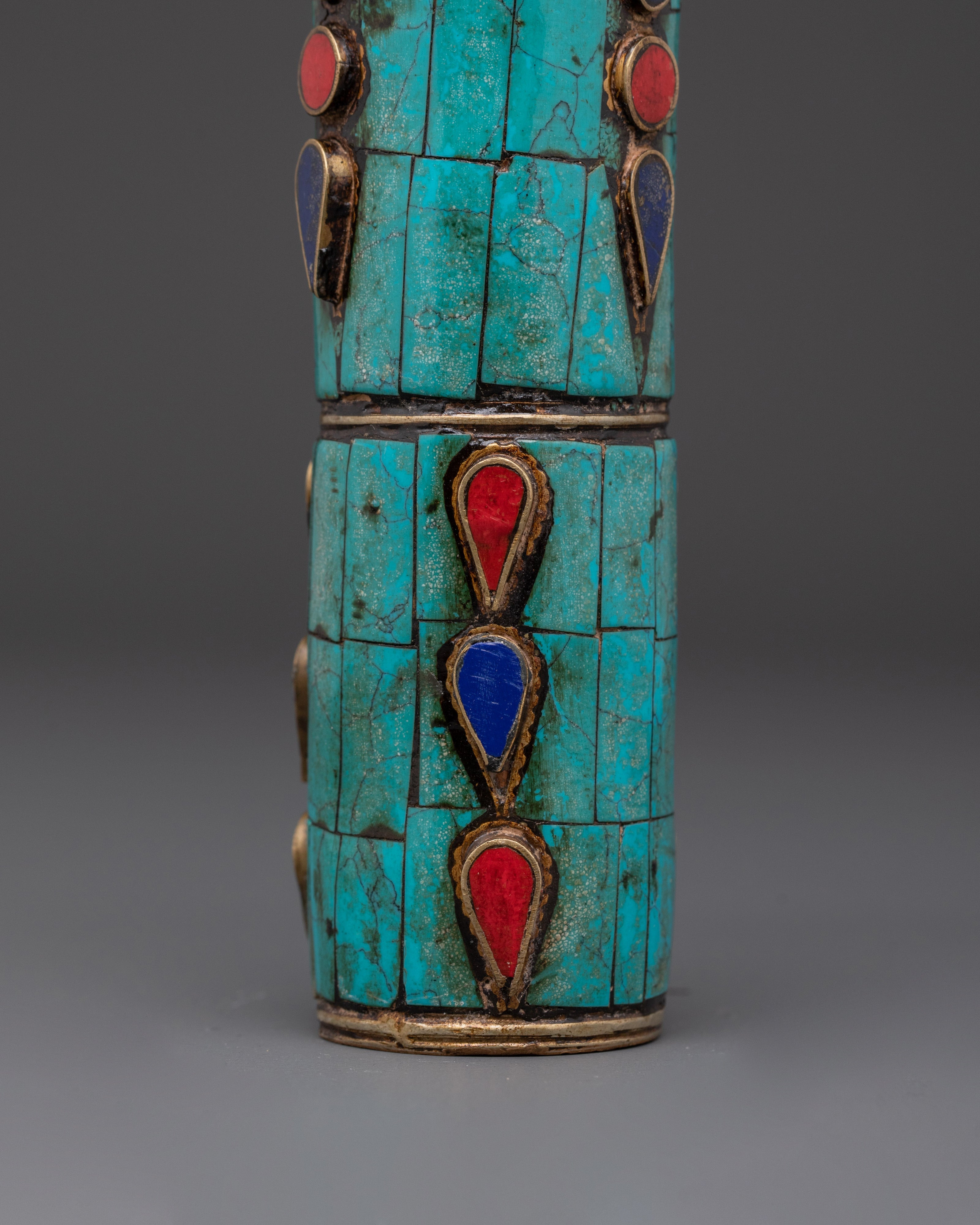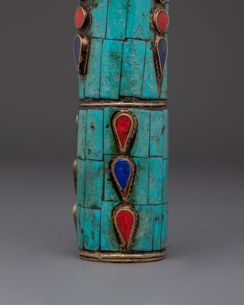 This Himalayan Buddhist Incense Burner is a beautifully handcrafted ritual piece designed to inspire serenity, mindfulness, and devotion. Measuring 26cm in height and 4cm in width with a weight of 0.22kg, it’s elegantly balanced to hold incense during meditation or prayer. Made from brass and copper, and adorned with artificial lapis lazuli, turquoise, and coral stones, it radiates spiritual energy while adding a sacred aesthetic to your altar or meditation space. Each material symbolizes divine elements—lapis for wisdom, turquoise for healing, and coral for compassion—bringing harmony and balance to your surroundings.