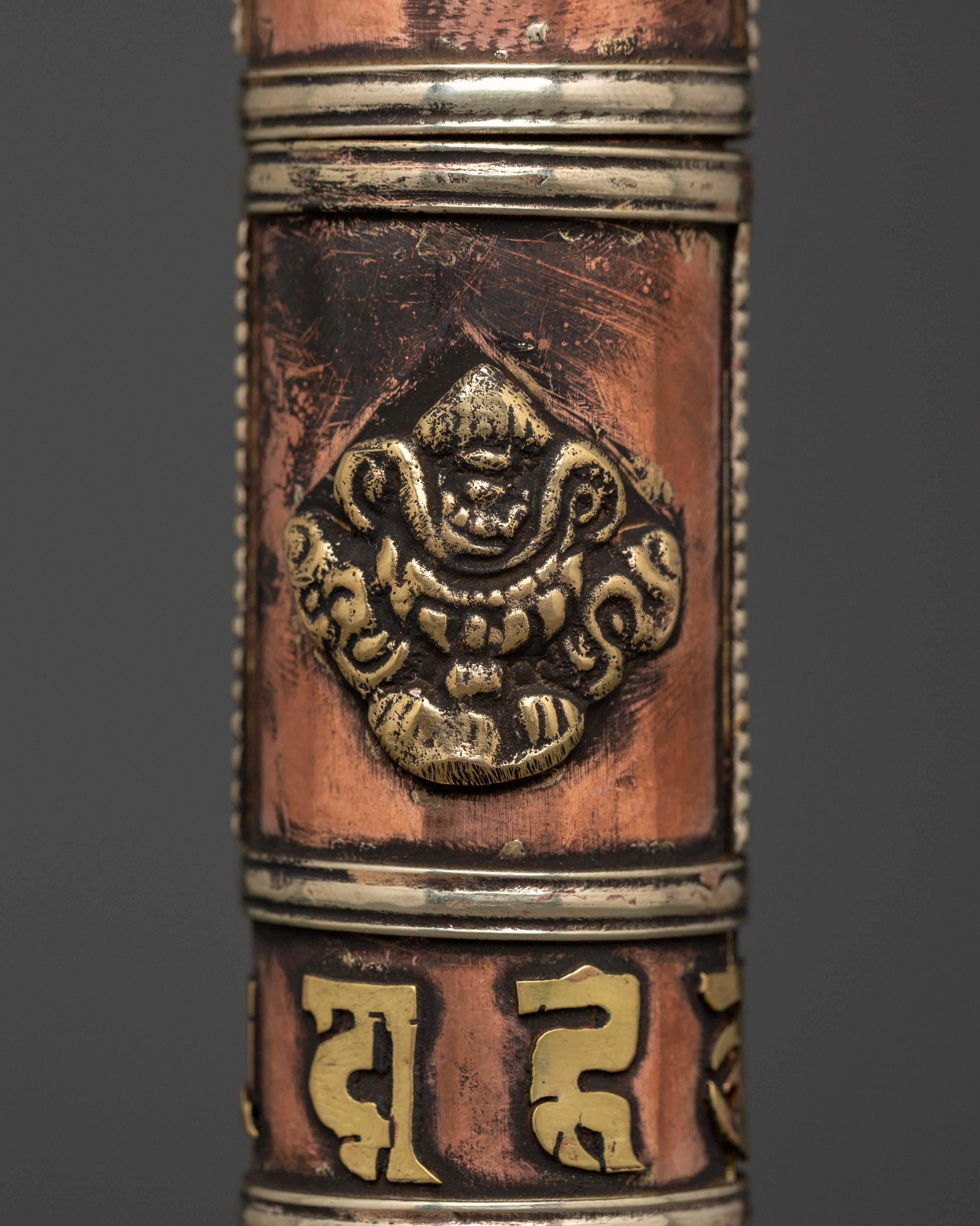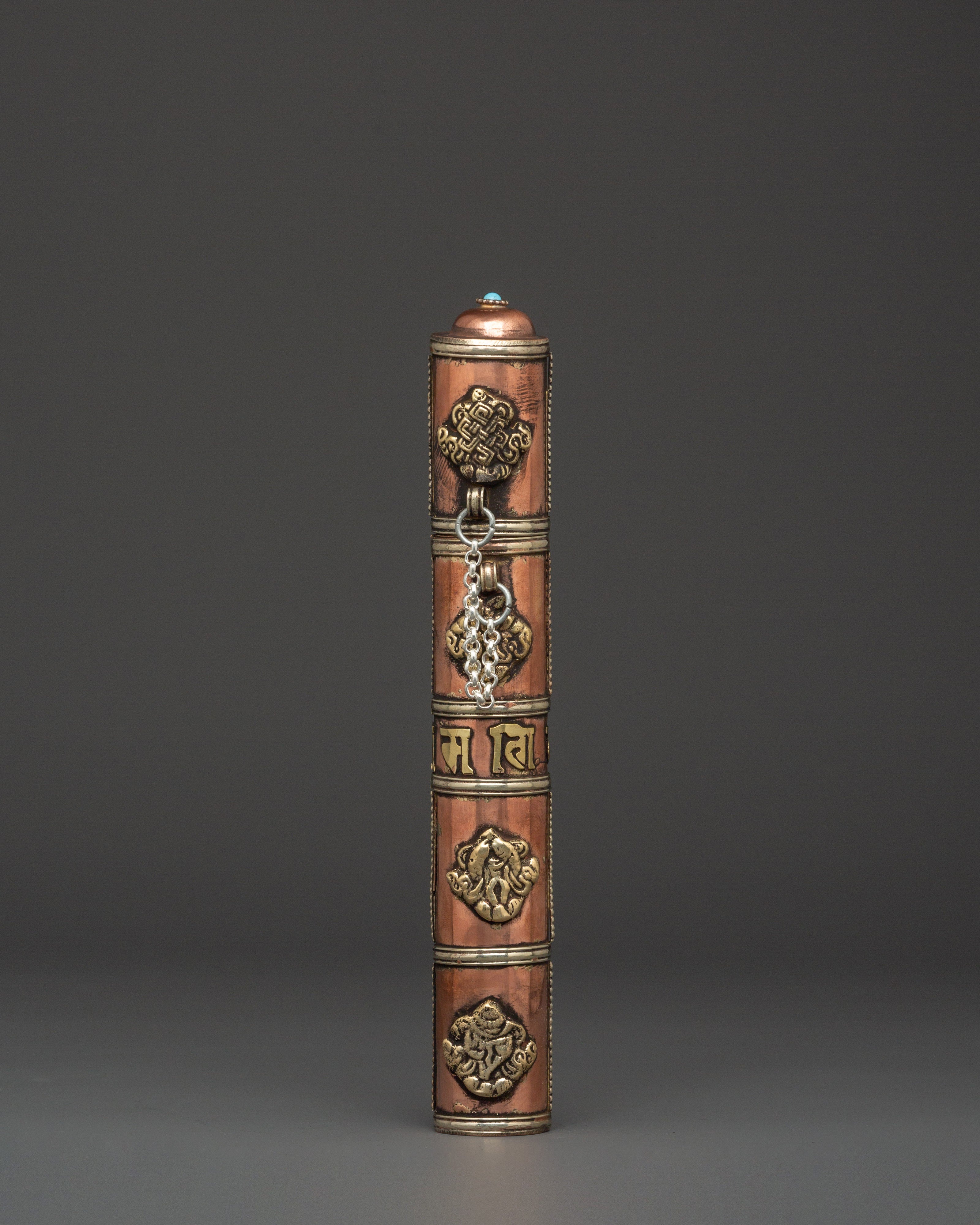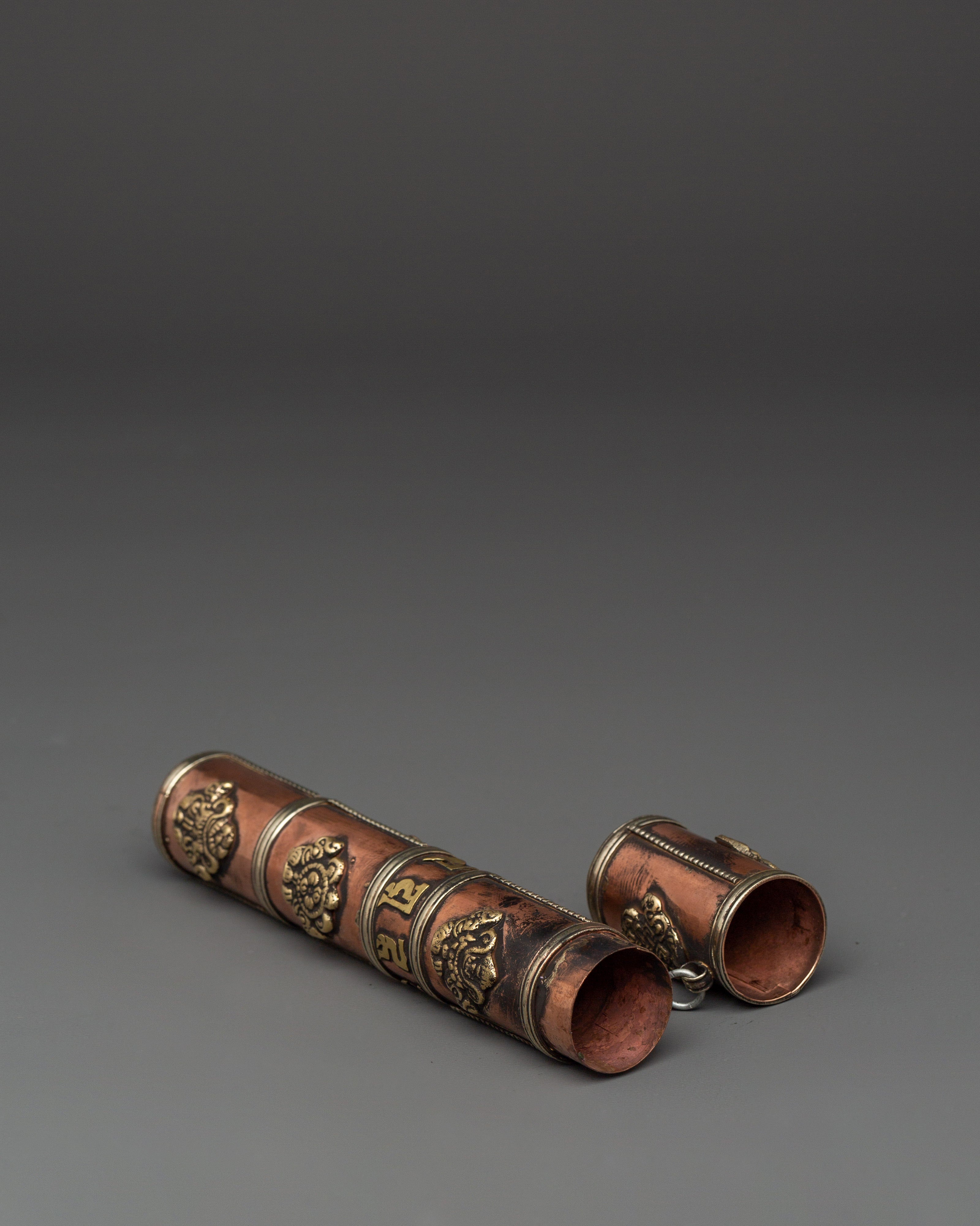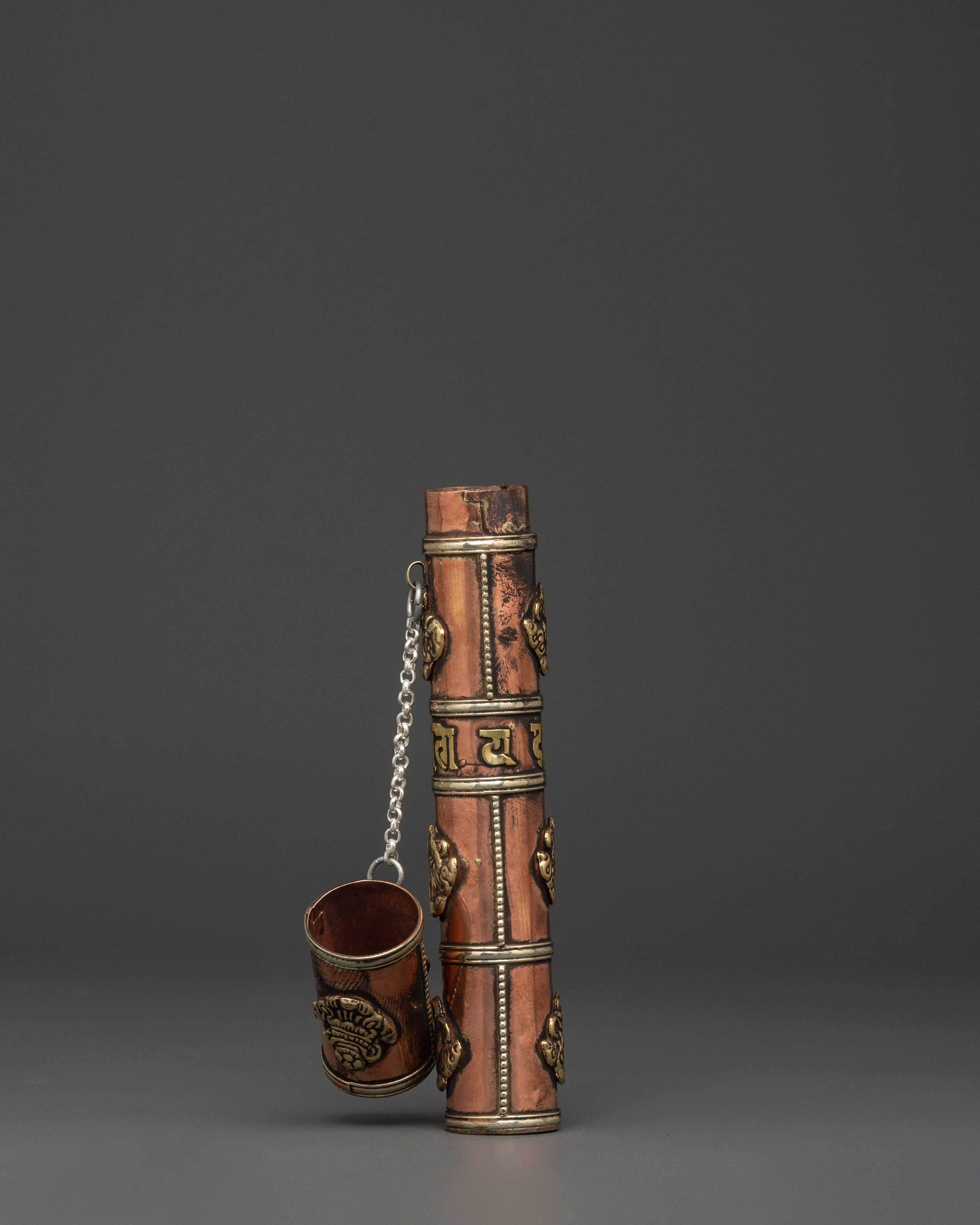 This Tibetan incense holder is ideal for keeping and burning stick incense at home, while traveling, or as part of your regular meditation routine. The clear brass decorations and copper finish add to its appearance, making it functional and decorative for your altar or spiritual place. Its compact and portable form makes it simple to transport, allowing you to continue your spiritual practice wherever you go. This incense container is a valuable addition to any collection, whether as a personal decoration or a present for a fellow practitioner.