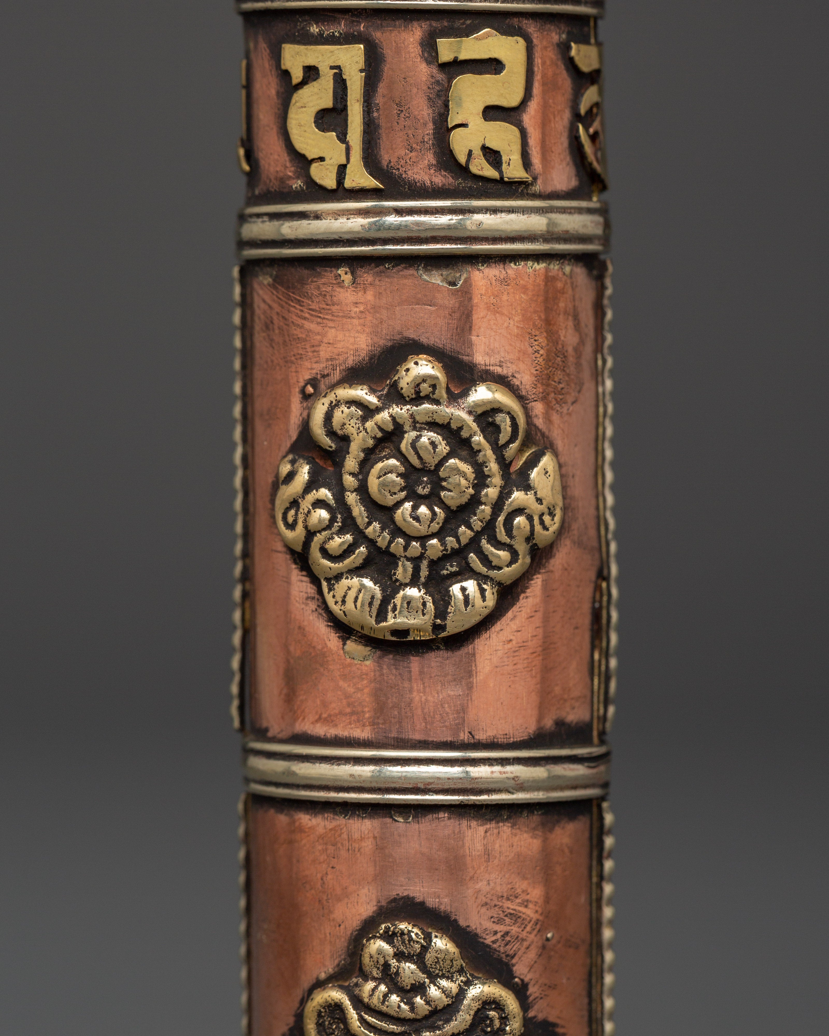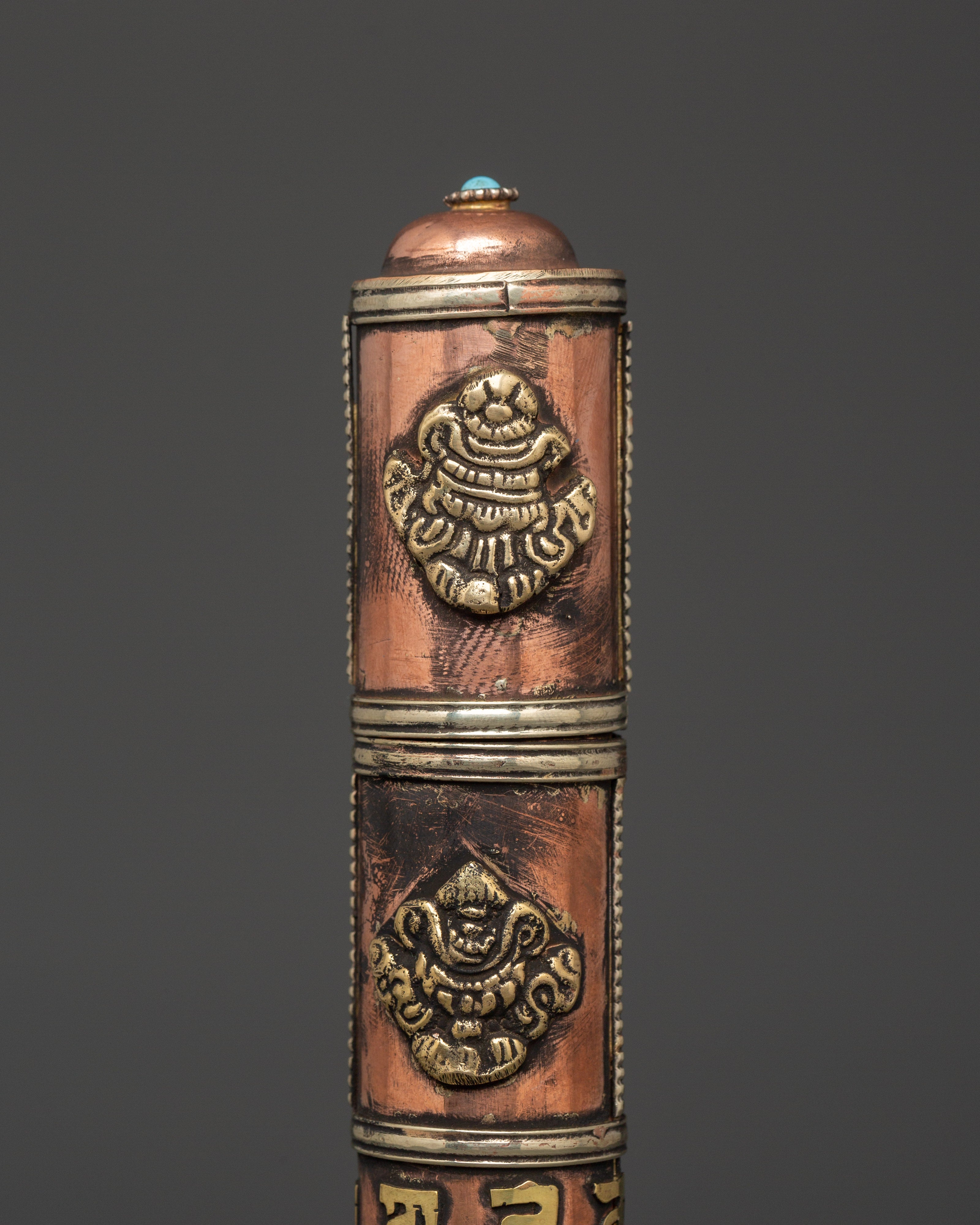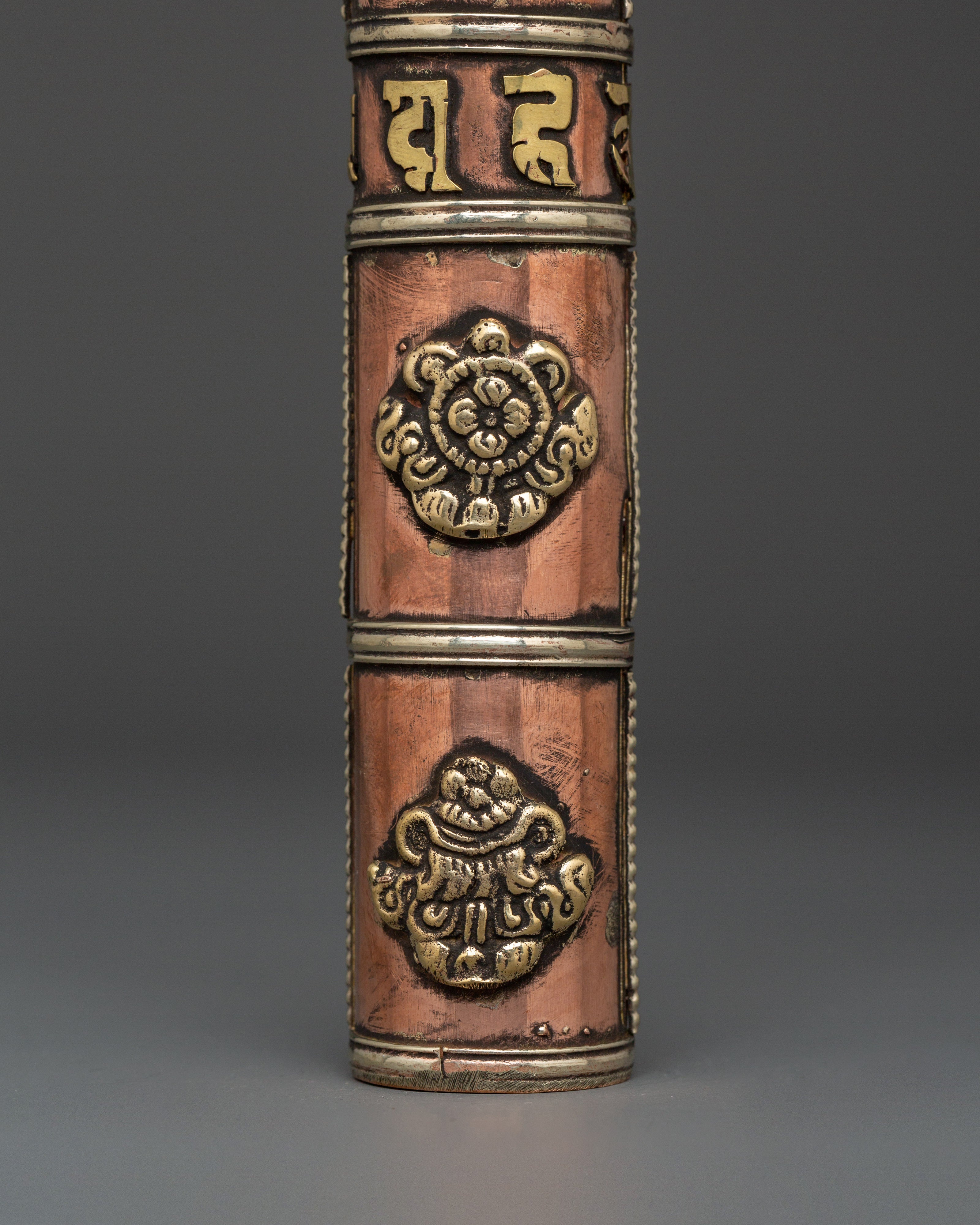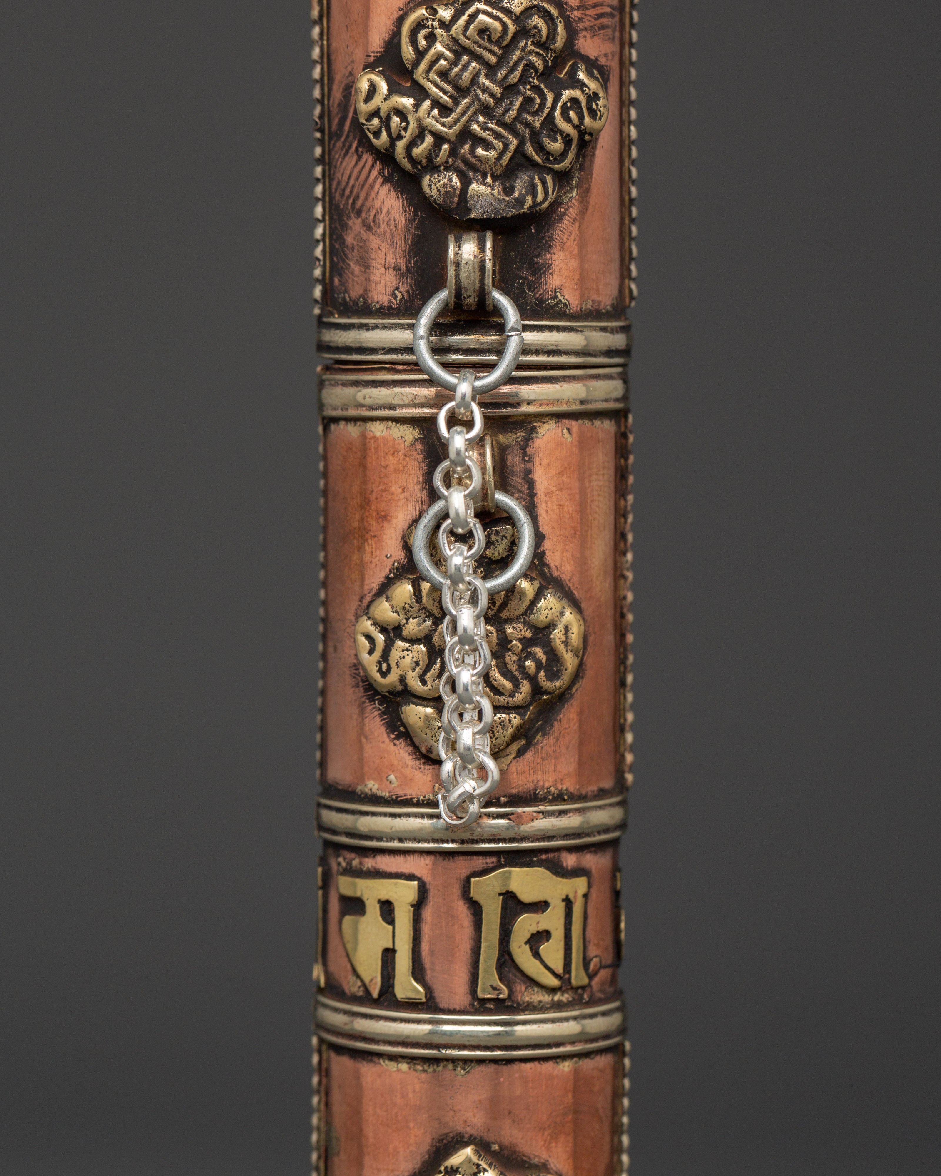 This Tibetan incense holder is ideal for keeping and burning stick incense at home, while traveling, or as part of your regular meditation routine. The clear brass decorations and copper finish add to its appearance, making it functional and decorative for your altar or spiritual place. Its compact and portable form makes it simple to transport, allowing you to continue your spiritual practice wherever you go. This incense container is a valuable addition to any collection, whether as a personal decoration or a present for a fellow practitioner.