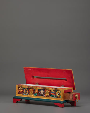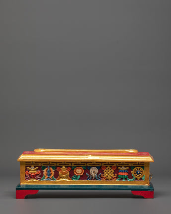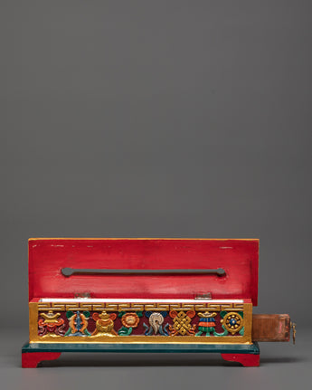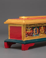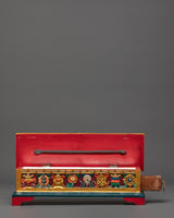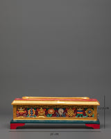 The Tibetan Buddhist Incense Burner measures 12.5cm in height and 36cm in width, weighing 0.98kg. Crafted from wood and finished with vibrant acrylic colors, this incense burner is designed to bring sacred energy and tranquility to meditation spaces, altars, or spiritual corners. Its elongated design allows for multiple incense sticks, providing a calming aroma that enhances mindfulness, focus, and spiritual practice. The intricate detailing reflects traditional Tibetan Buddhist symbolism, making it both a functional and meaningful addition to any sacred space.